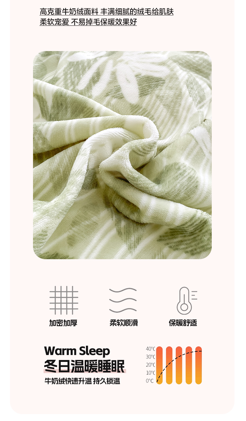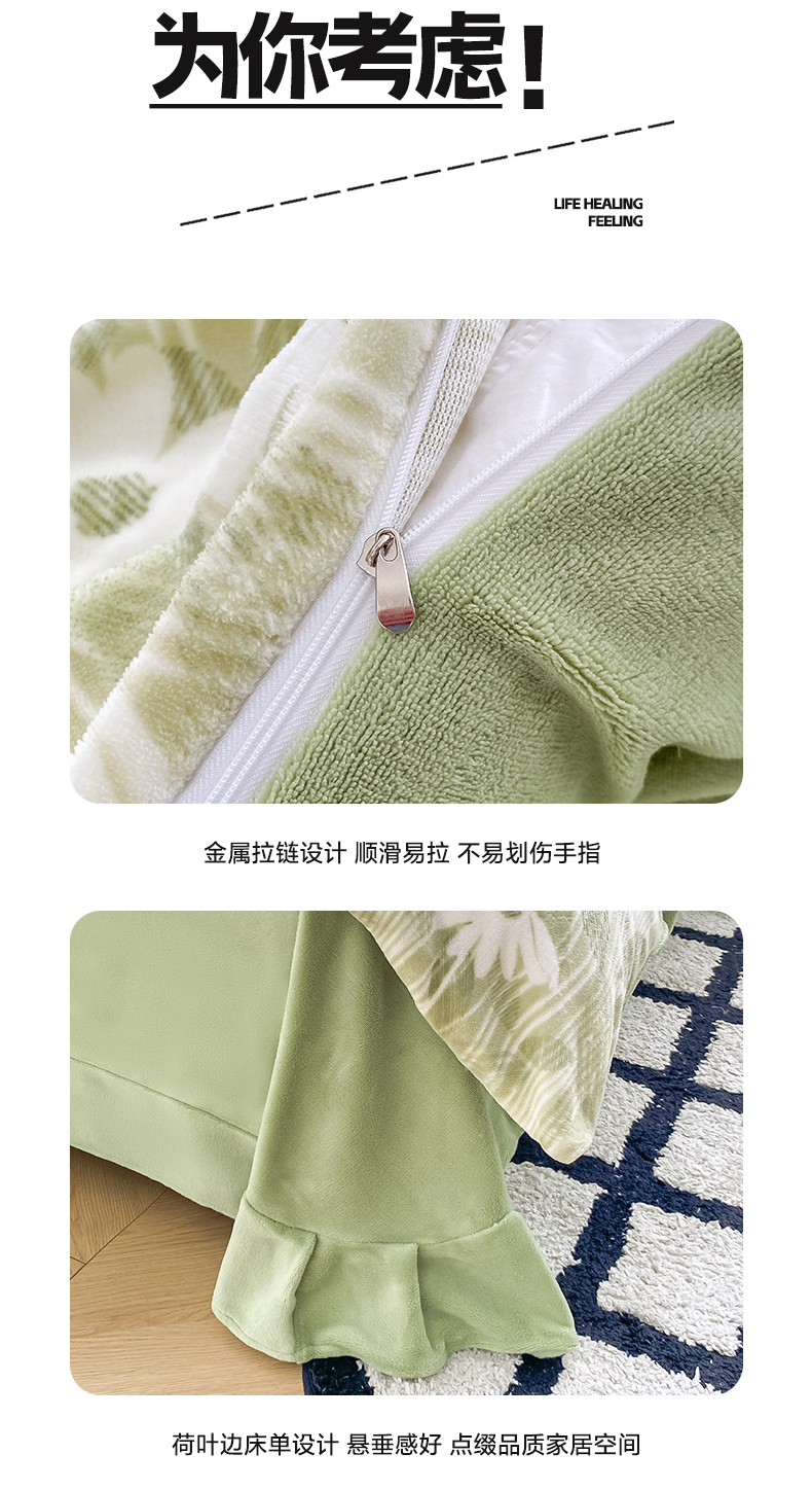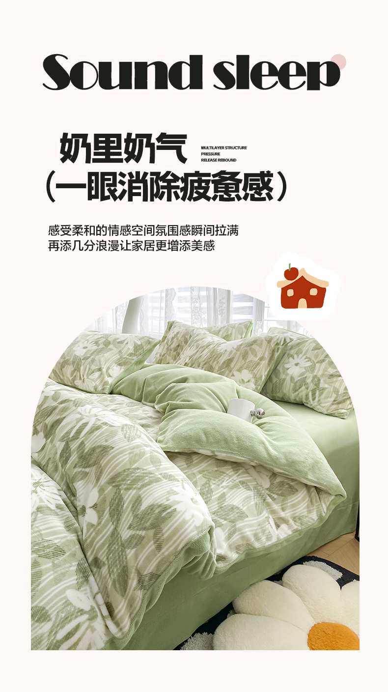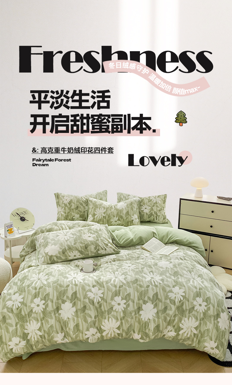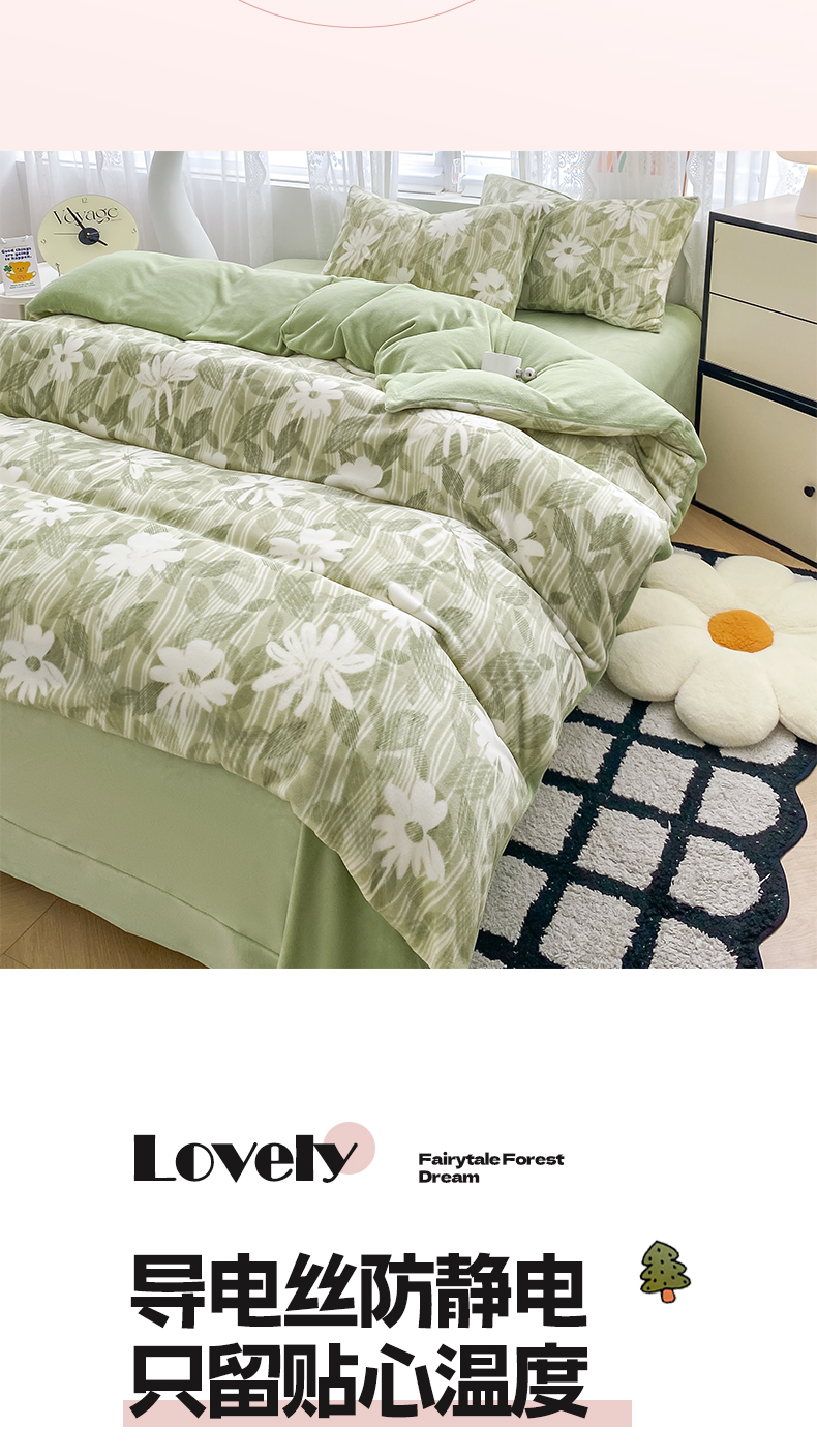 商品名称:帅露家纺 2024新款高克重牛奶绒印花四件套 霜叶-绿