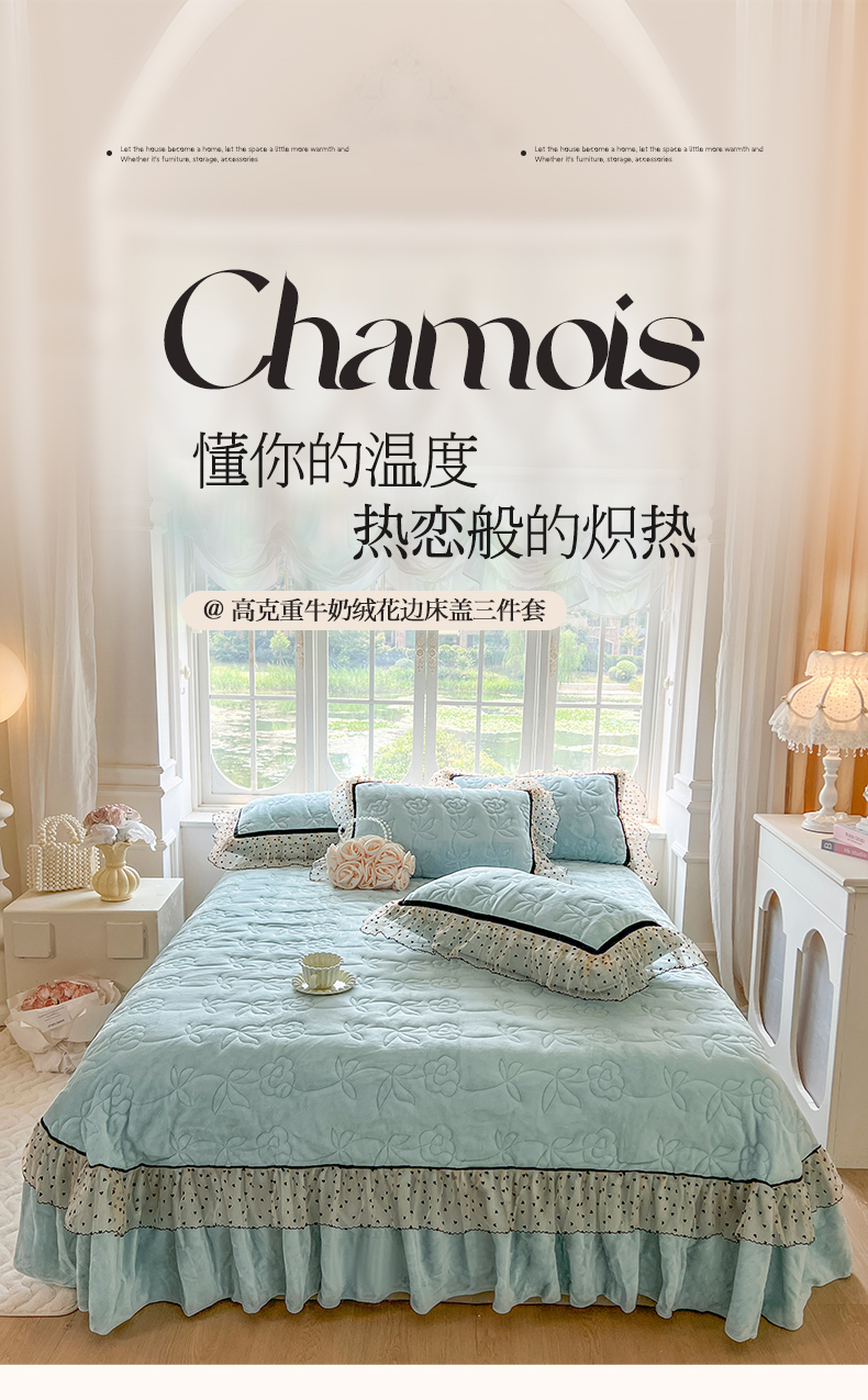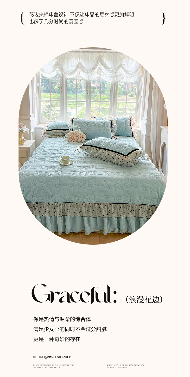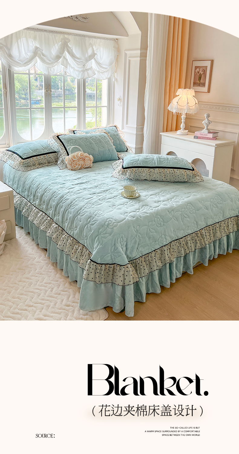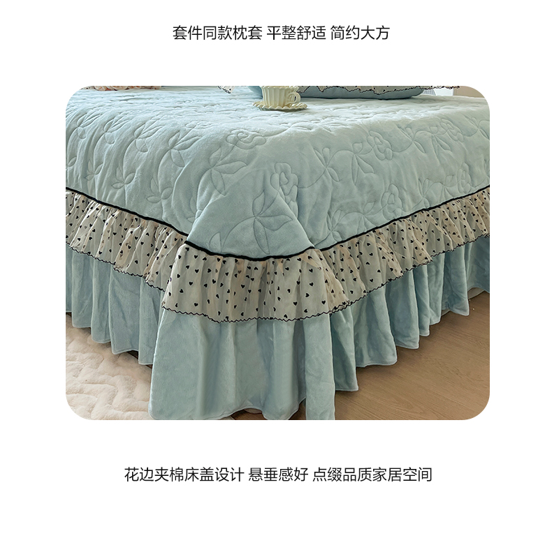 网红馆(ck家纺) 2025新款牛奶绒花边床盖三件套-诺蔓 诺蔓-天水绿