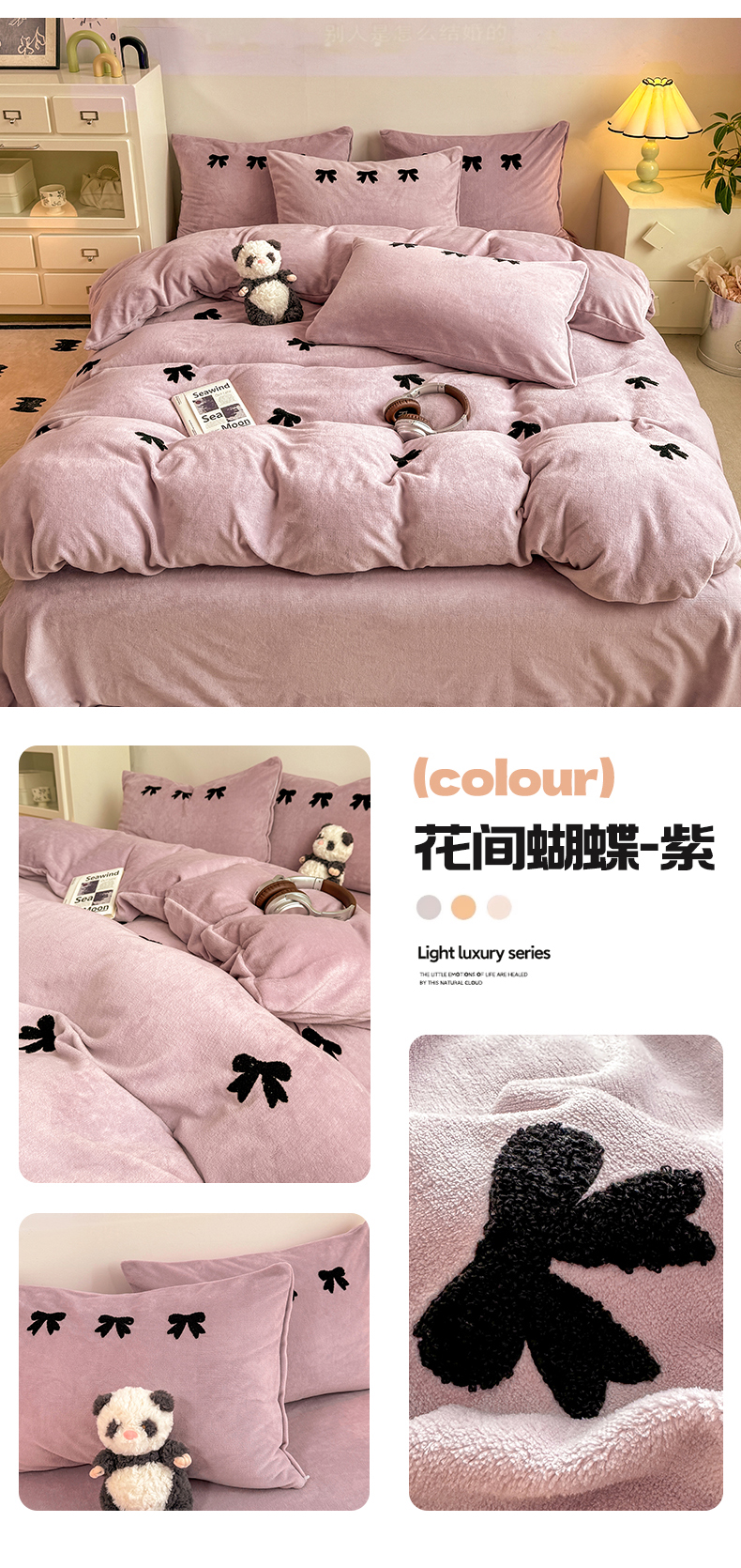 首尔家纺 2024新款牛奶绒卡通毛巾绣蝴蝶结系列四件套 花间蝴蝶-紫