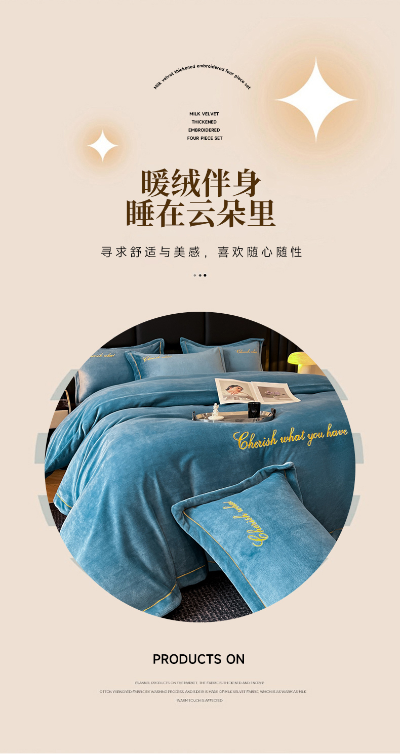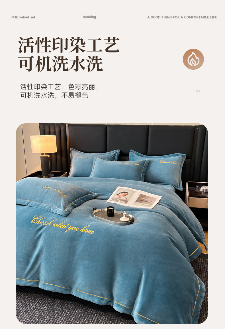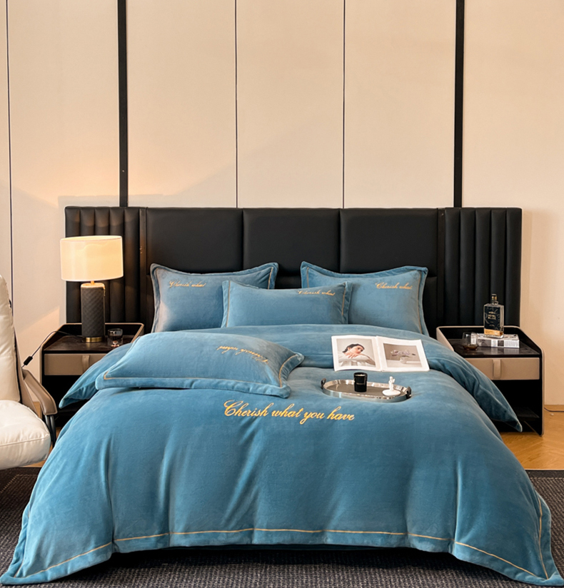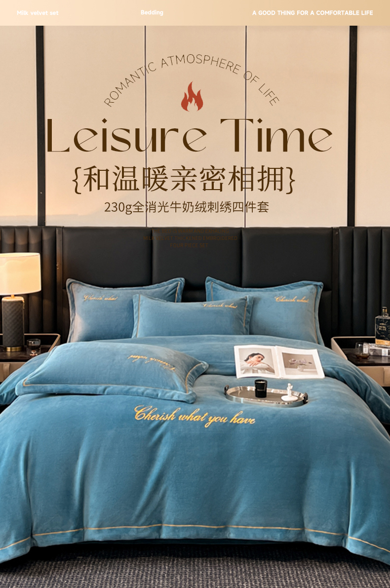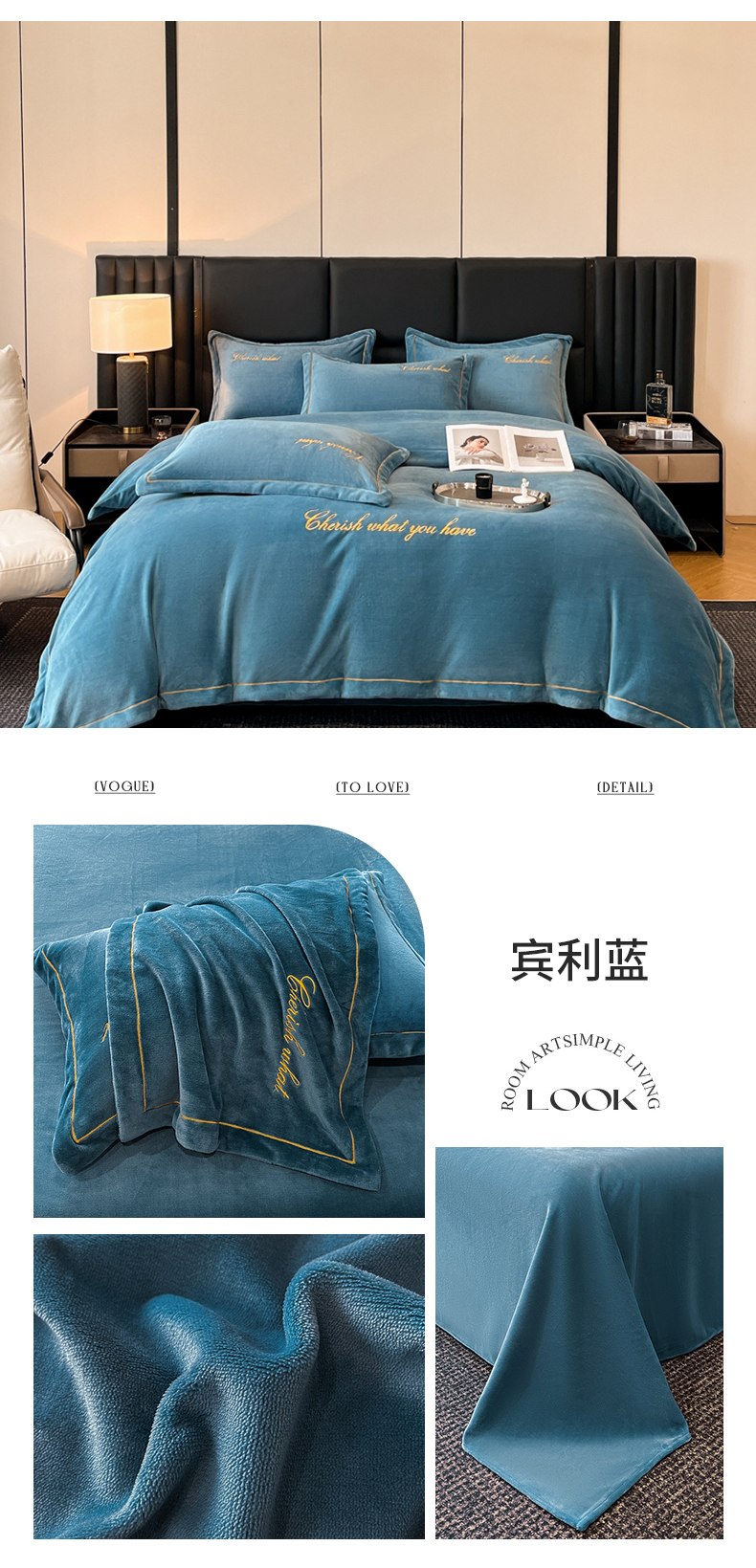鸿织源家纺 2025新款230g全消光牛奶绒刺绣四件套 宾利蓝