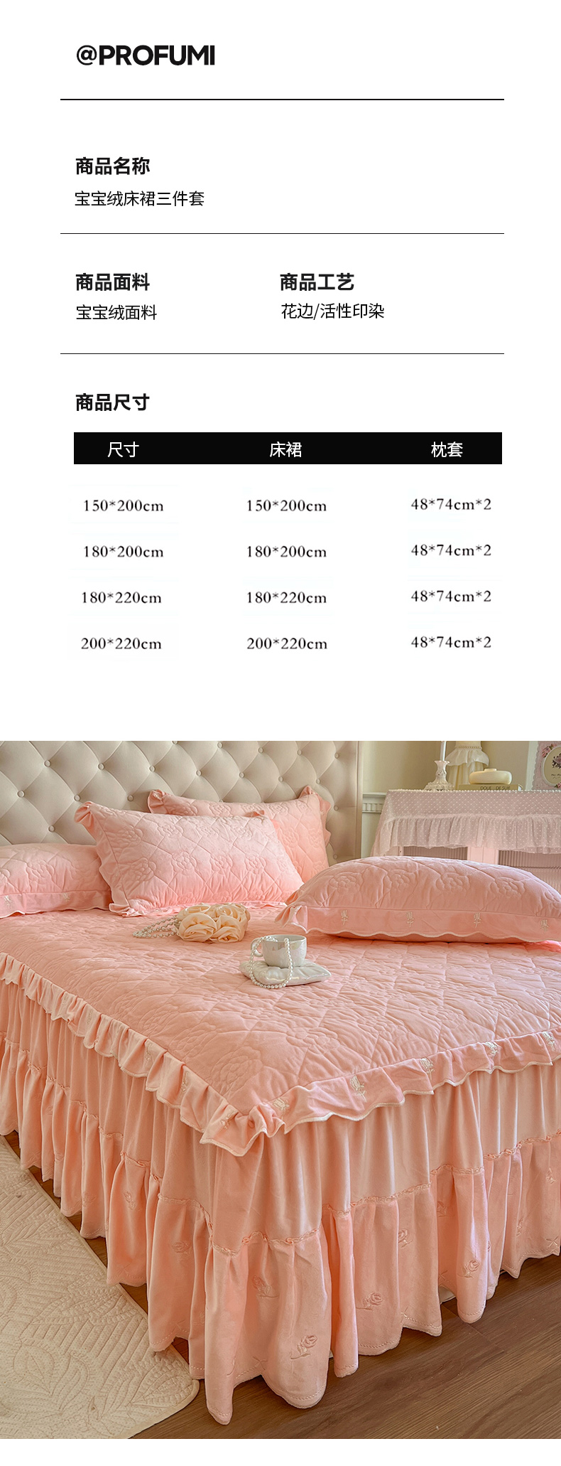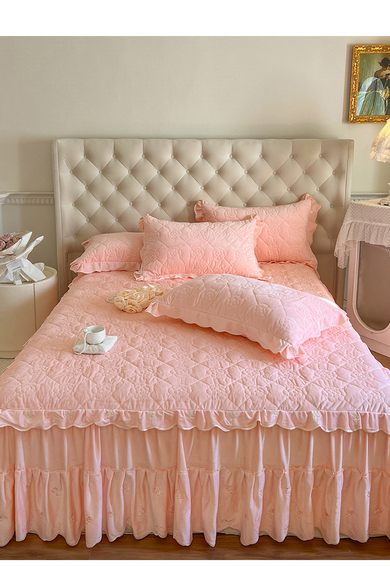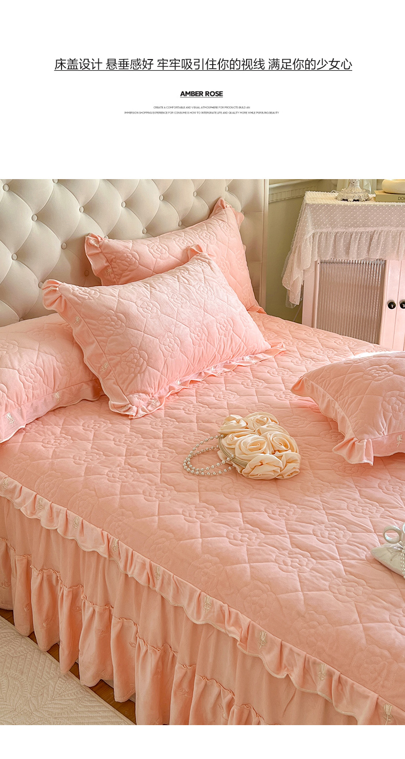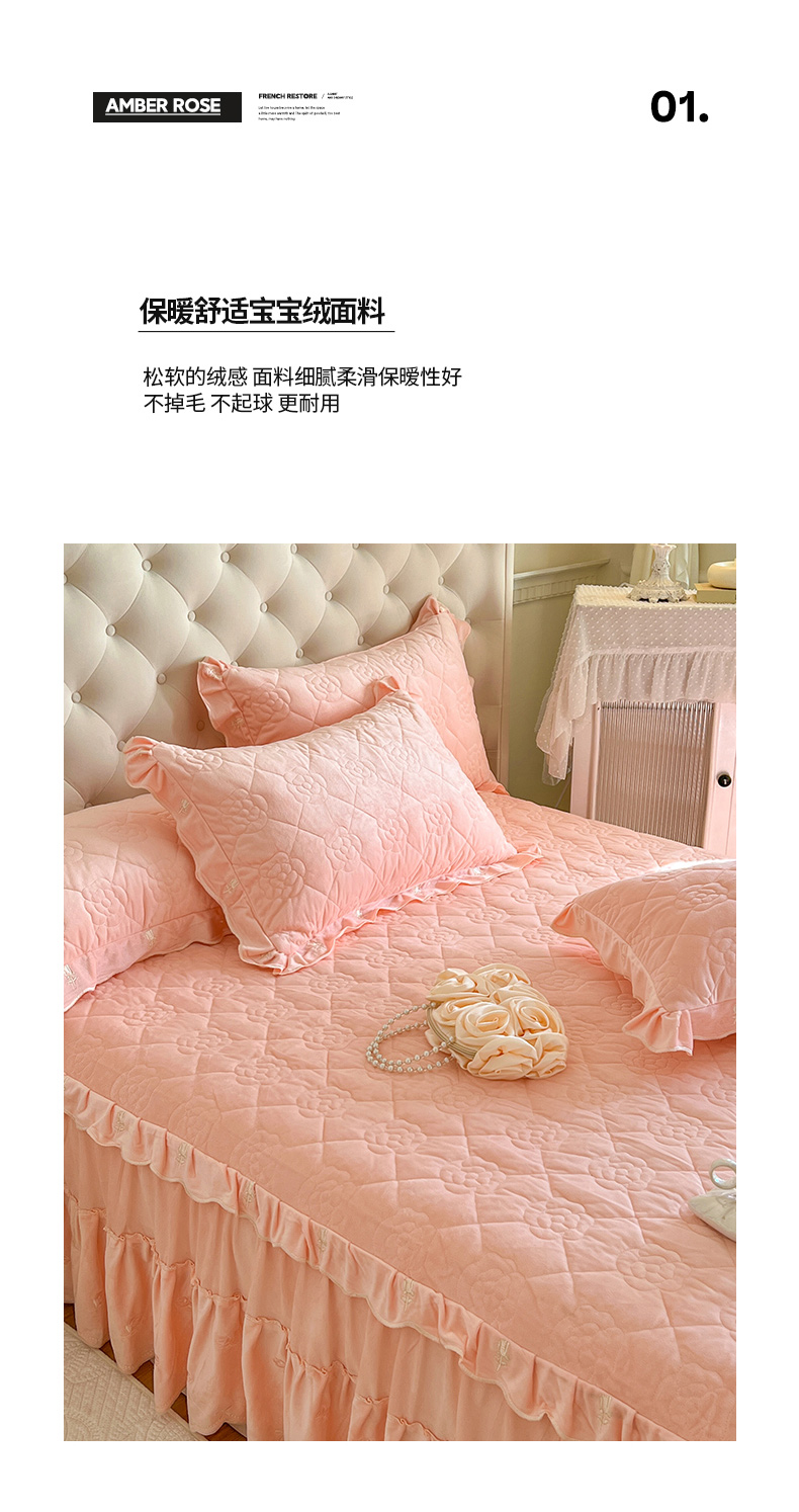 商品名称:网红馆(ck家纺) 2025新款高克重加厚保暖时尚花边宝宝绒乐伊系列床裙三件套 乐伊-粉
