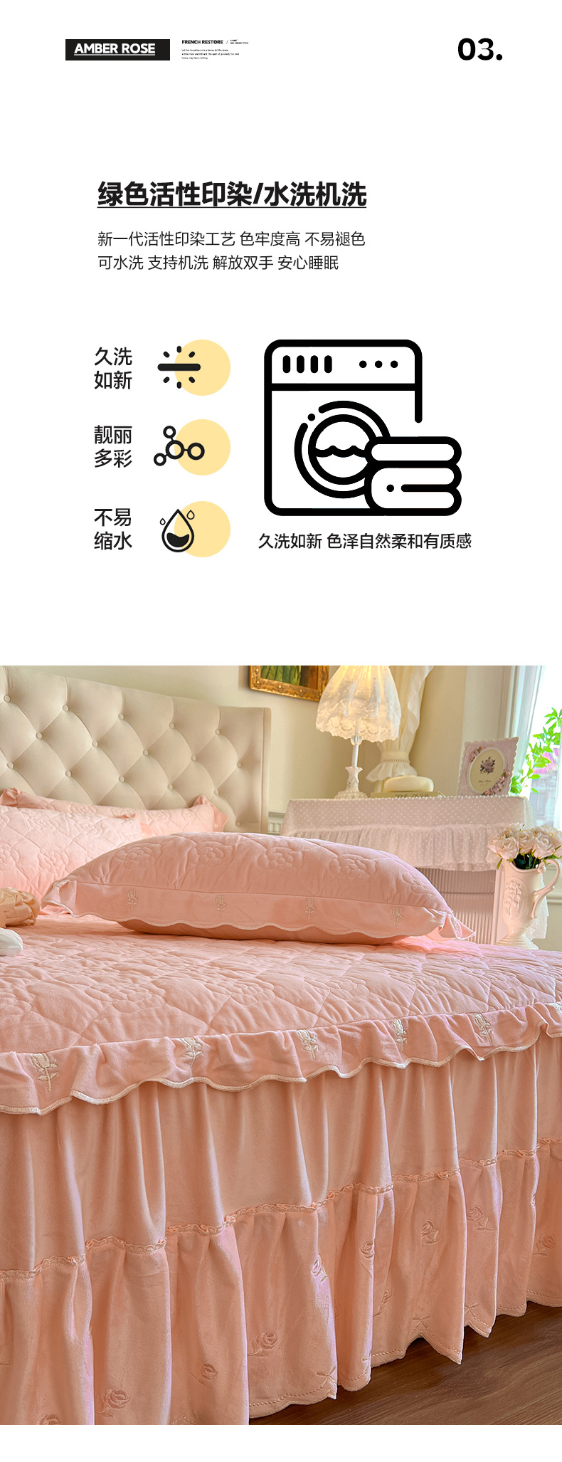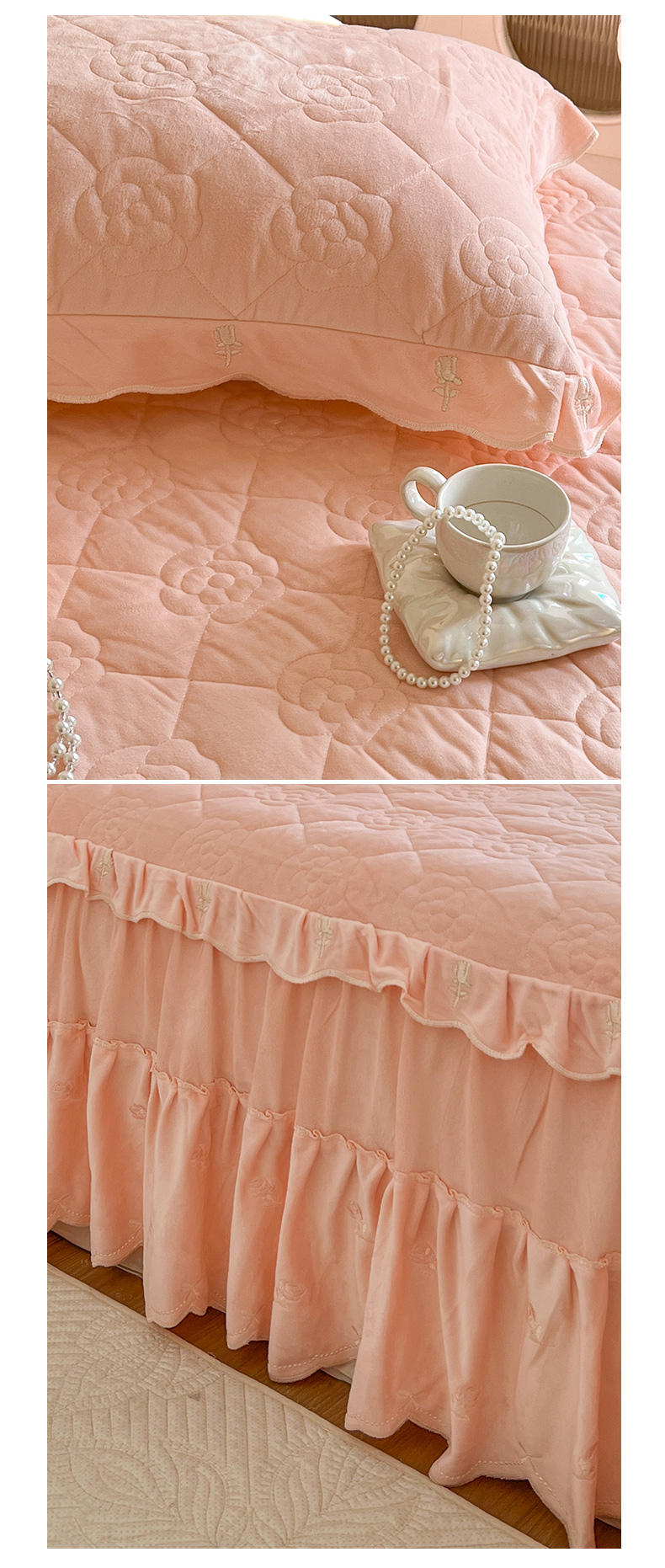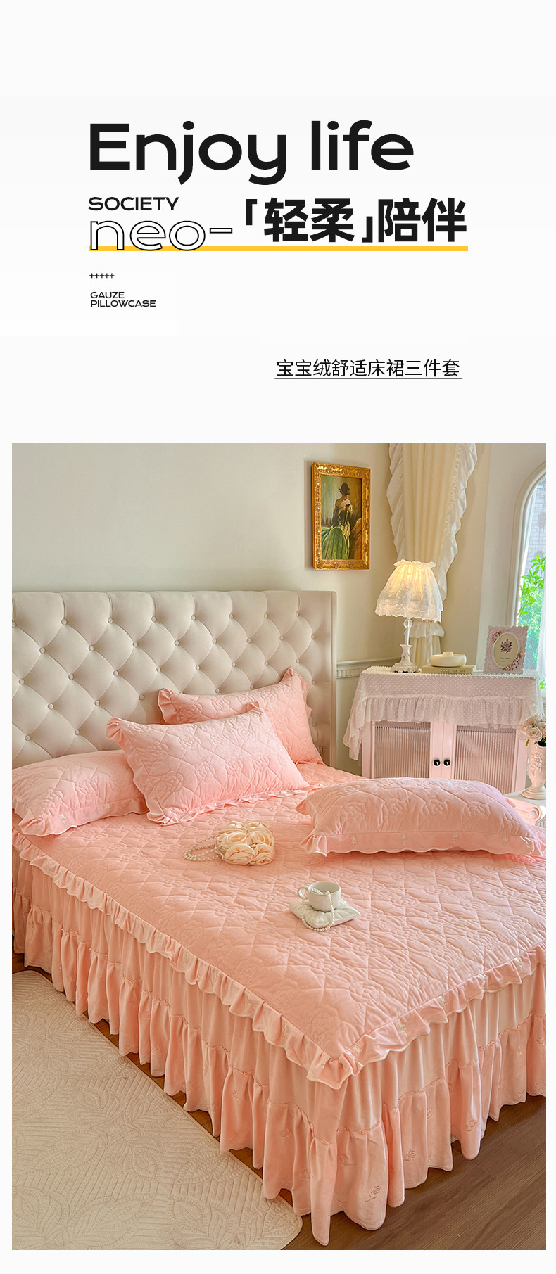 商品名称:网红馆(ck家纺) 2025新款高克重加厚保暖时尚花边宝宝绒乐伊系列床裙三件套 乐伊-粉