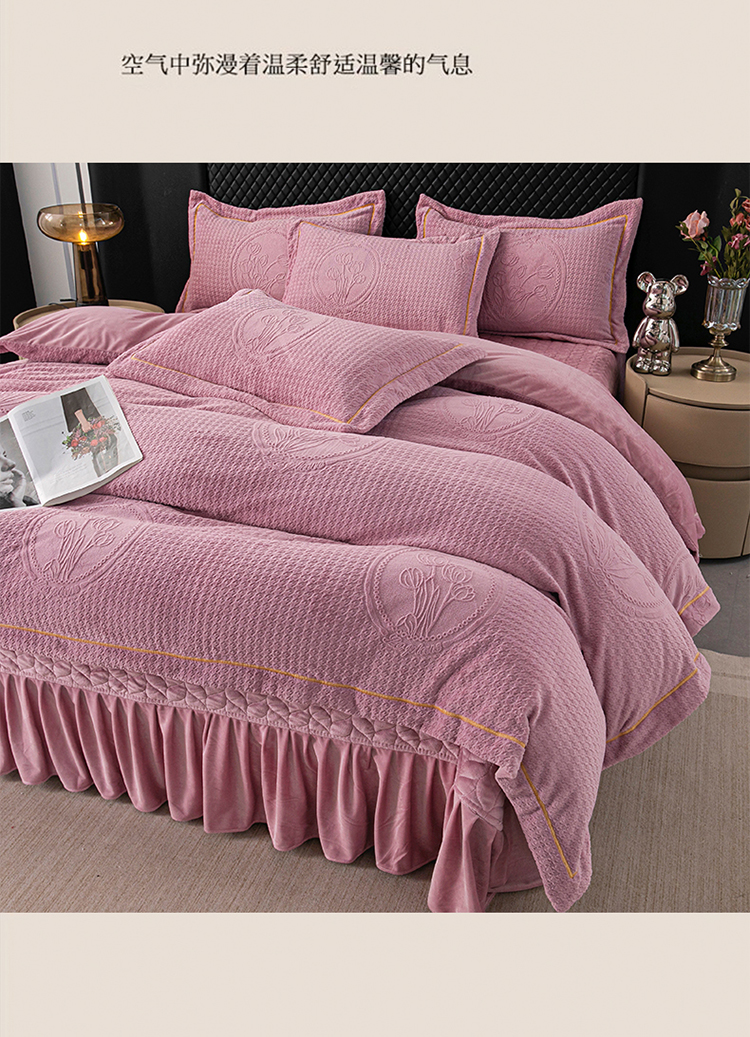 商品名称:畅畅家纺 2024新款11斤加厚冬季轻奢款230克全消光立体雕花牛奶绒夹棉床盖四件套 轻奢花语-豆沙