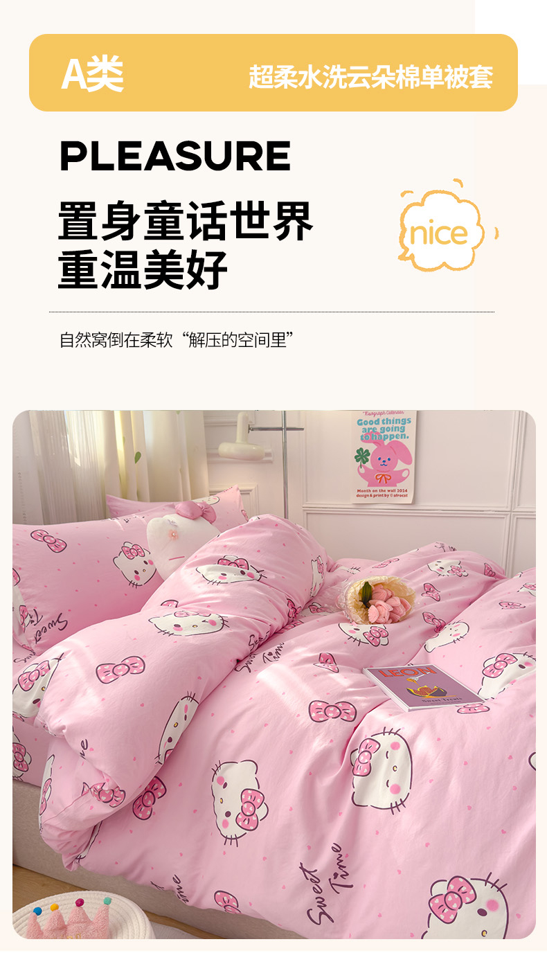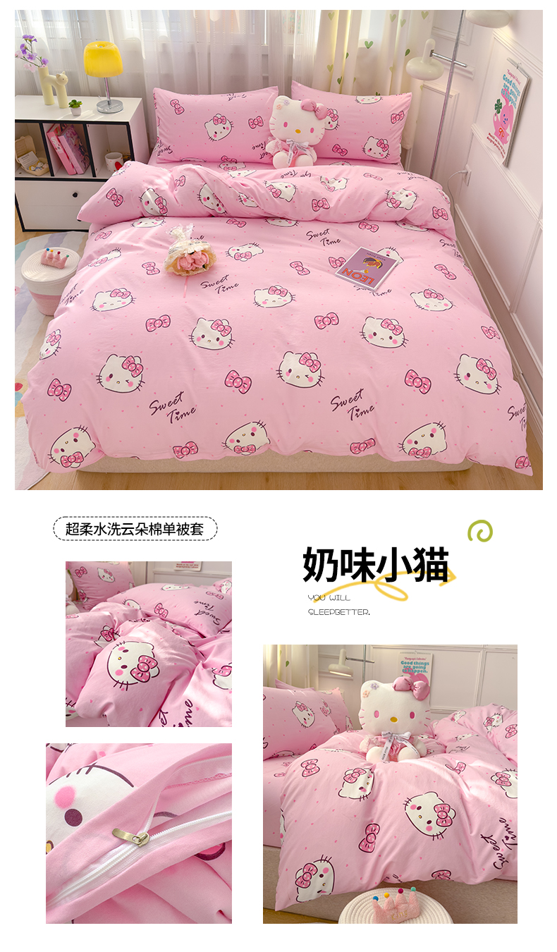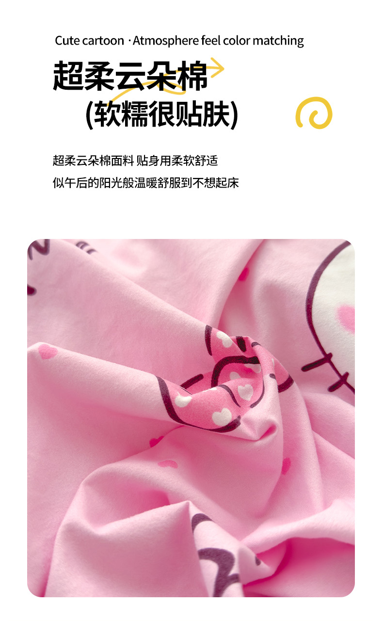 宏源家纺 2024新款A类高克重超柔水洗云朵棉单被套 奶味小猫