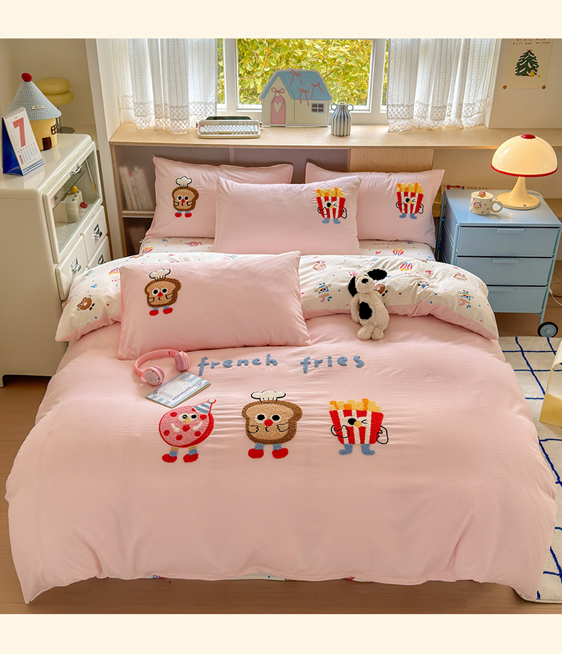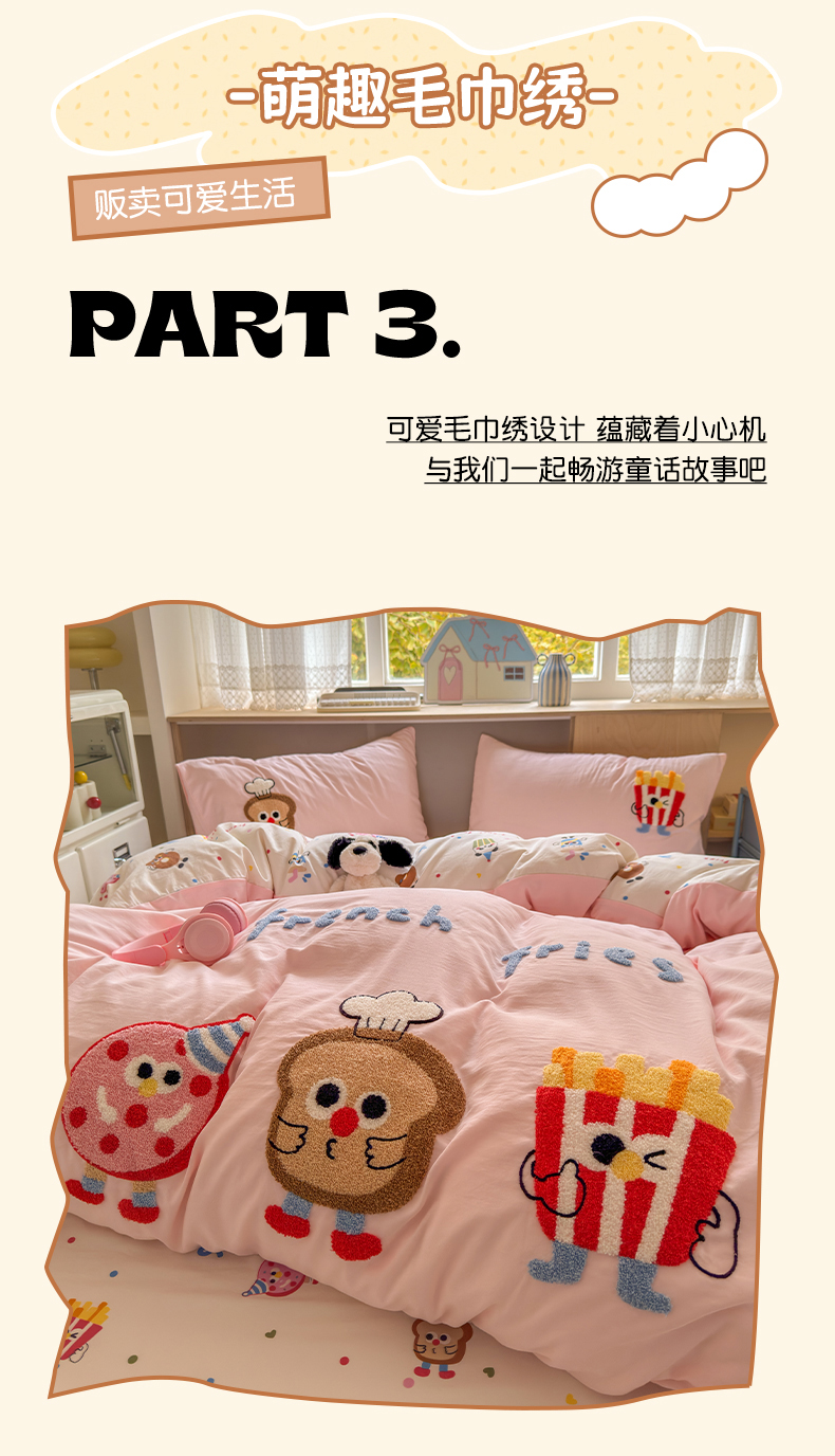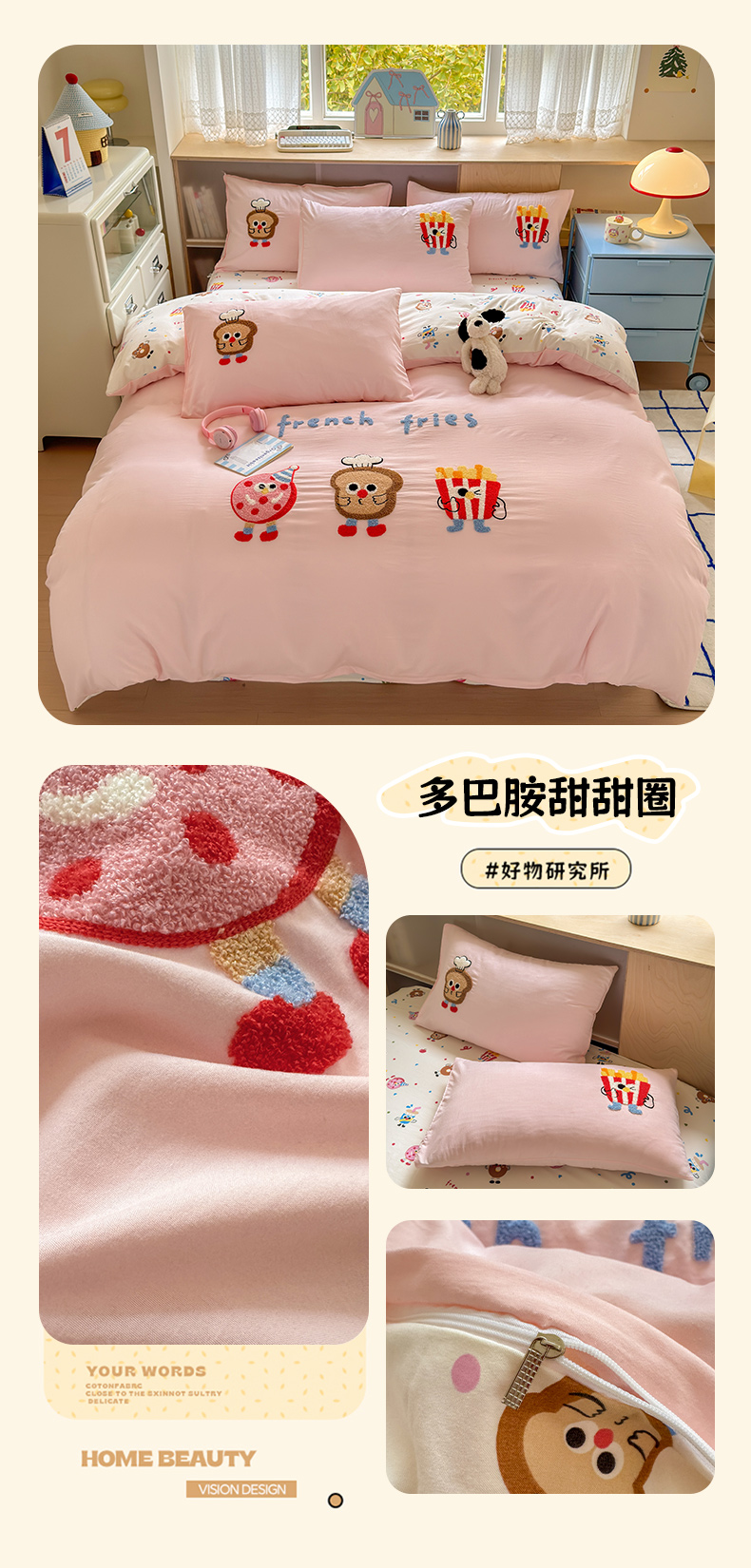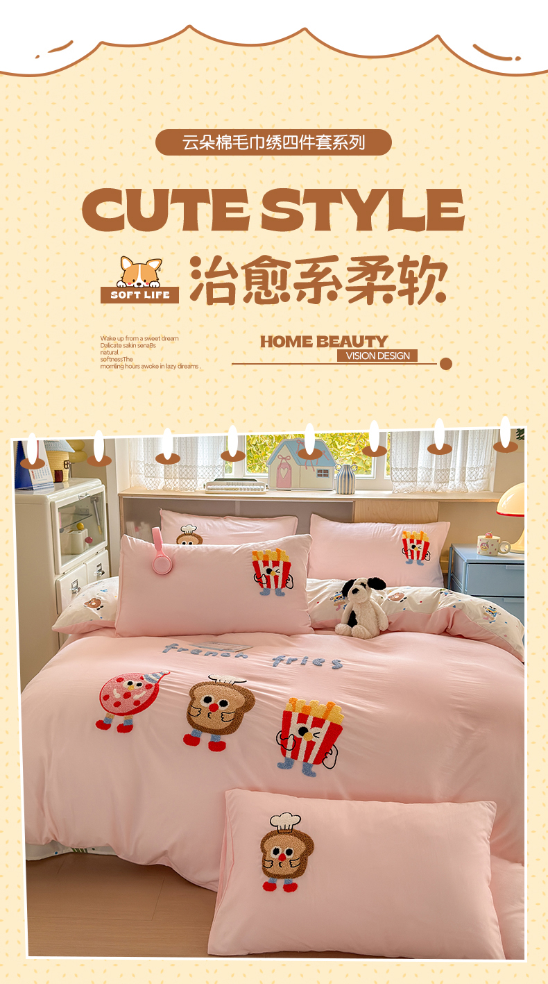 当前位置: 91家纺网 > 商品网购 > 床品套件 > 四件套 > 其它四件套 > 罗亿家纺 2025新款糯糯棉(110克)大版卡通毛巾绣四件套(提供买家绣) 多巴胺甜甜圈