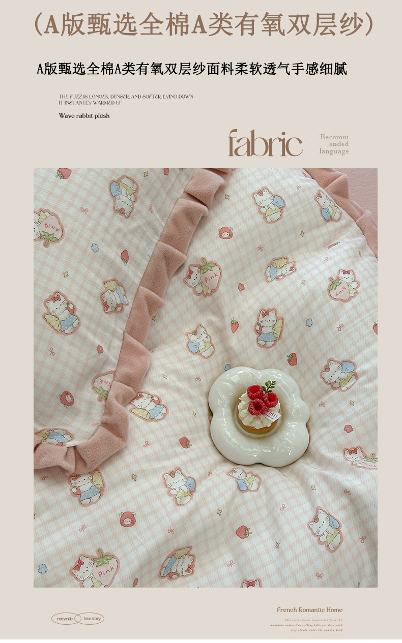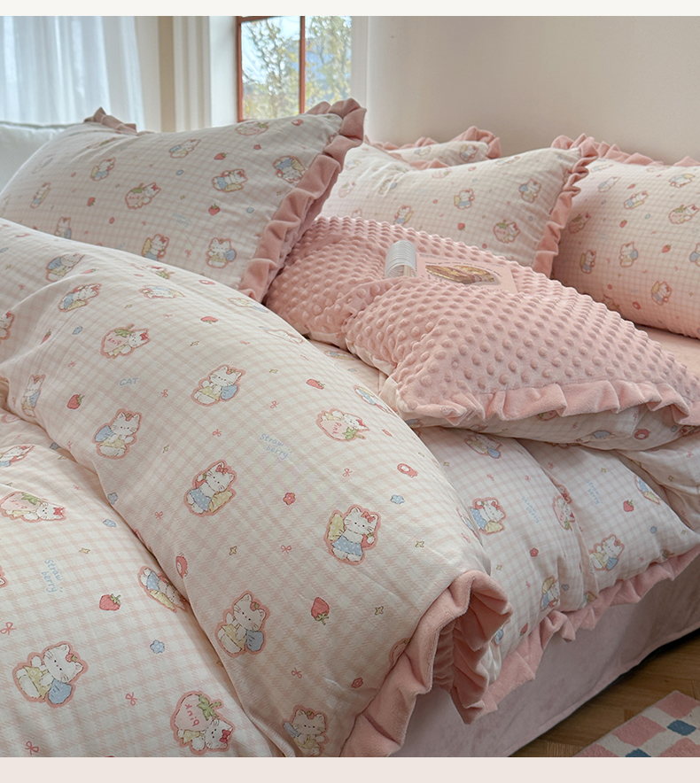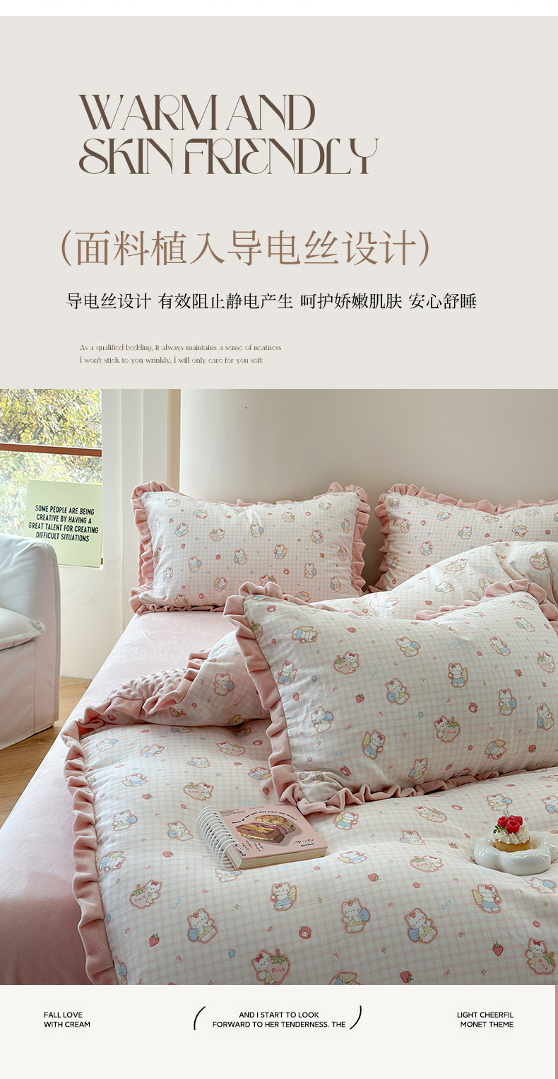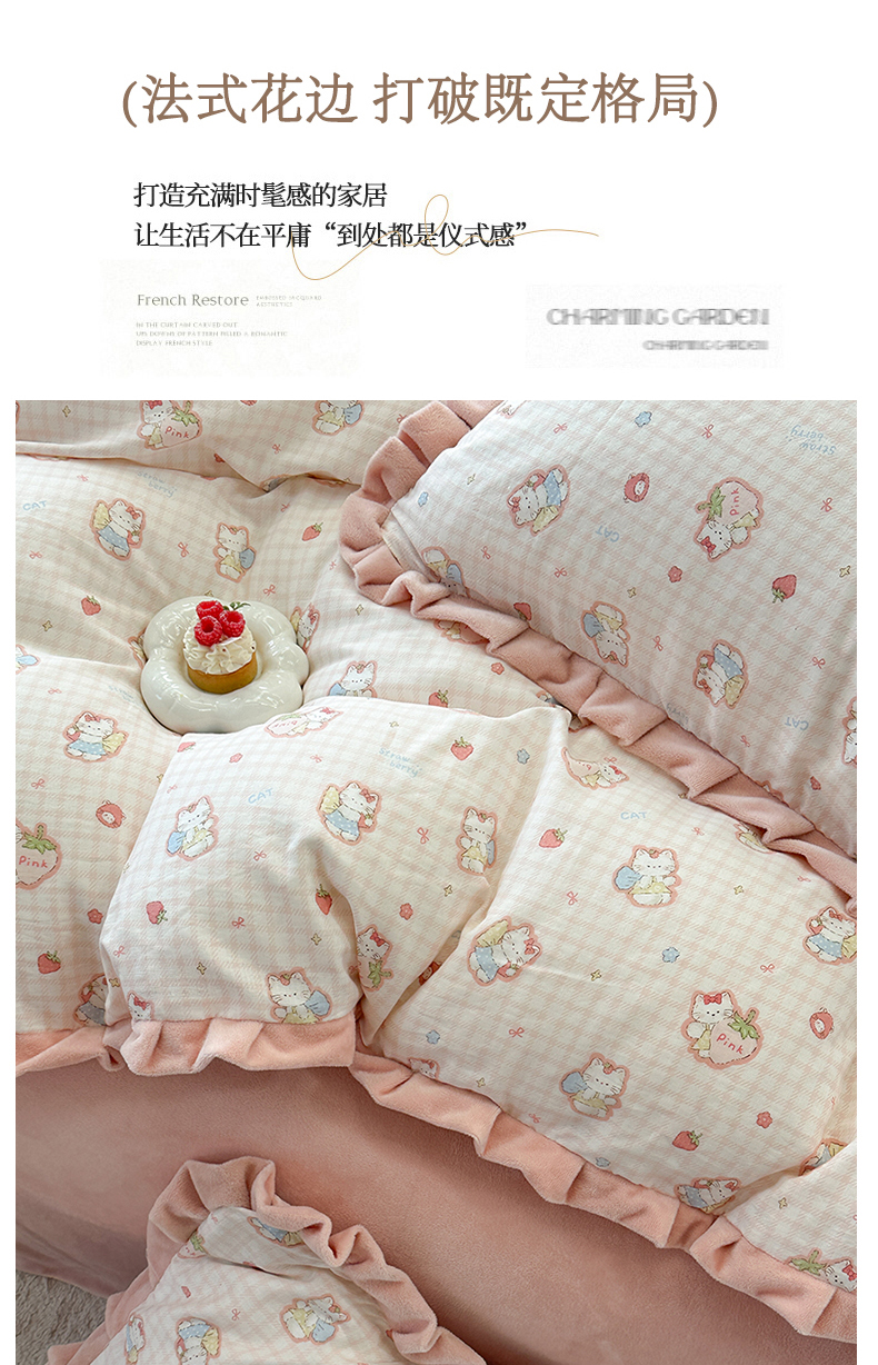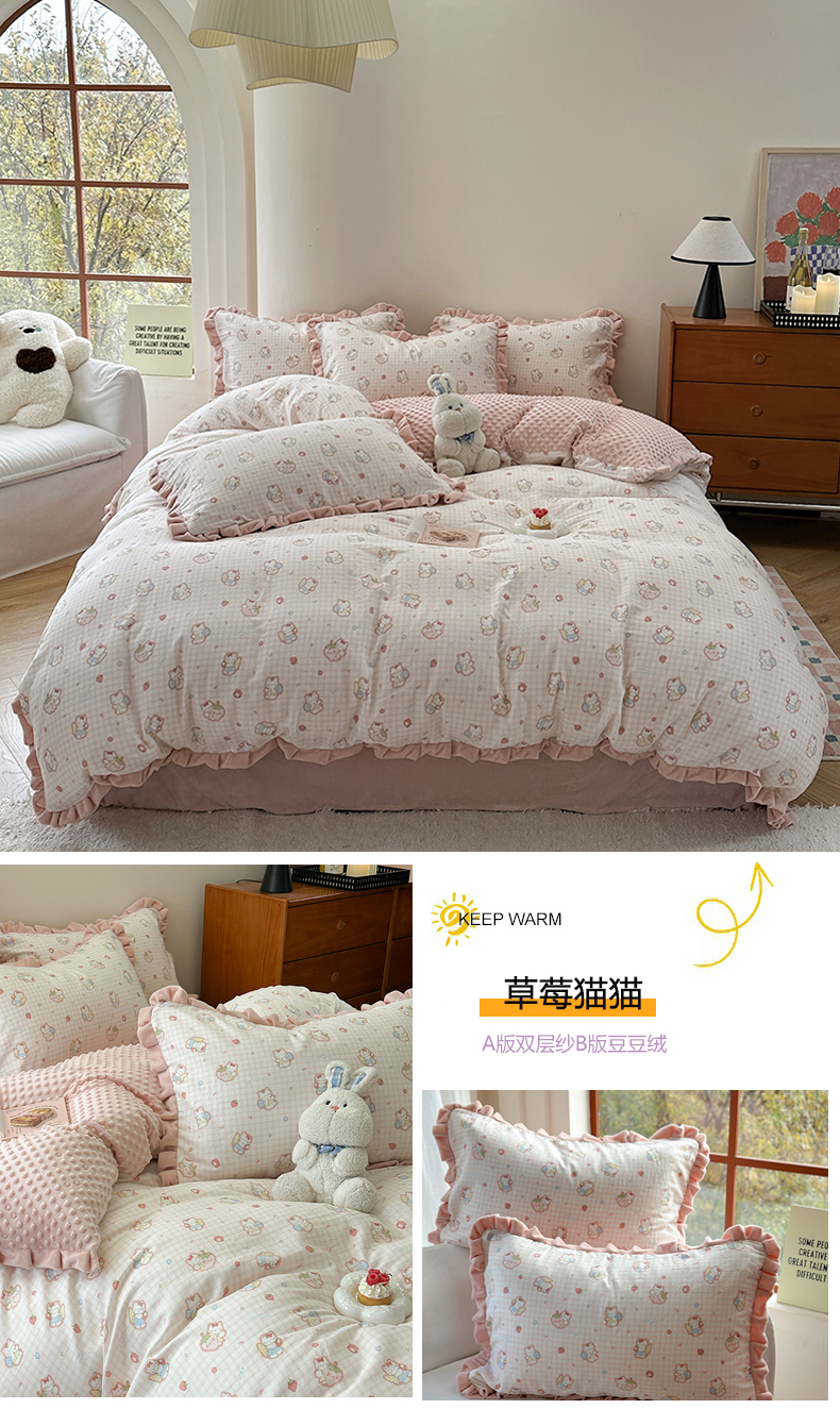 当前位置: 91家纺网 > 商品网购 > 床品套件 > 四件套 > 其它四件套 > 麦伦家居 2025新款多功能床品全棉A类有氧双层纱+豆豆绒四件套荷叶边系列 草莓猫猫