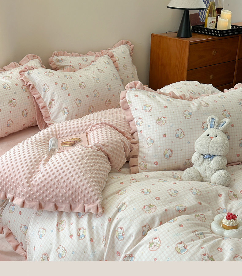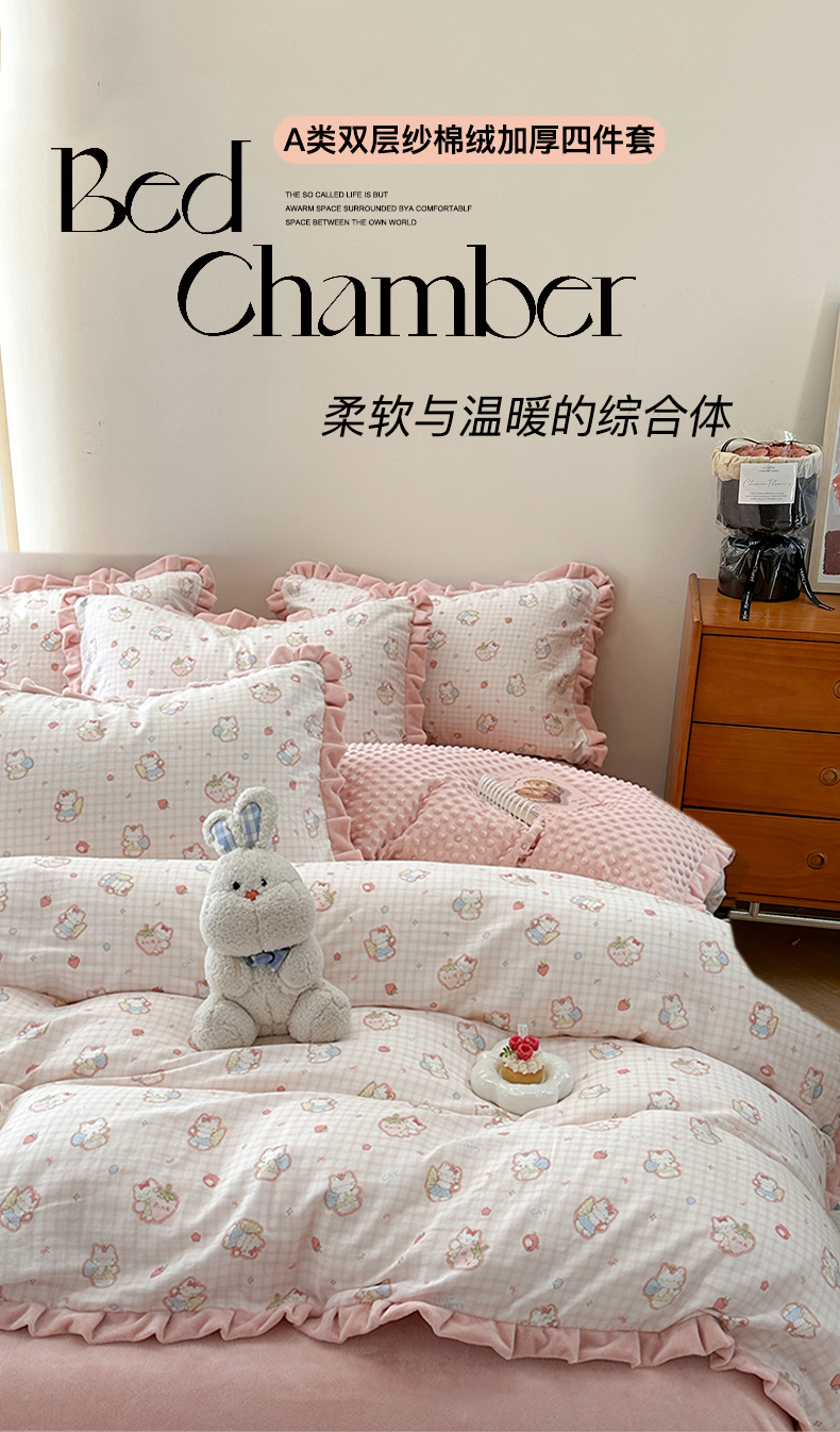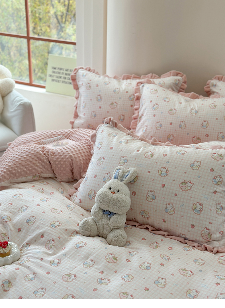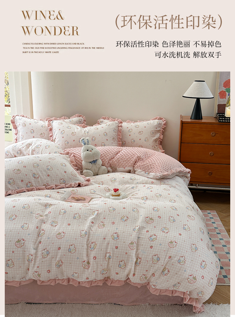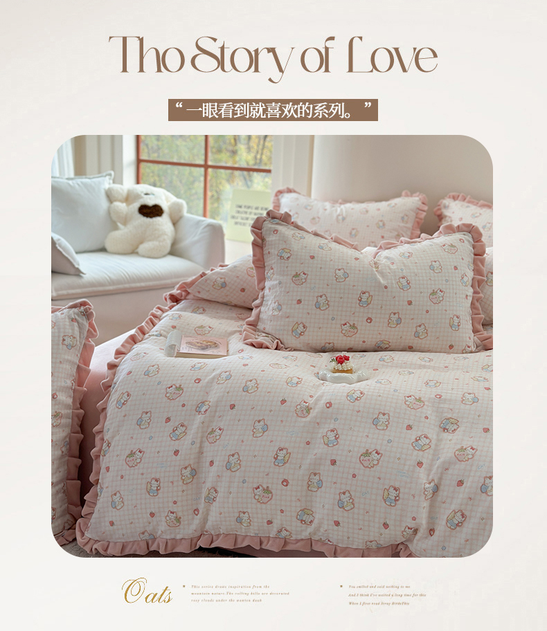 当前位置: 91家纺网 > 商品网购 > 床品套件 > 四件套 > 其它四件套 > 麦伦家居 2025新款多功能床品全棉A类有氧双层纱+豆豆绒四件套荷叶边系列 草莓猫猫