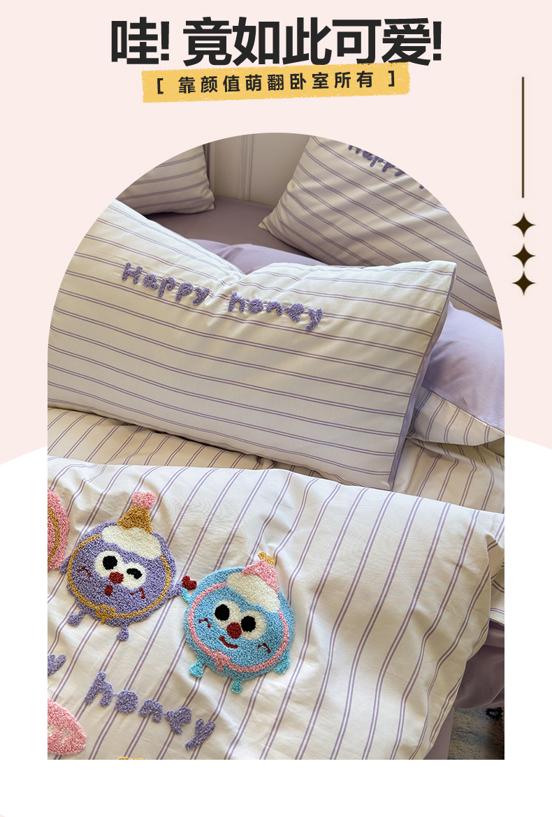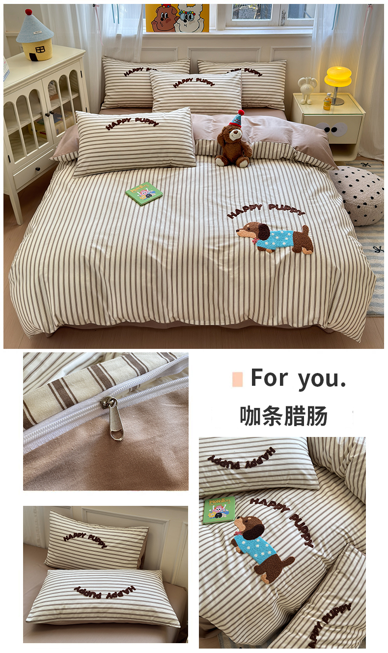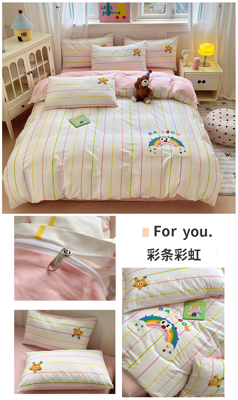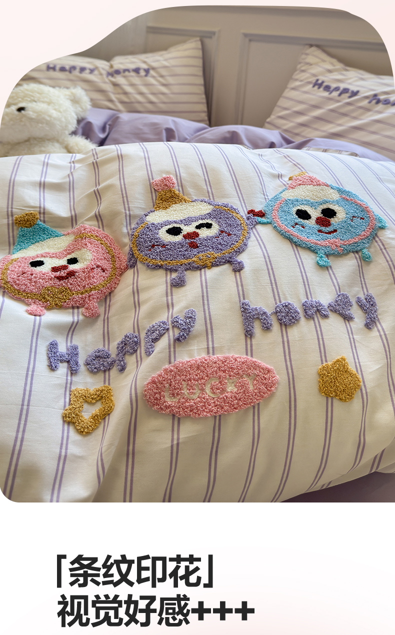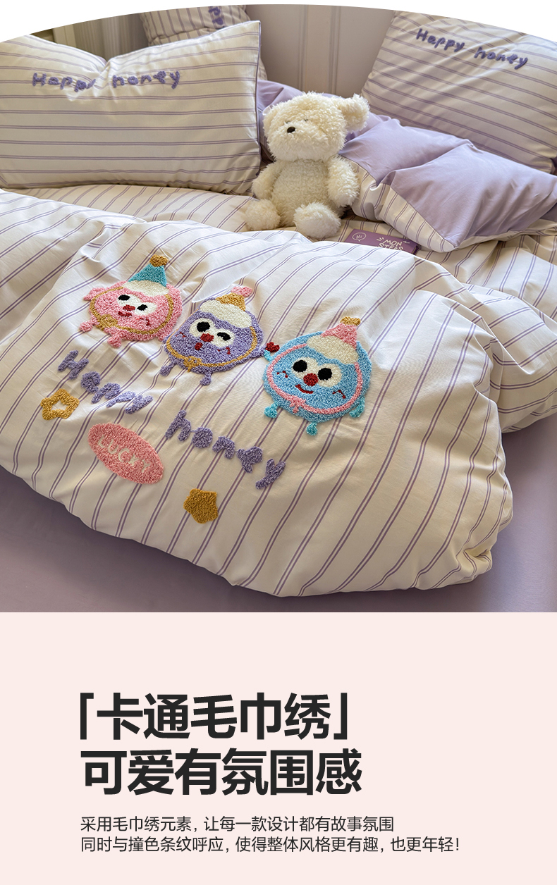(总)有间小屋 2025新款全棉条纹印花+毛巾绣系列四件套,彩条彩虹,粉条兔兔,黄条萌鸡,咖条腊肠,蓝条狗狗,紫条毛球