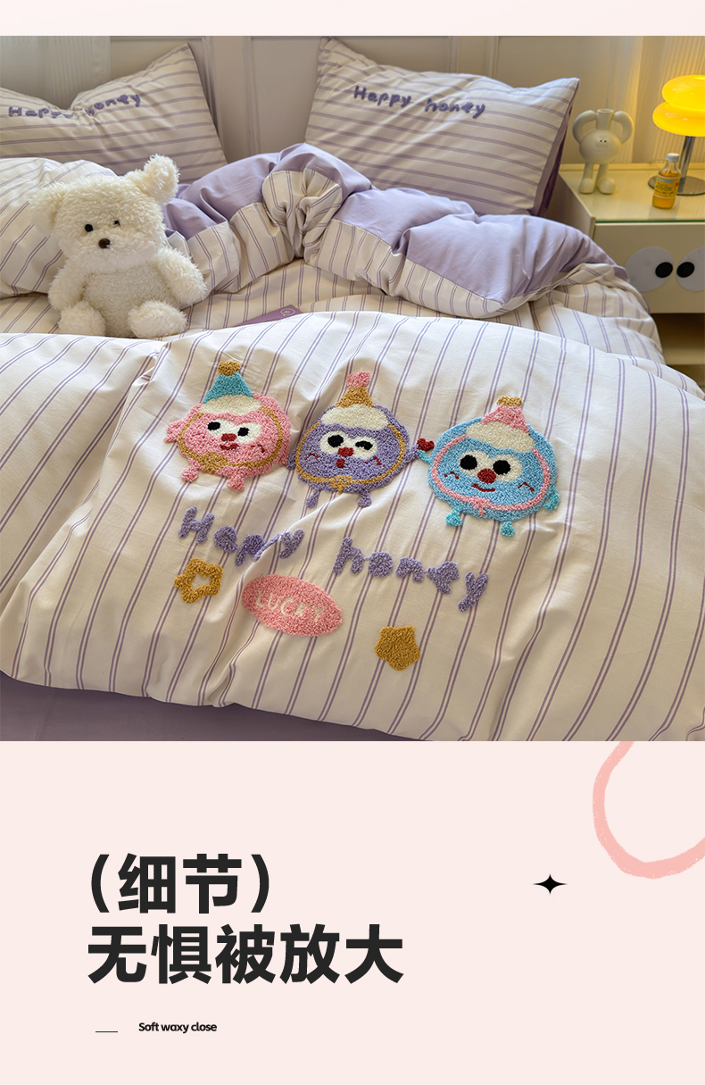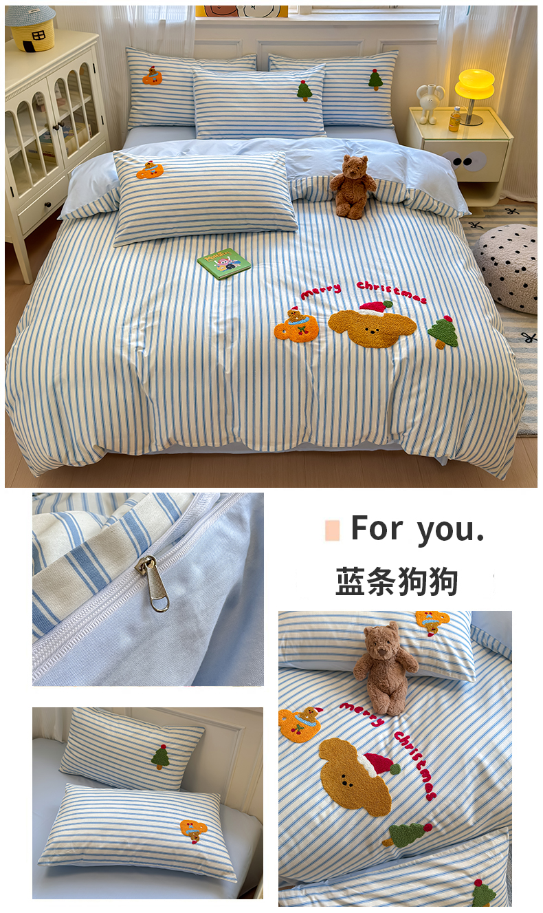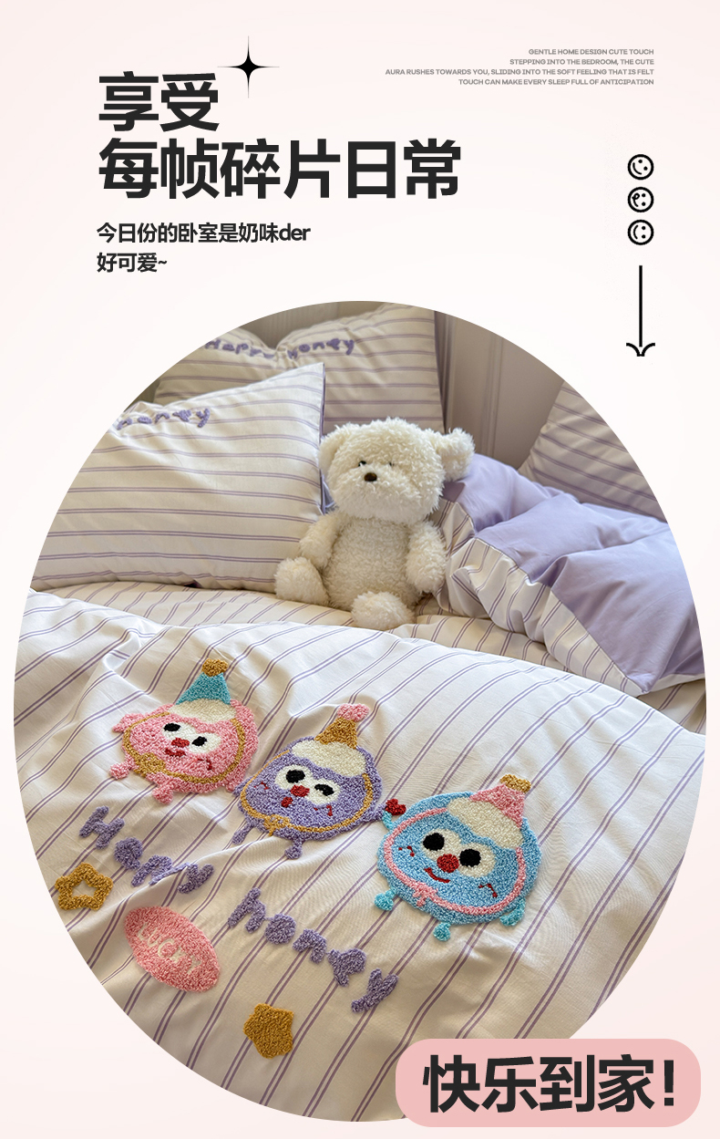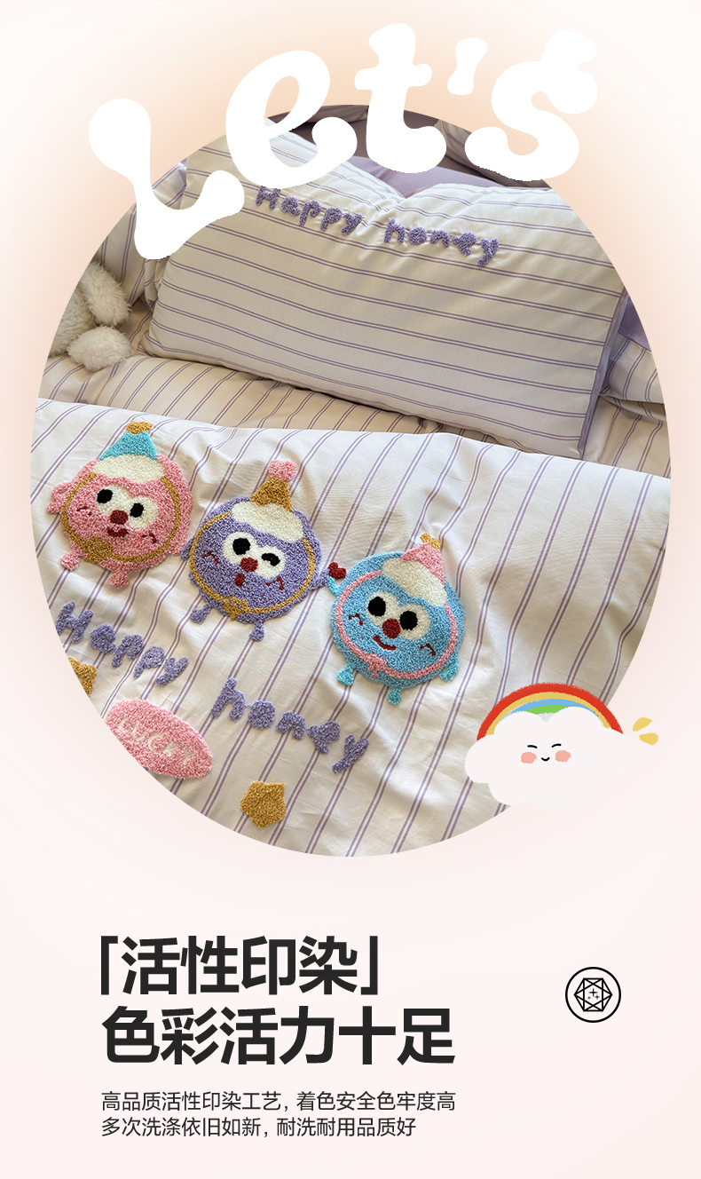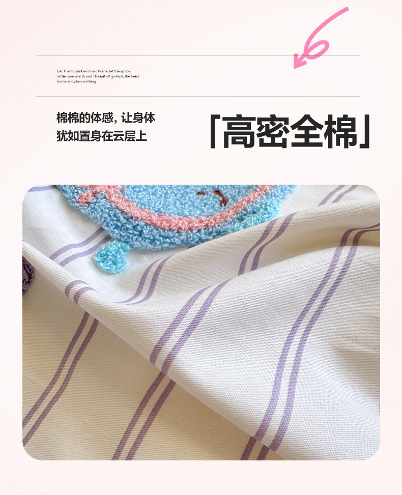 (总)有间小屋 2025新款全棉条纹印花+毛巾绣系列四件套,彩条彩虹,粉条兔兔,黄条萌鸡,咖条腊肠,蓝条狗狗,紫条毛球