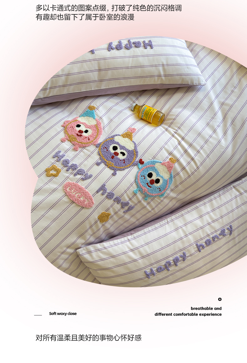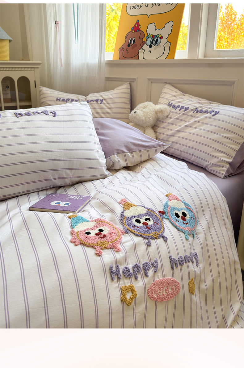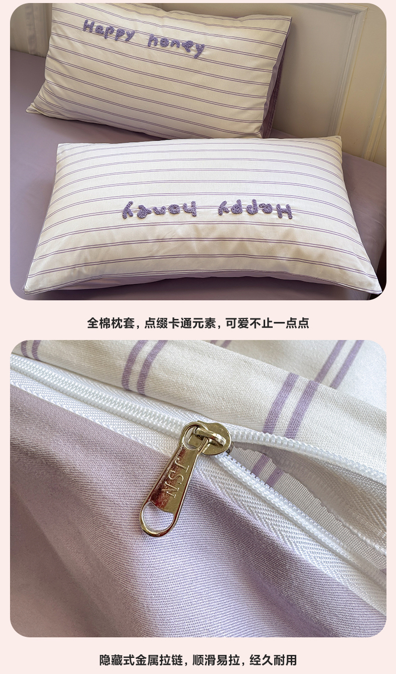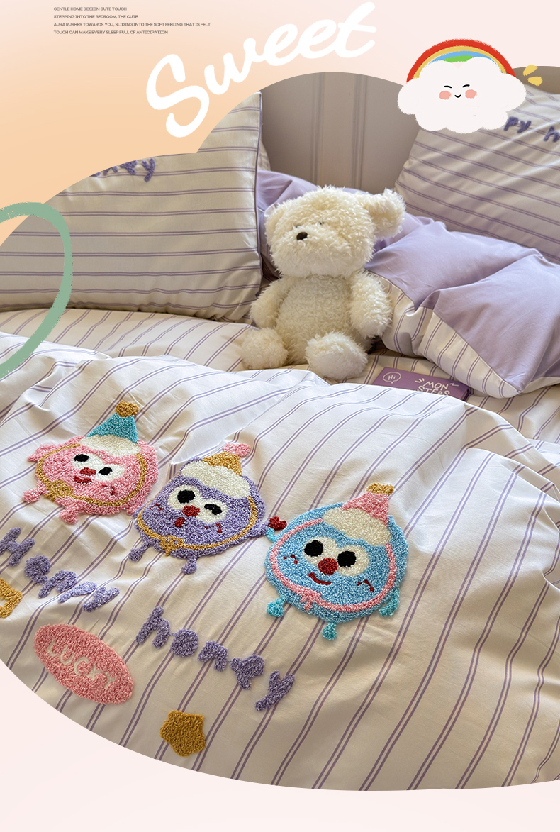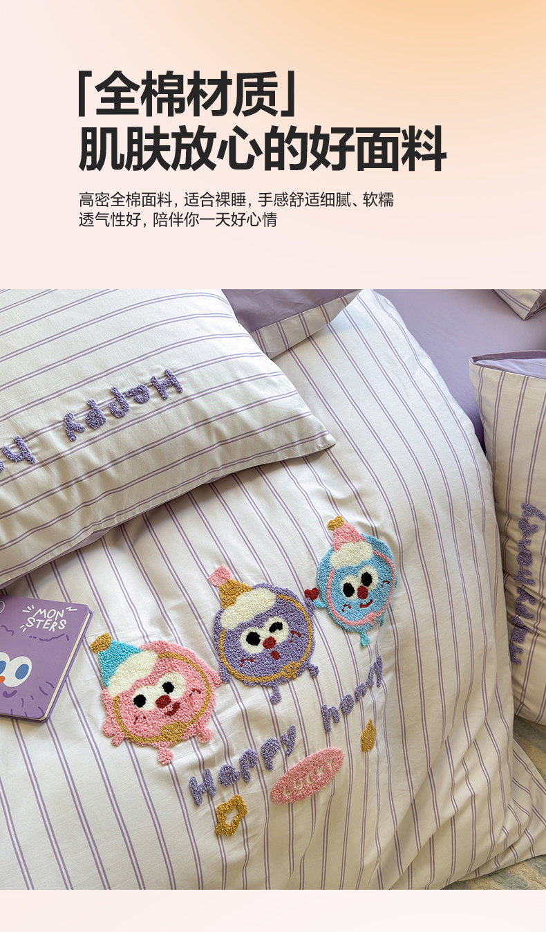 (总)有间小屋 2025新款全棉条纹印花+毛巾绣系列四件套,彩条彩虹,粉条兔兔,黄条萌鸡,咖条腊肠,蓝条狗狗,紫条毛球