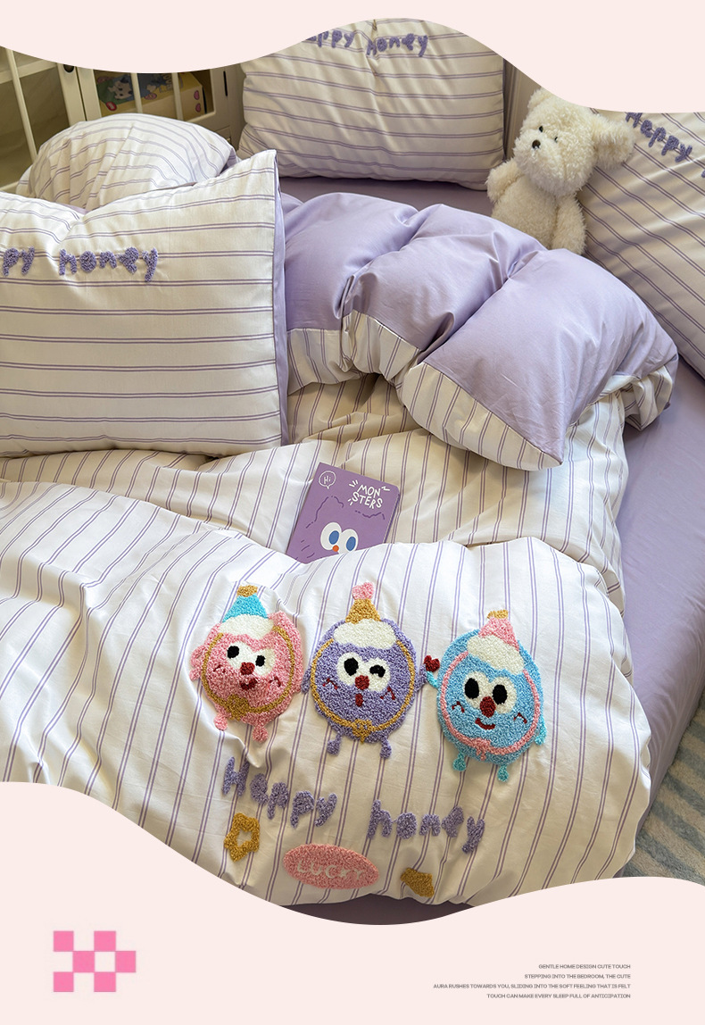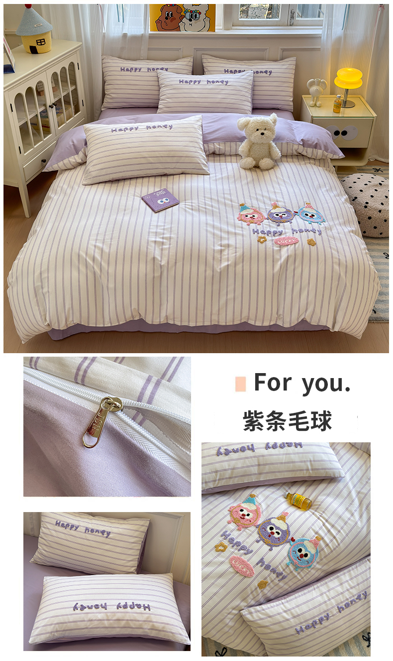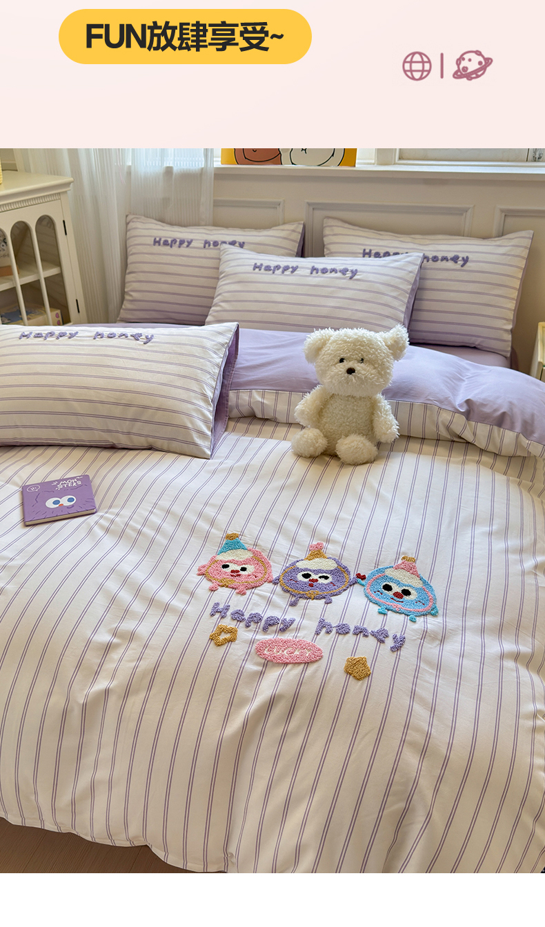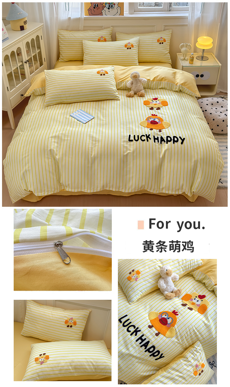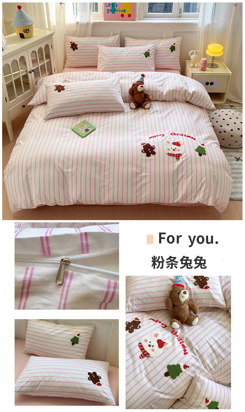 (总)有间小屋 2025新款全棉条纹印花+毛巾绣系列四件套,彩条彩虹,粉条兔兔,黄条萌鸡,咖条腊肠,蓝条狗狗,紫条毛球