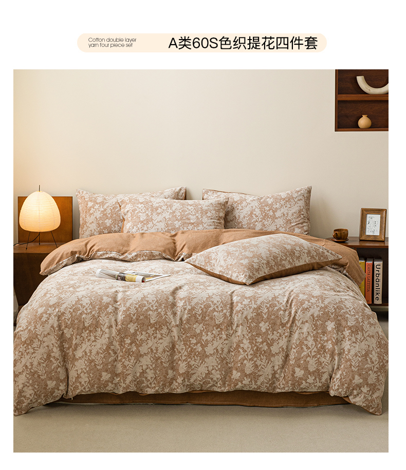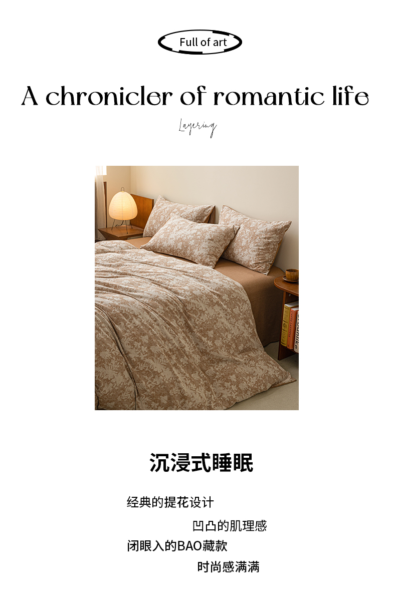 绫韵家纺 2025春夏新款A类60s水洗三层空气大提花母婴级法式全棉纯棉水洗棉四件套 花朦胧·红咖