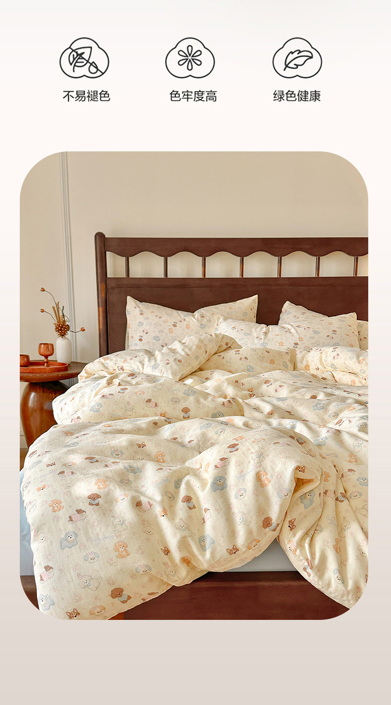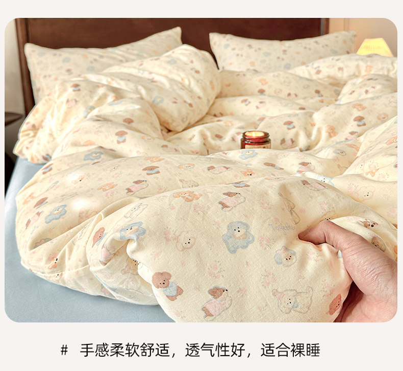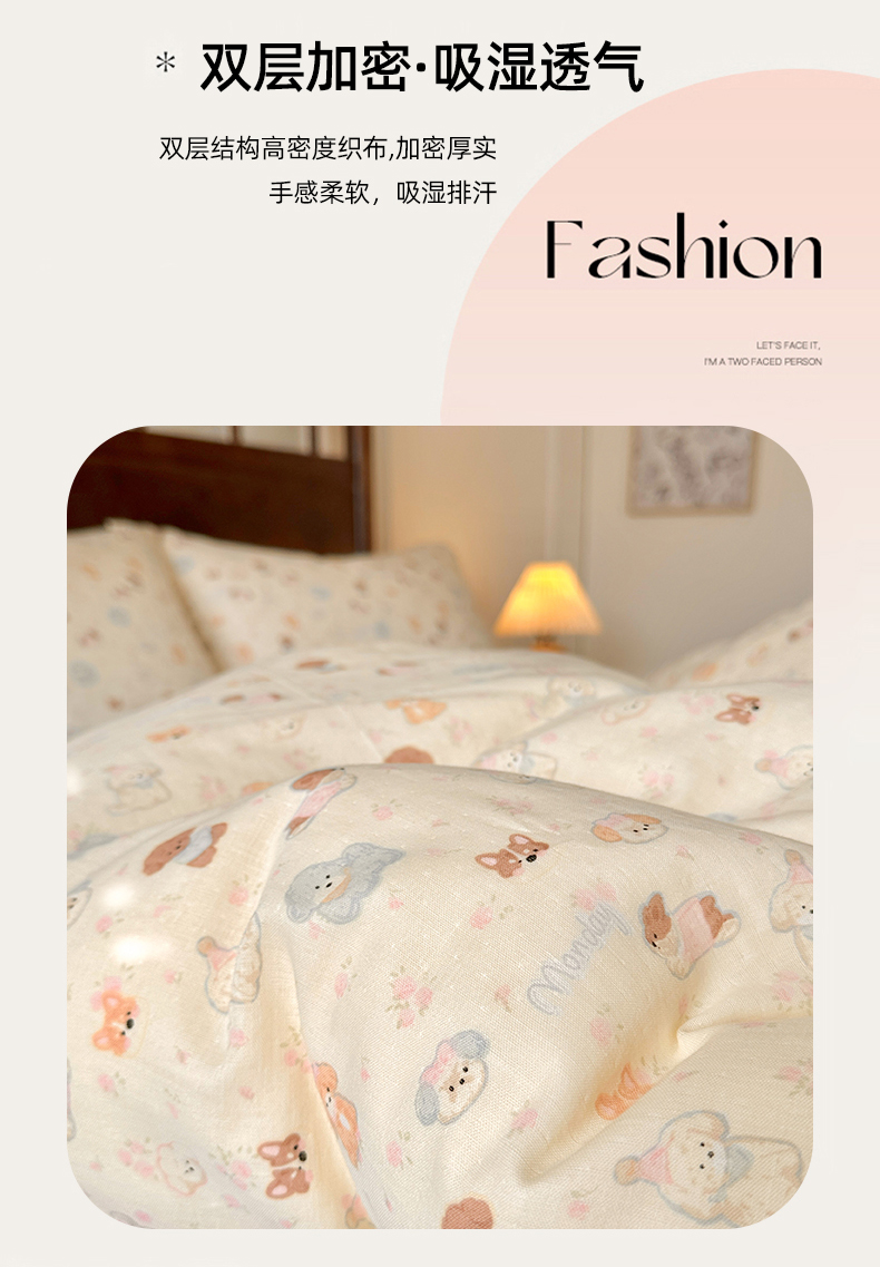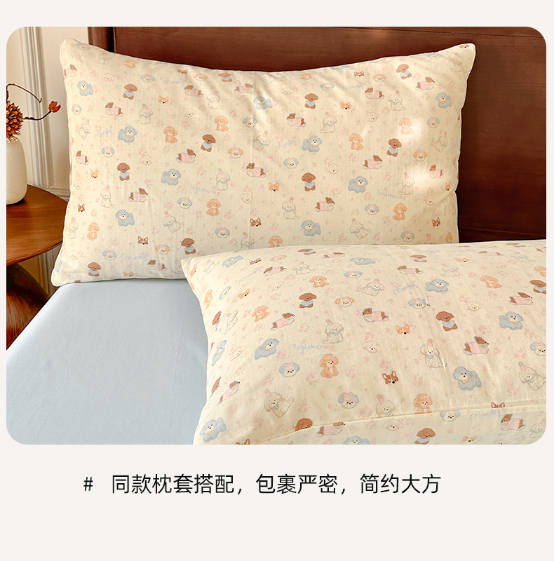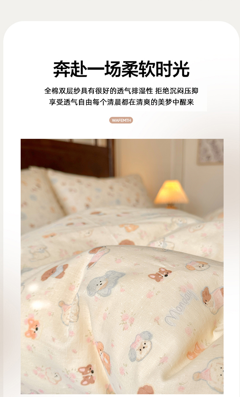 商品名称:呗旺鹿 2025新款A类母婴级全棉有氧双层纱印花四件套 泡芙狗