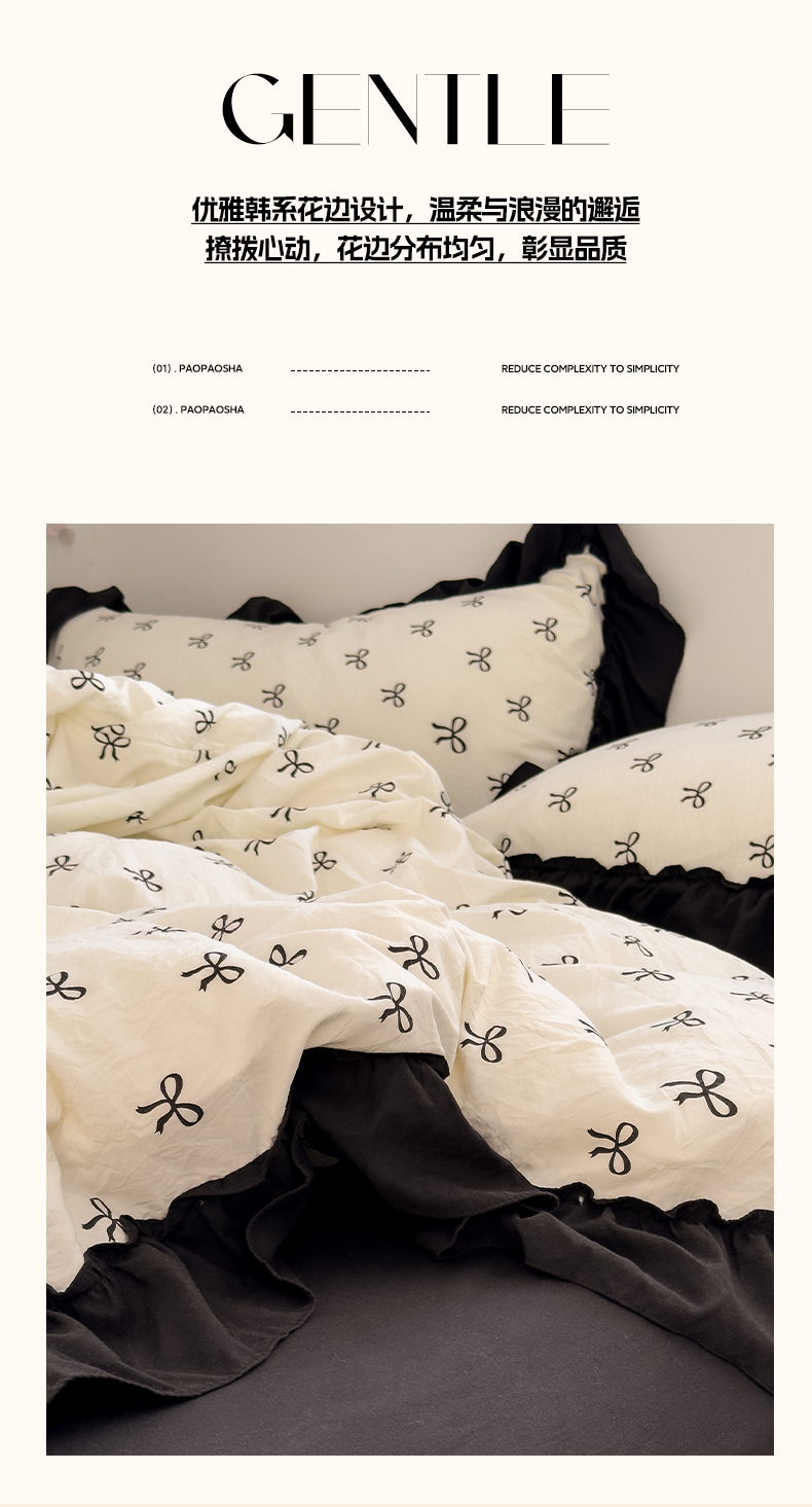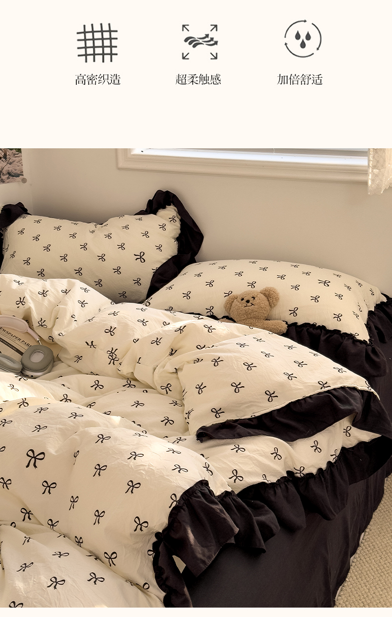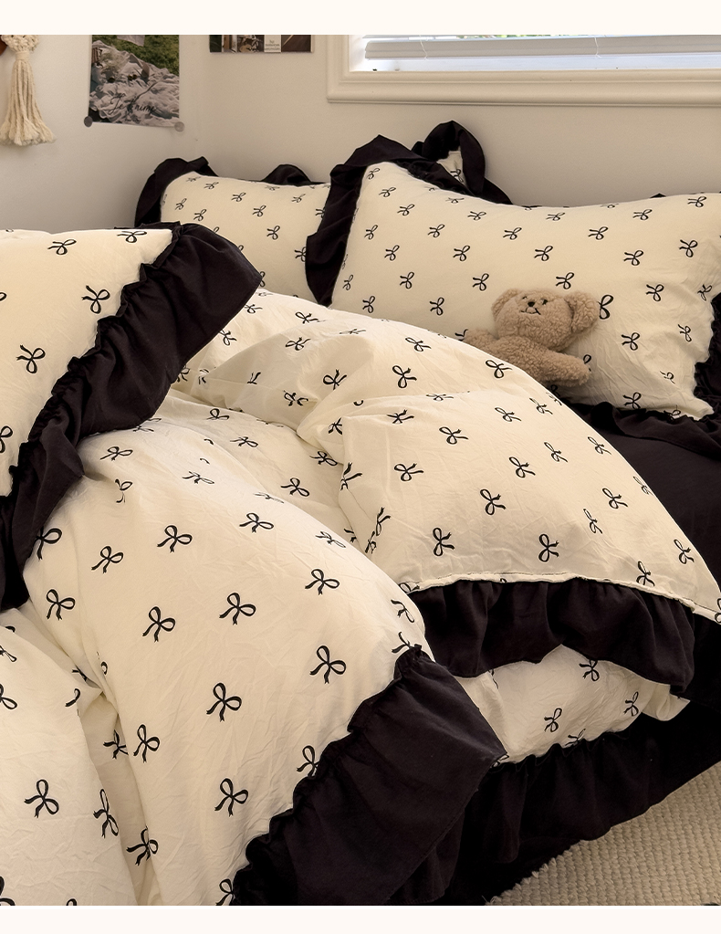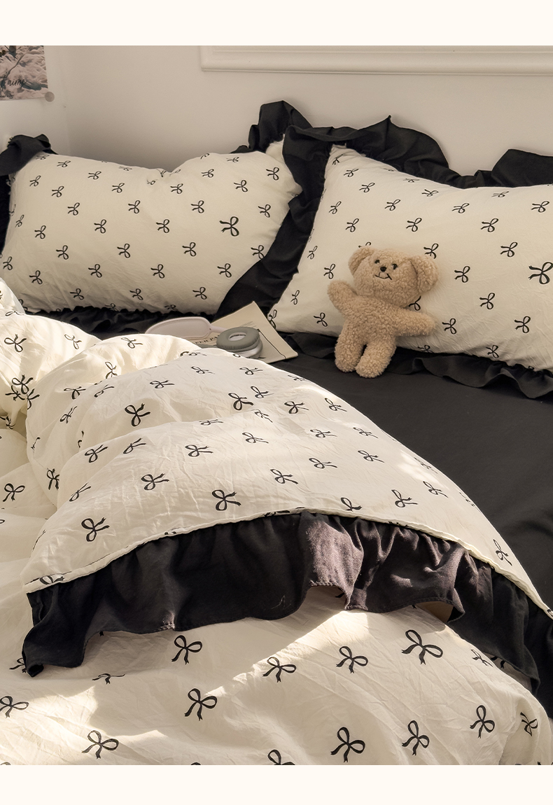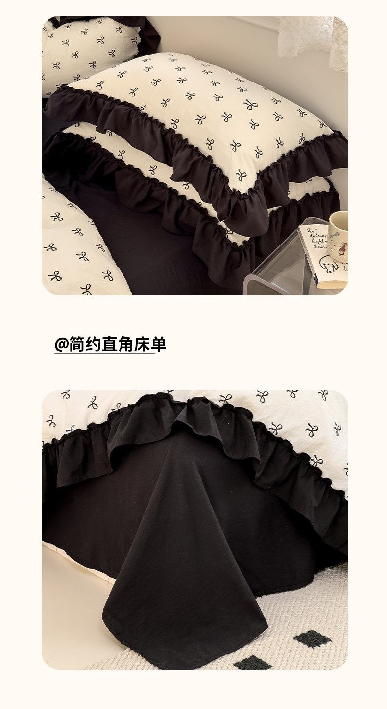 当前位置: 91家纺网 > 商品网购 > 床品套件 > 四件套 > 双层纱四件套 > 繁花家居 2025新款黑色花边赫本风水洗棉双层纱针织棉韩式花边四件套 少女心