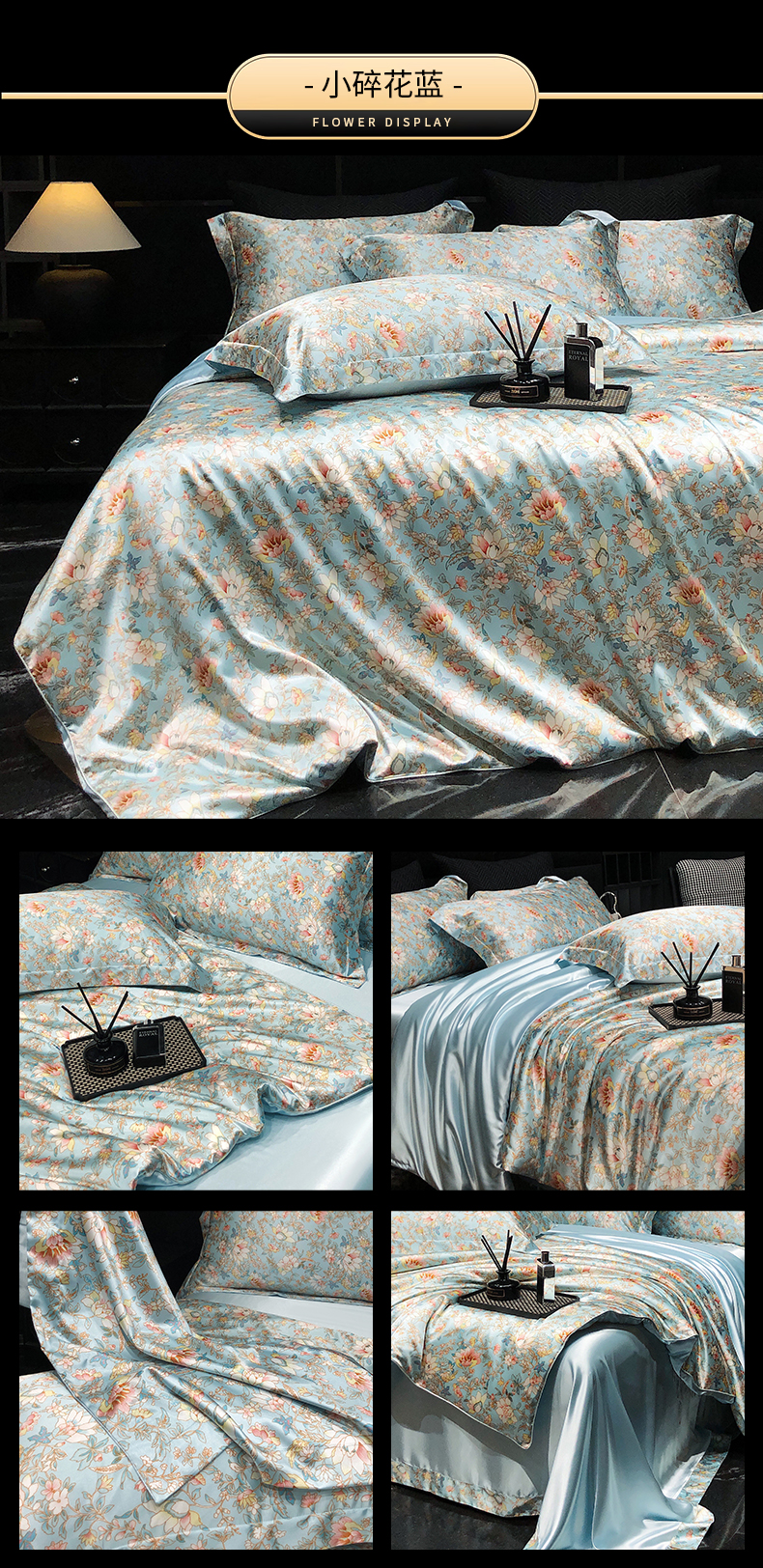 黄鹂鸟 2025新款高端轻奢丝滑裸睡丝绸数码印花水洗真丝天丝四件套系列 -风格三 小碎花-蓝