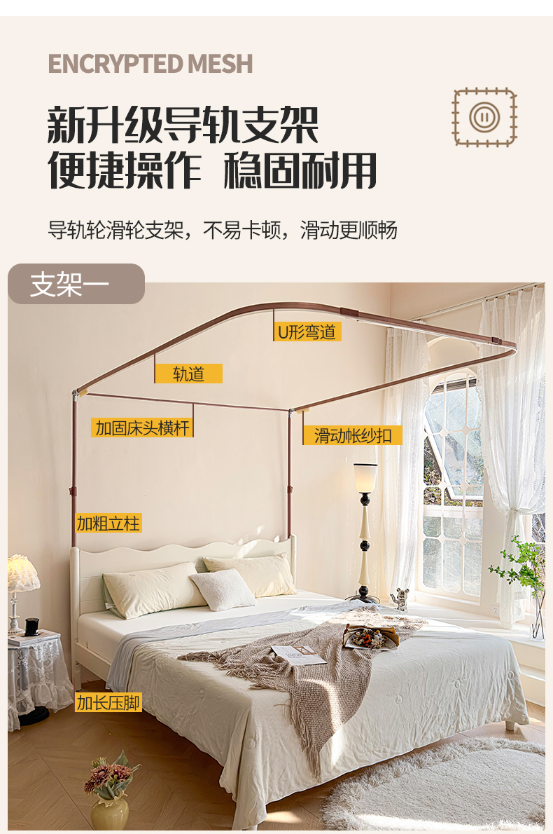 (总)夏彩 2025新款绣花加柔加密铝合金接口高度可调节轨道蚊帐88620