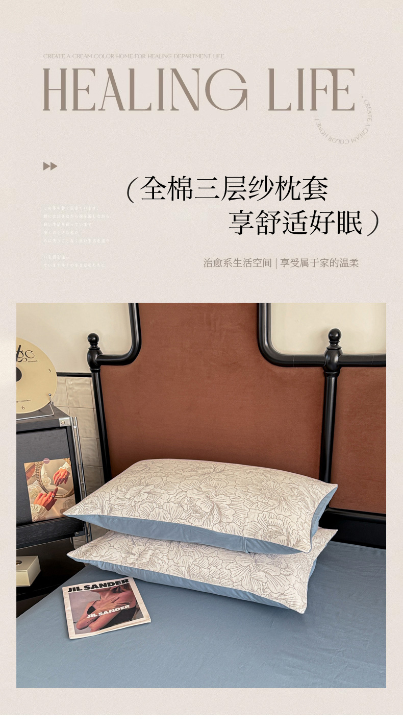 眠博士2025新款AB版简约时尚A类全棉三层纱系列单枕套 三层纱-山茶花-灰蓝