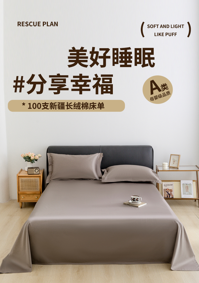 宝时兰 2025新款100支新疆长绒棉单品床单全棉枕套纯棉三件套 雅棕灰