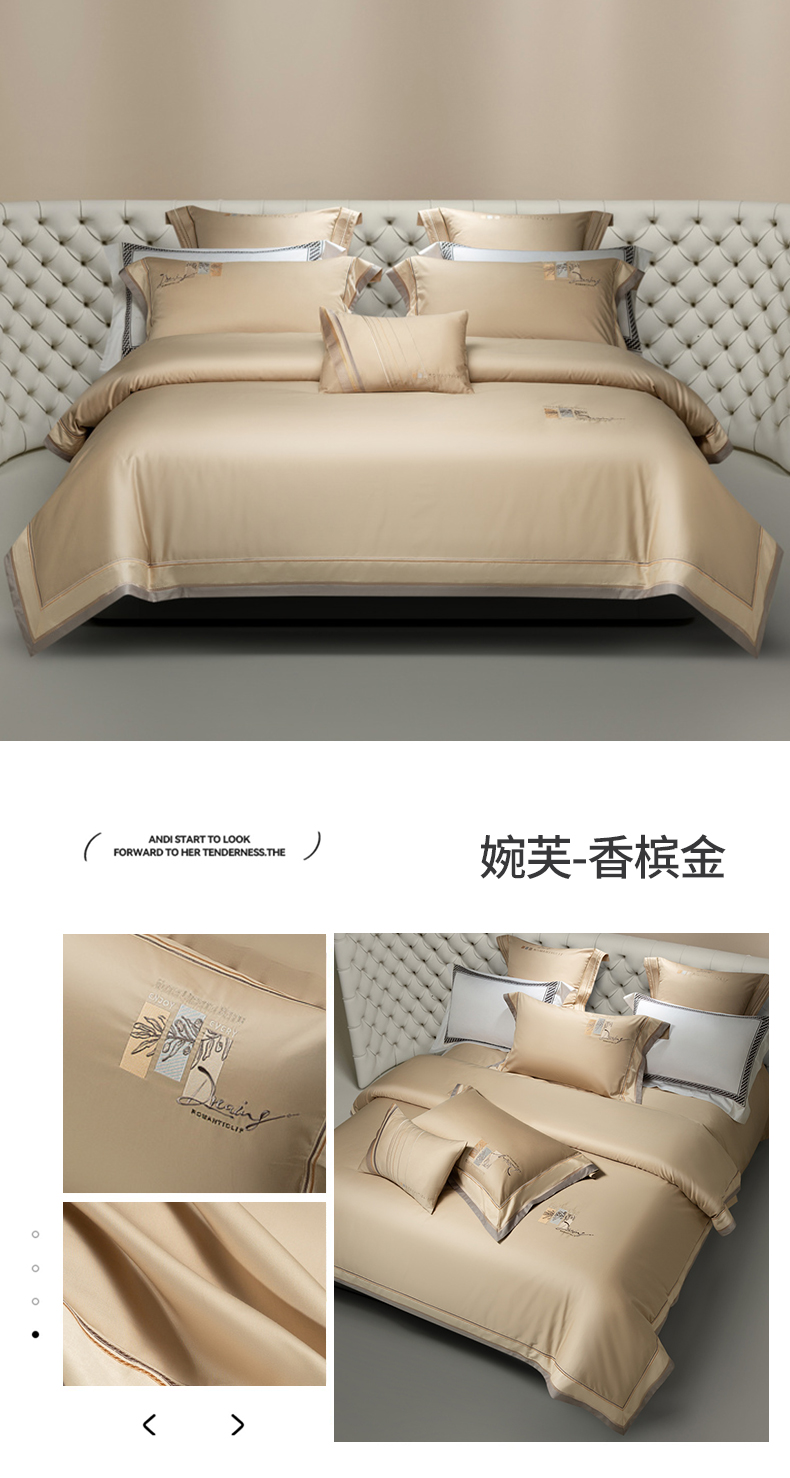 商品名称:高大尚婚庆馆 2025春夏新款 长绒棉高端绣花四件套-婉芙 香槟金