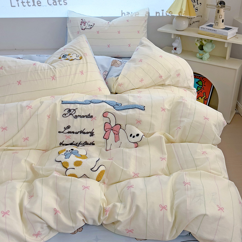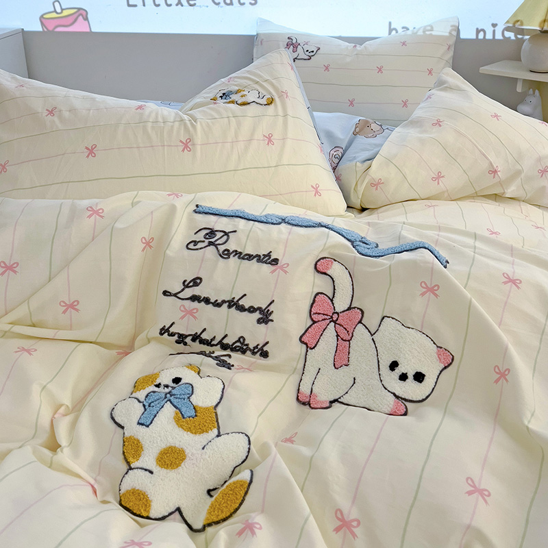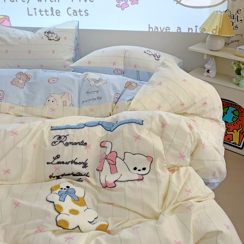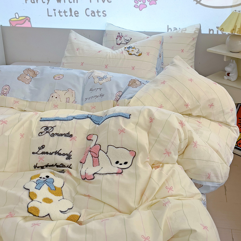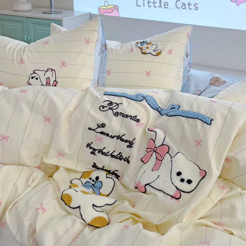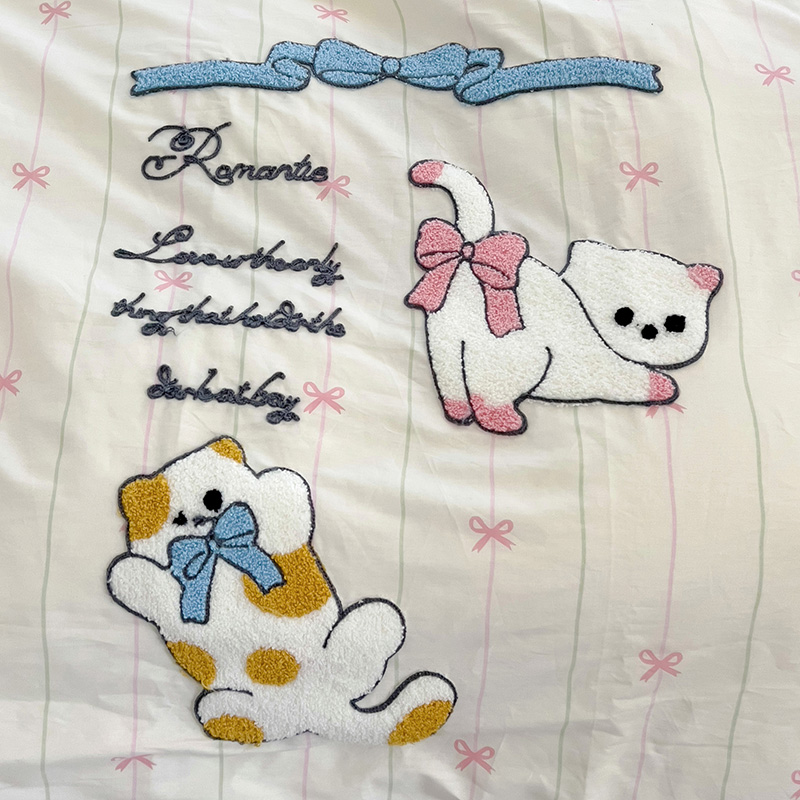云锦家居 2025新款13370纯棉毛巾绣呆萌系列四件套 奶蓝喵喵-蓝