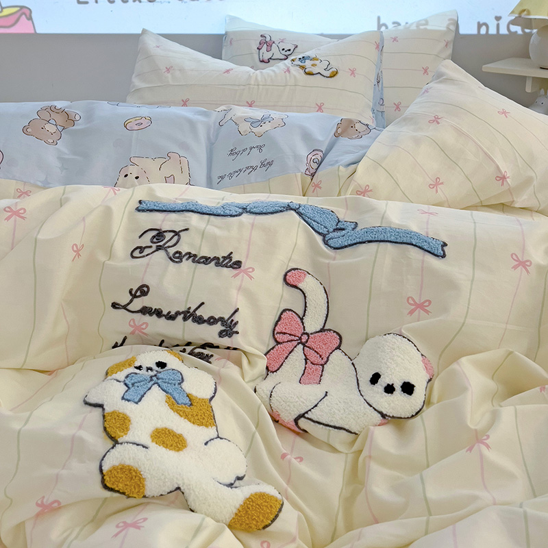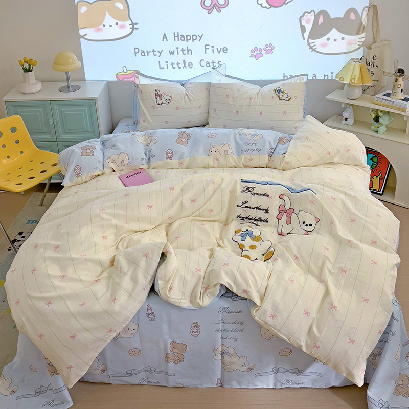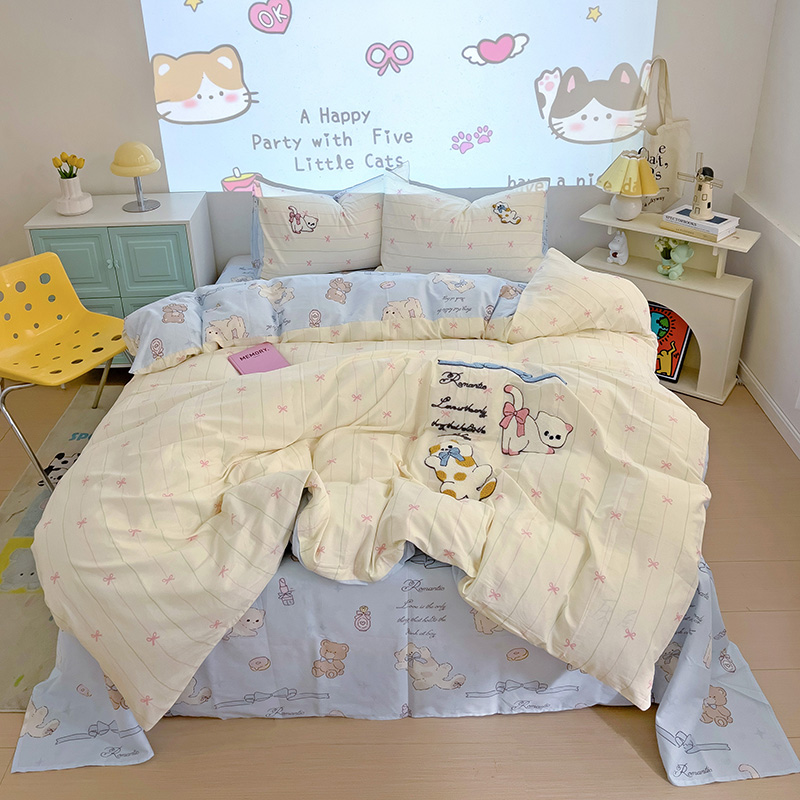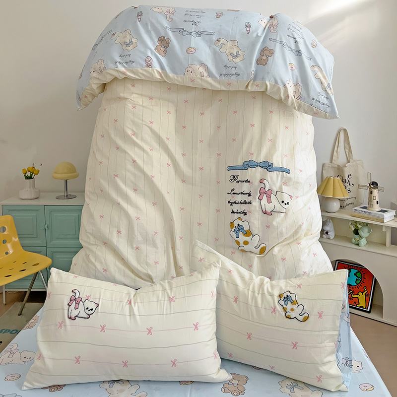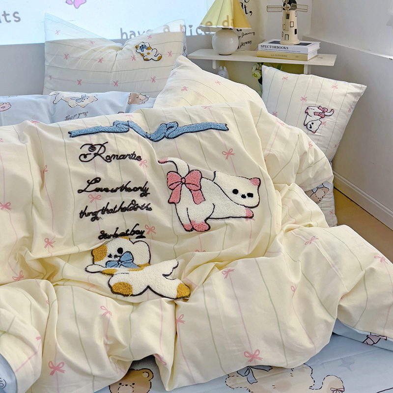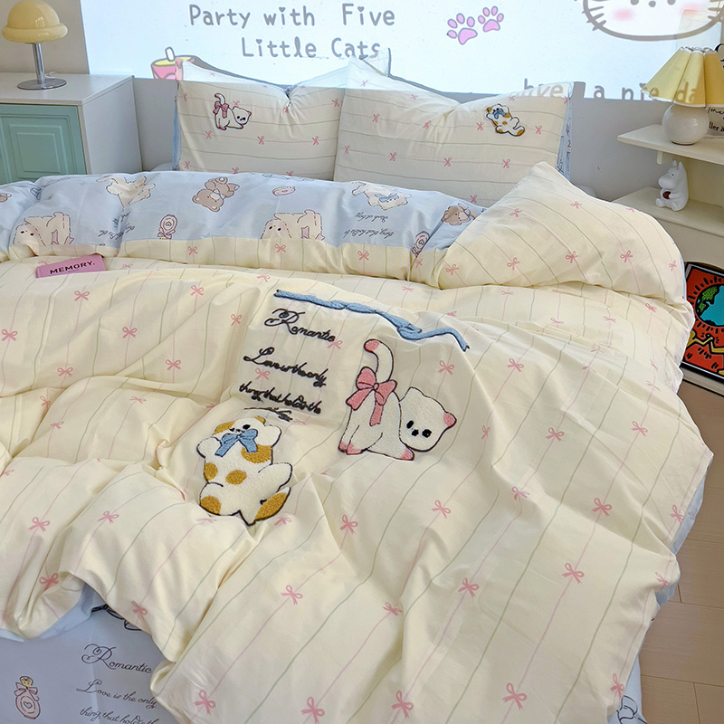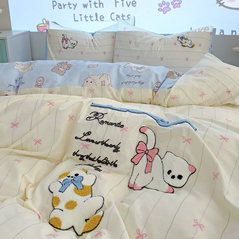 云锦家居 2025新款13370纯棉毛巾绣呆萌系列四件套 奶蓝喵喵-蓝