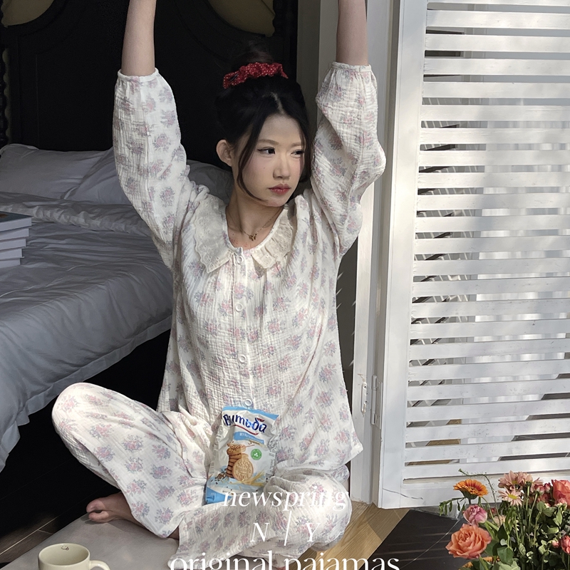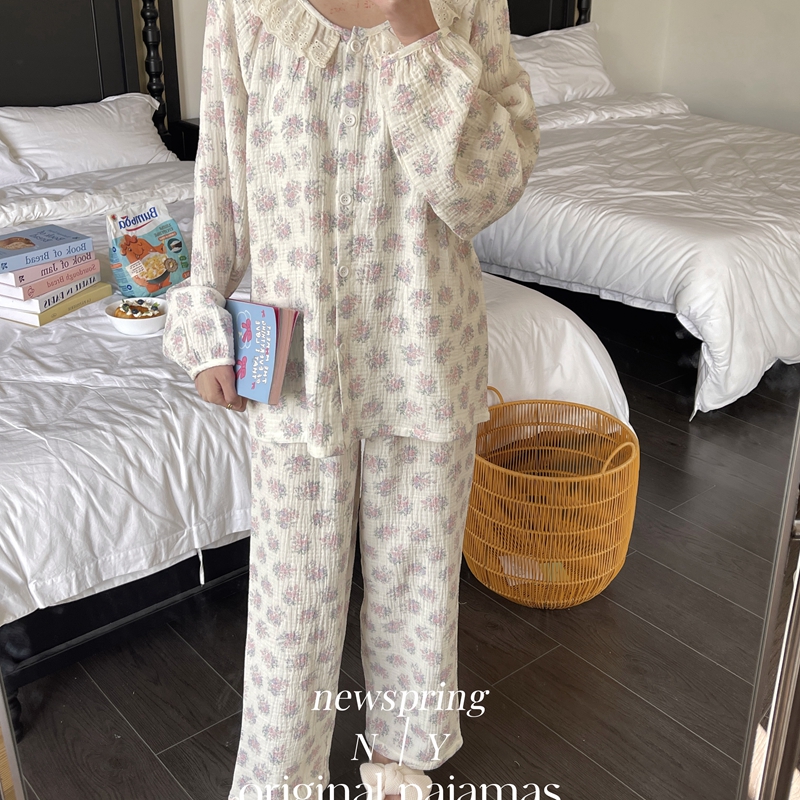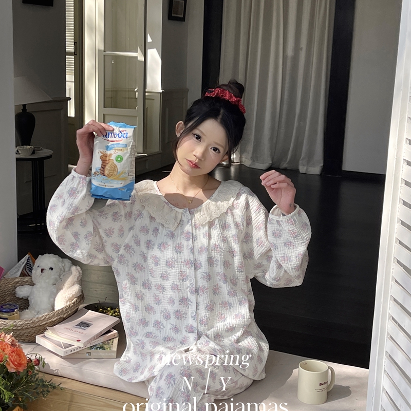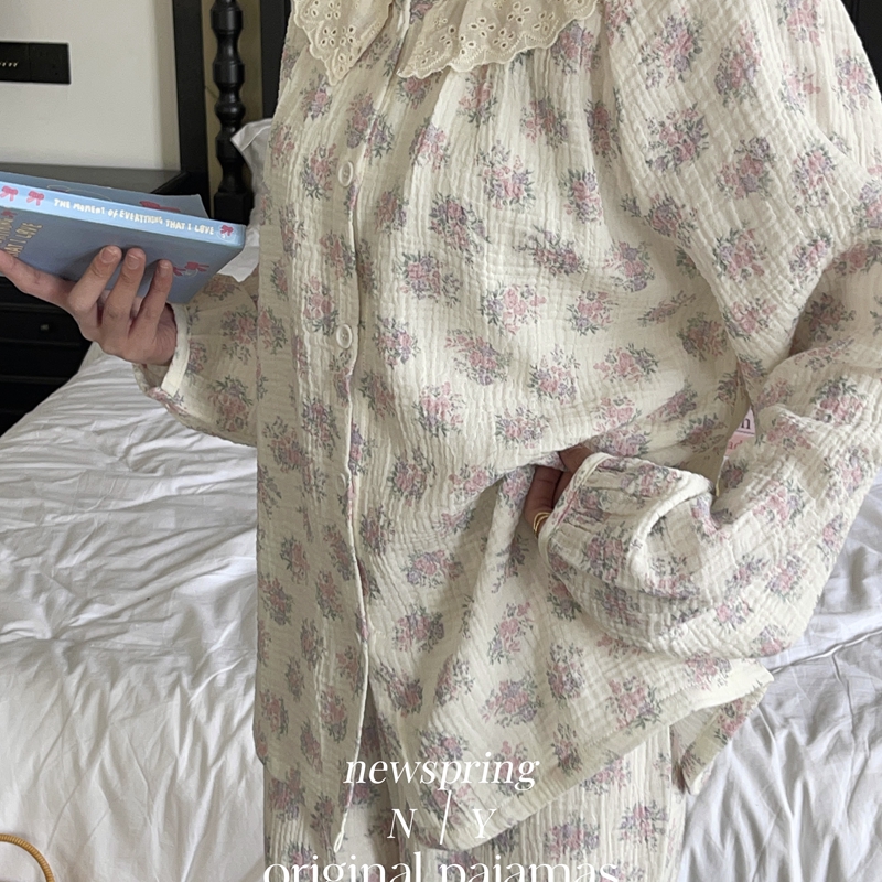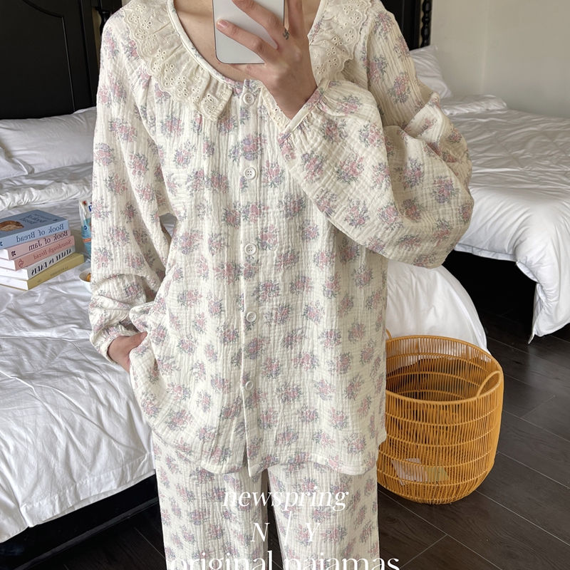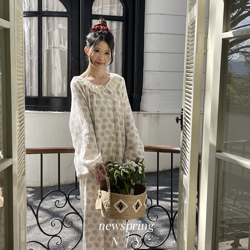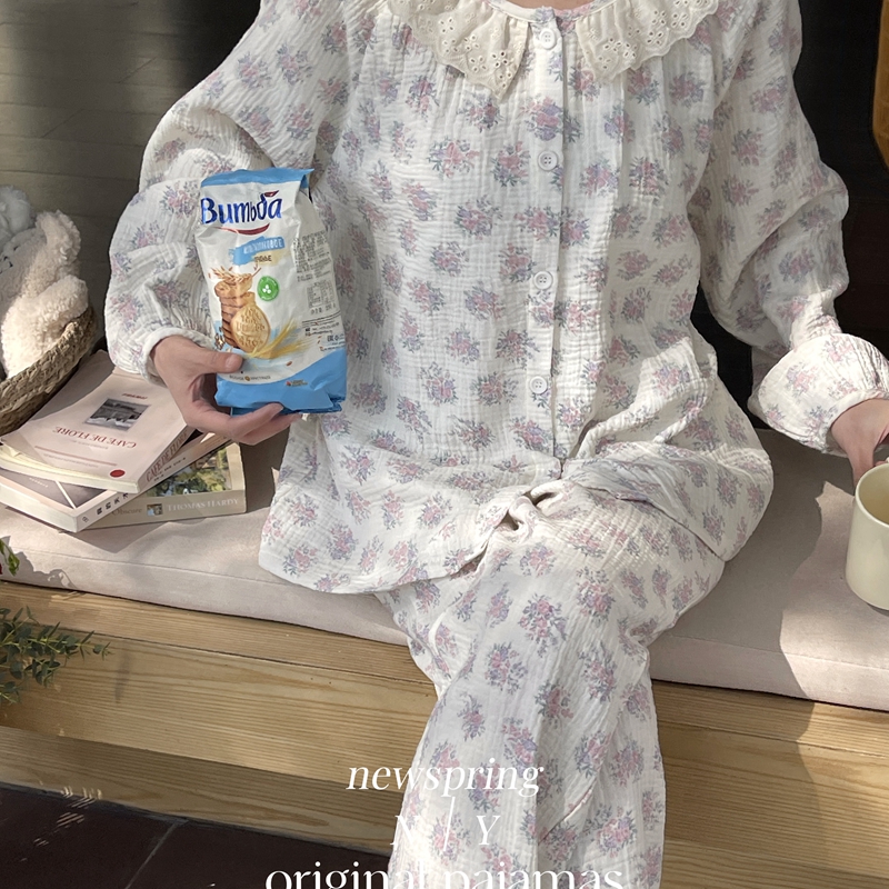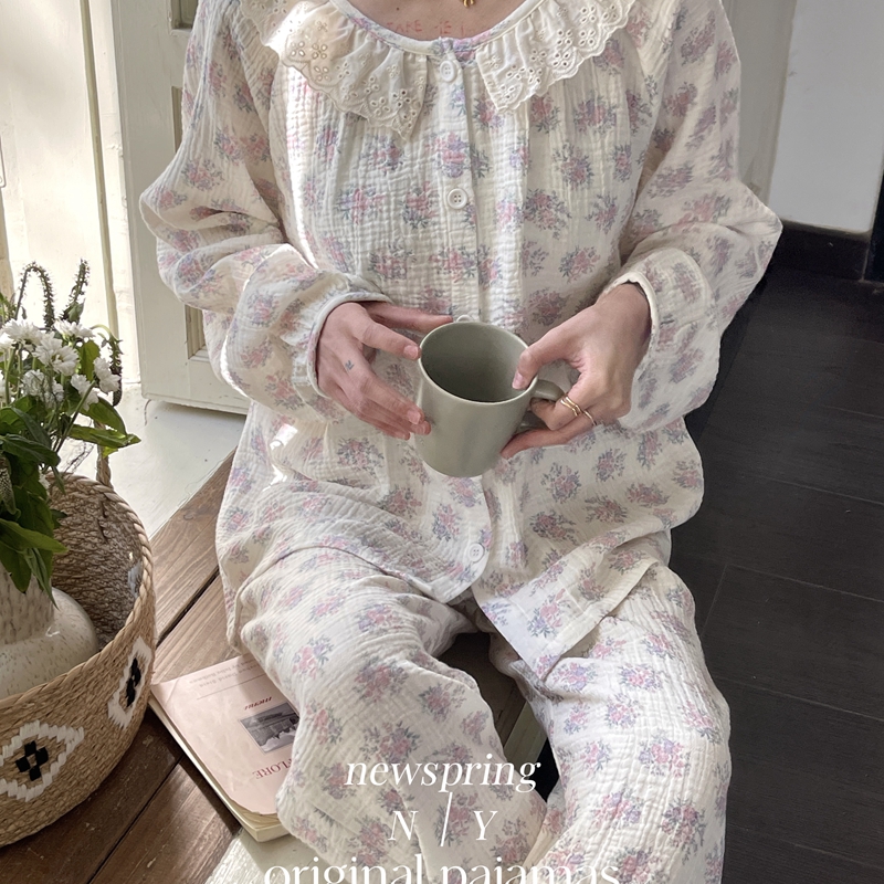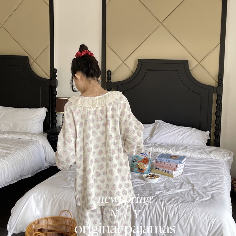 纽约生活 韩系婴儿棉纱皱皱纱双层纱碎花圆领蕾丝家居服睡衣 莫奈花园