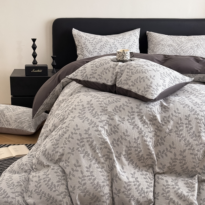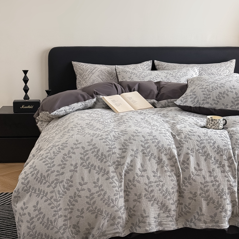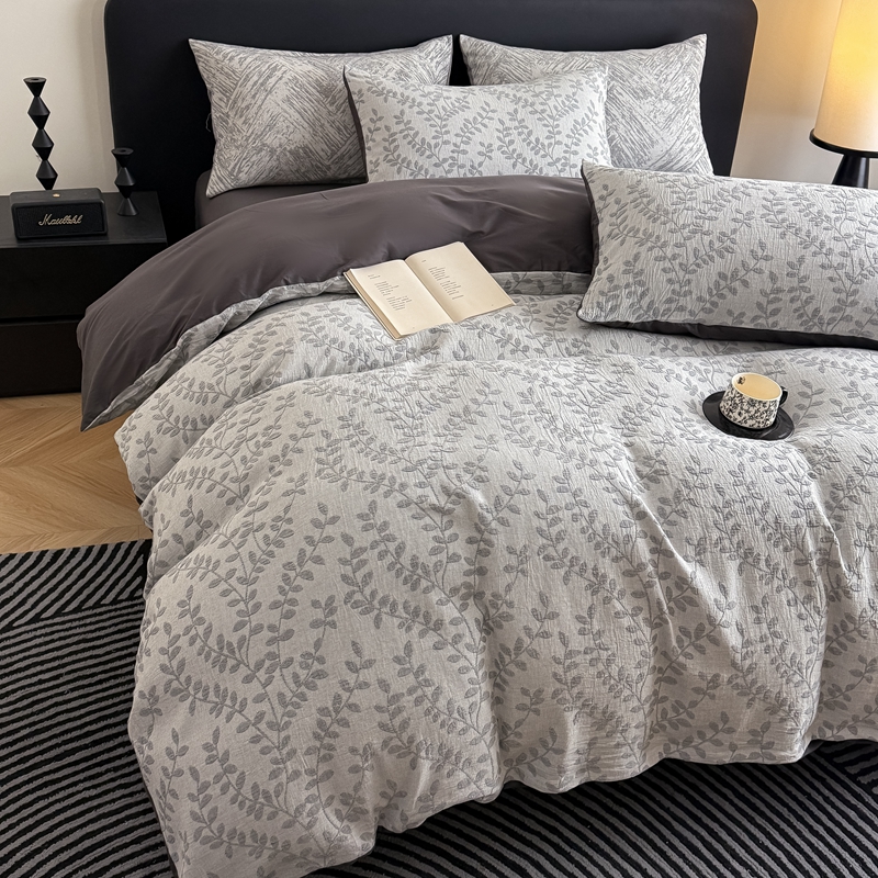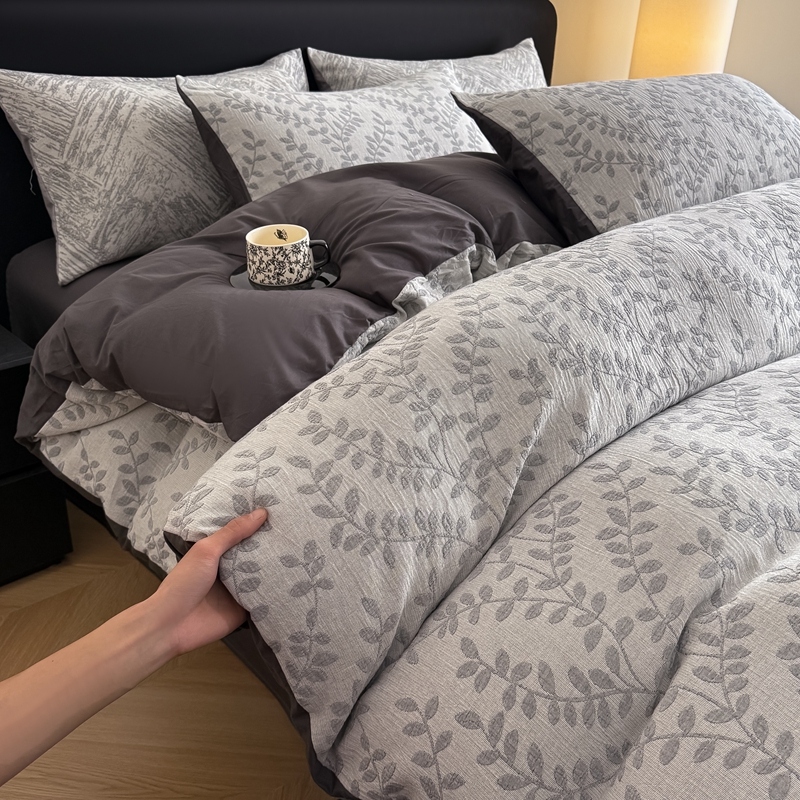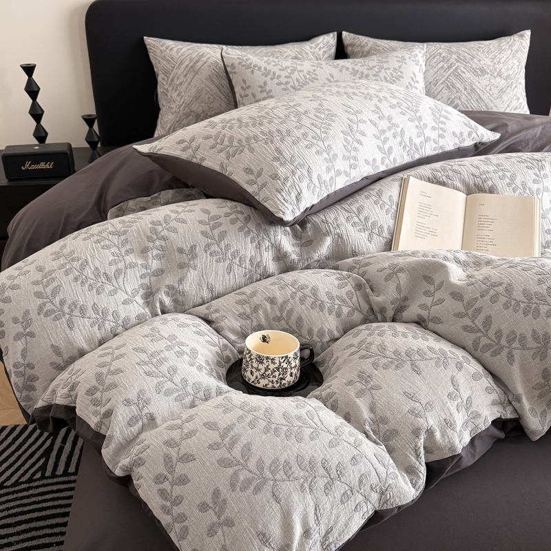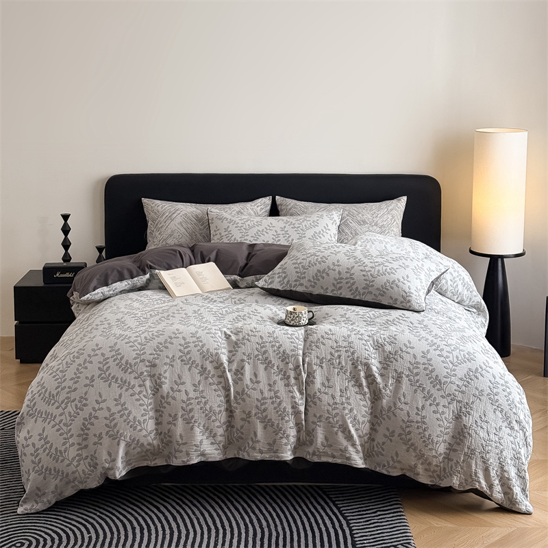 水云缦 2025新款水云缦全棉三层纱色织大提花四件套 叶茂-深灰