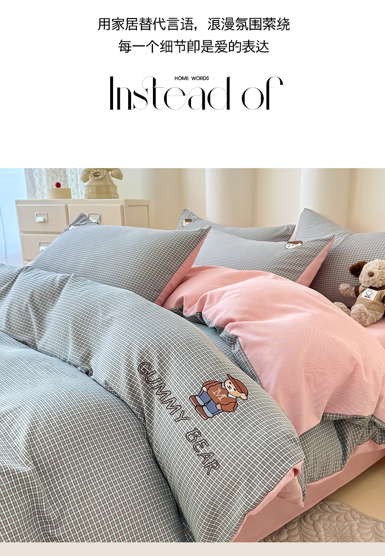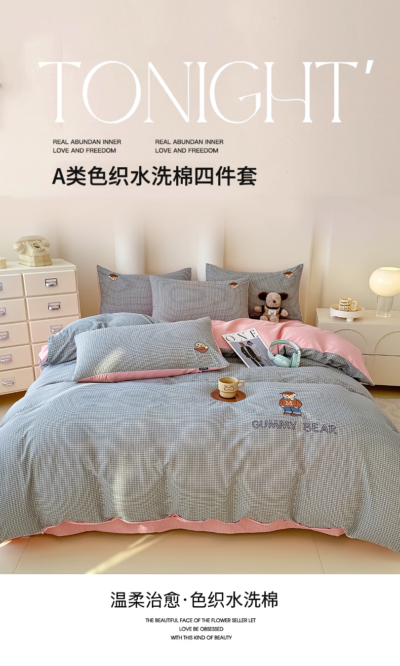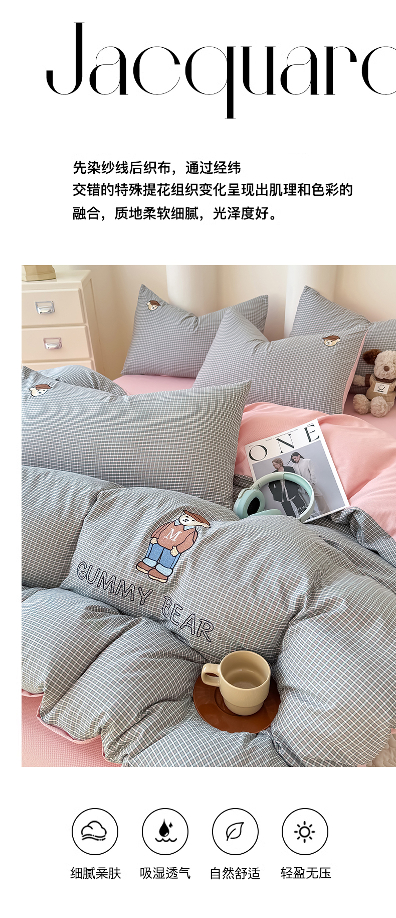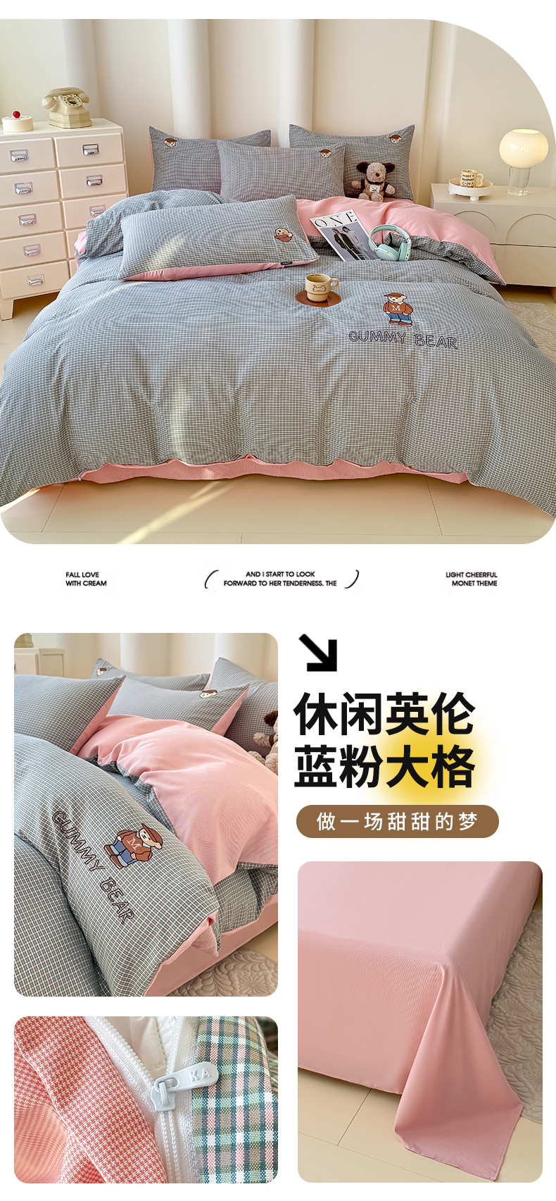 KA家纺 春夏新款A类色织水洗棉四件套 休闲英伦蓝粉大格