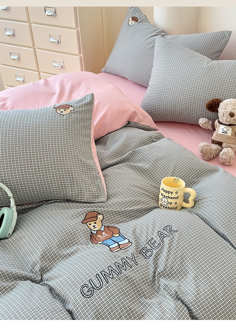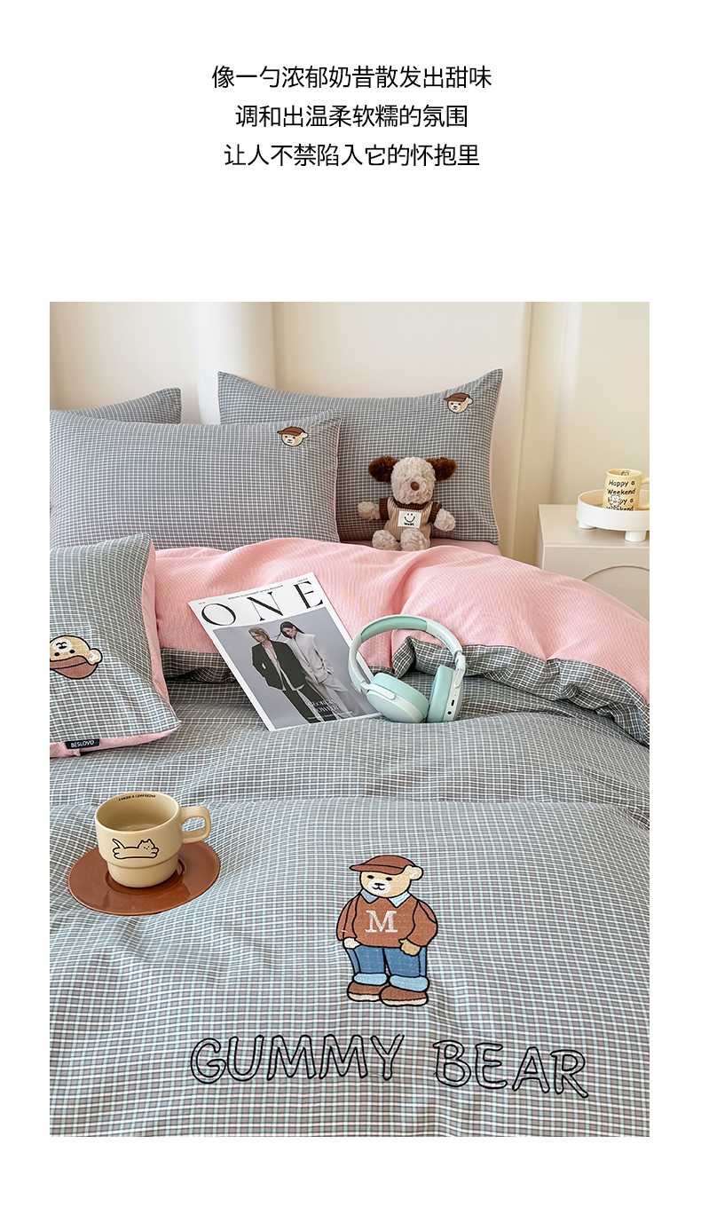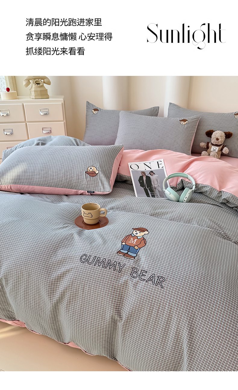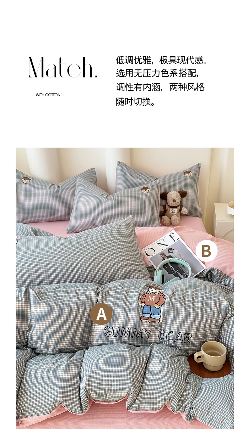KA家纺 春夏新款A类色织水洗棉四件套 休闲英伦蓝粉大格