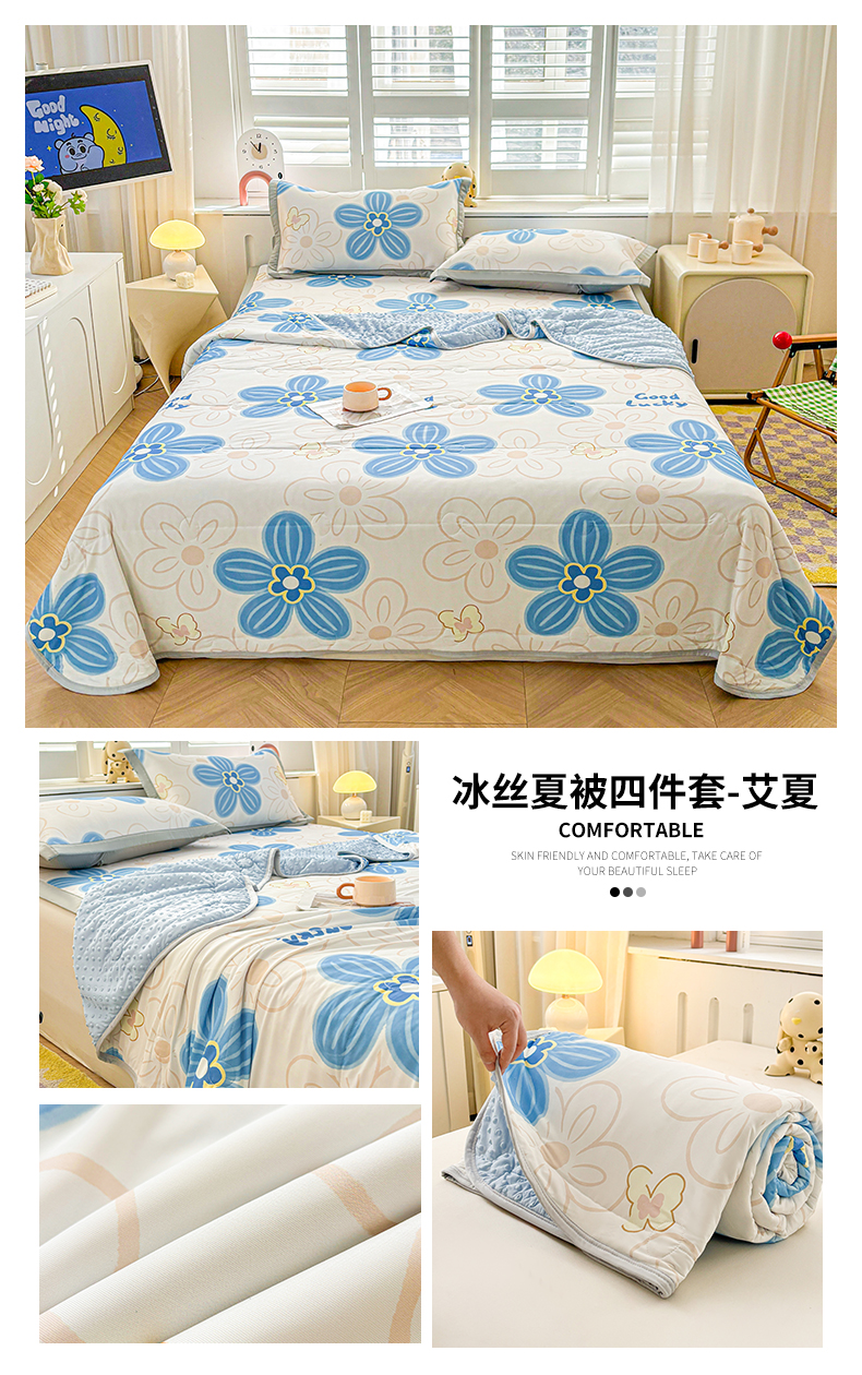 • 91家纺网 家纺一手货源 找家纺 雯豆2025春夏新款凉感丝夏被空调被子印花A类卡通小清新夏被 冰丝夏被四件套-艾夏