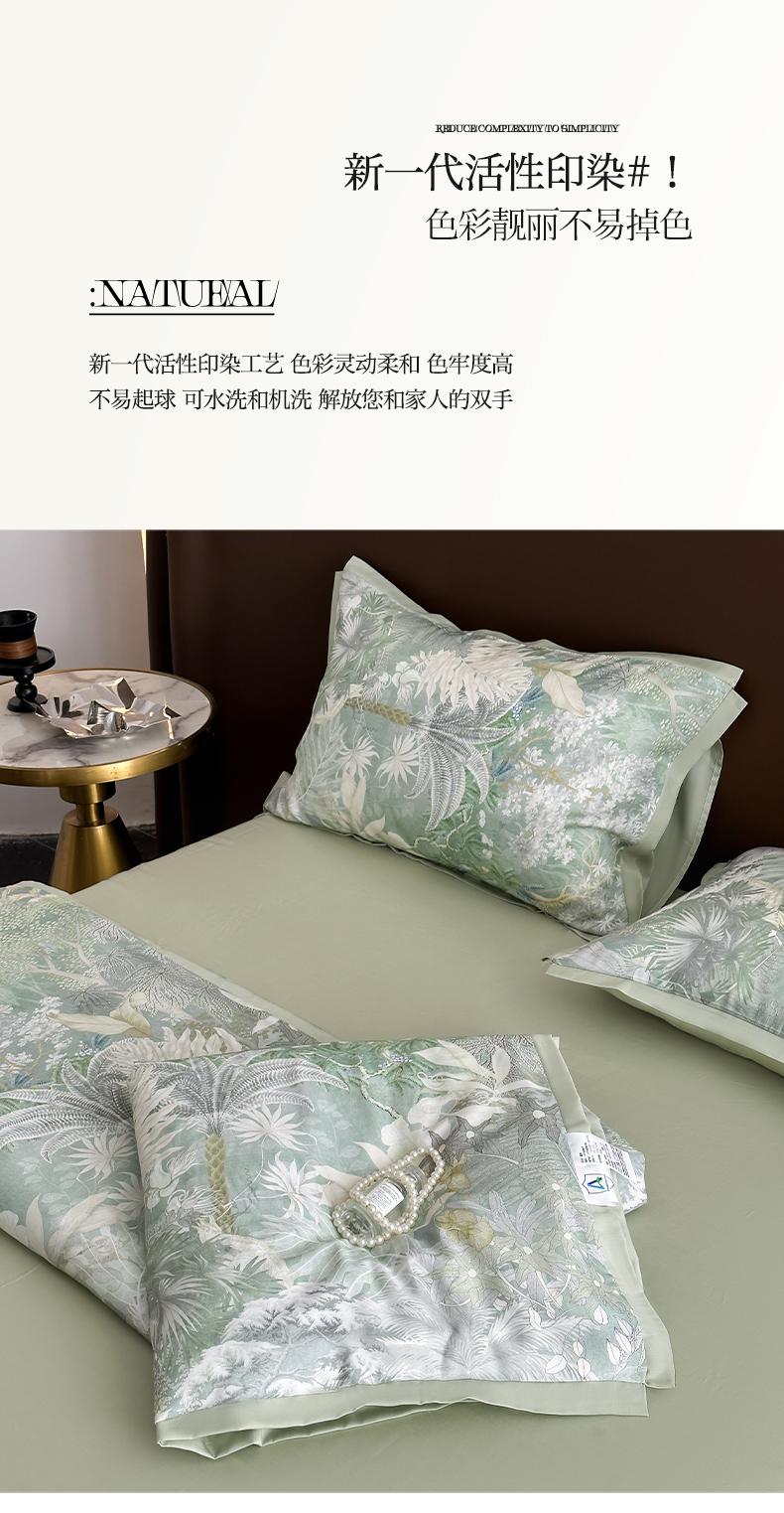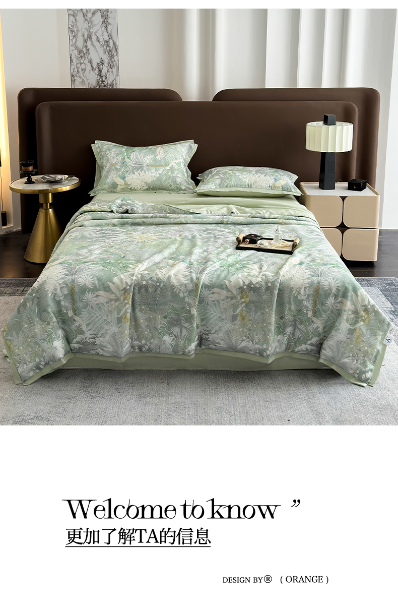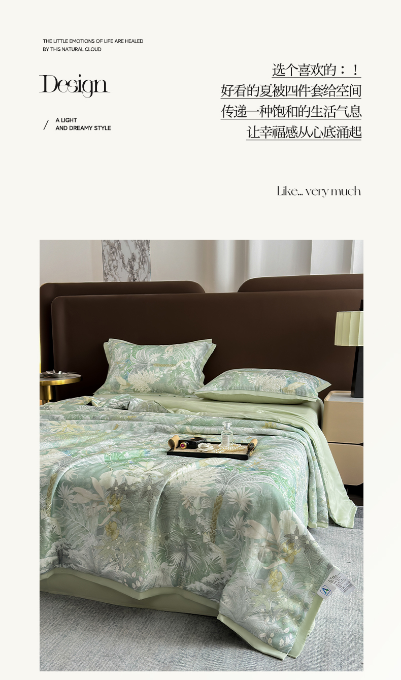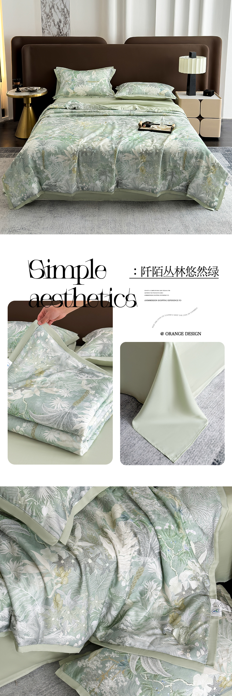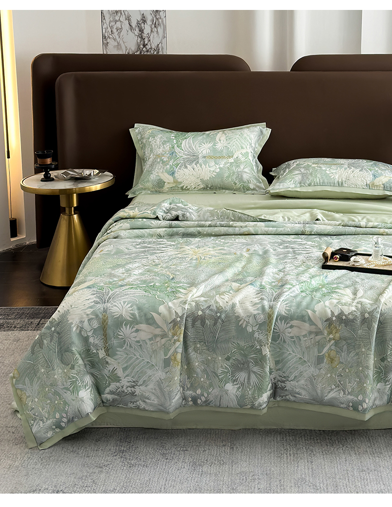 当前位置: 91家纺网 > 商品网购 > 床品套件 > 四件套 > 夏被四件套 > 莱登卡奴 25新款A类50支100%莱赛尔天丝数码印花夏被四件套 阡陌丛林悠然绿