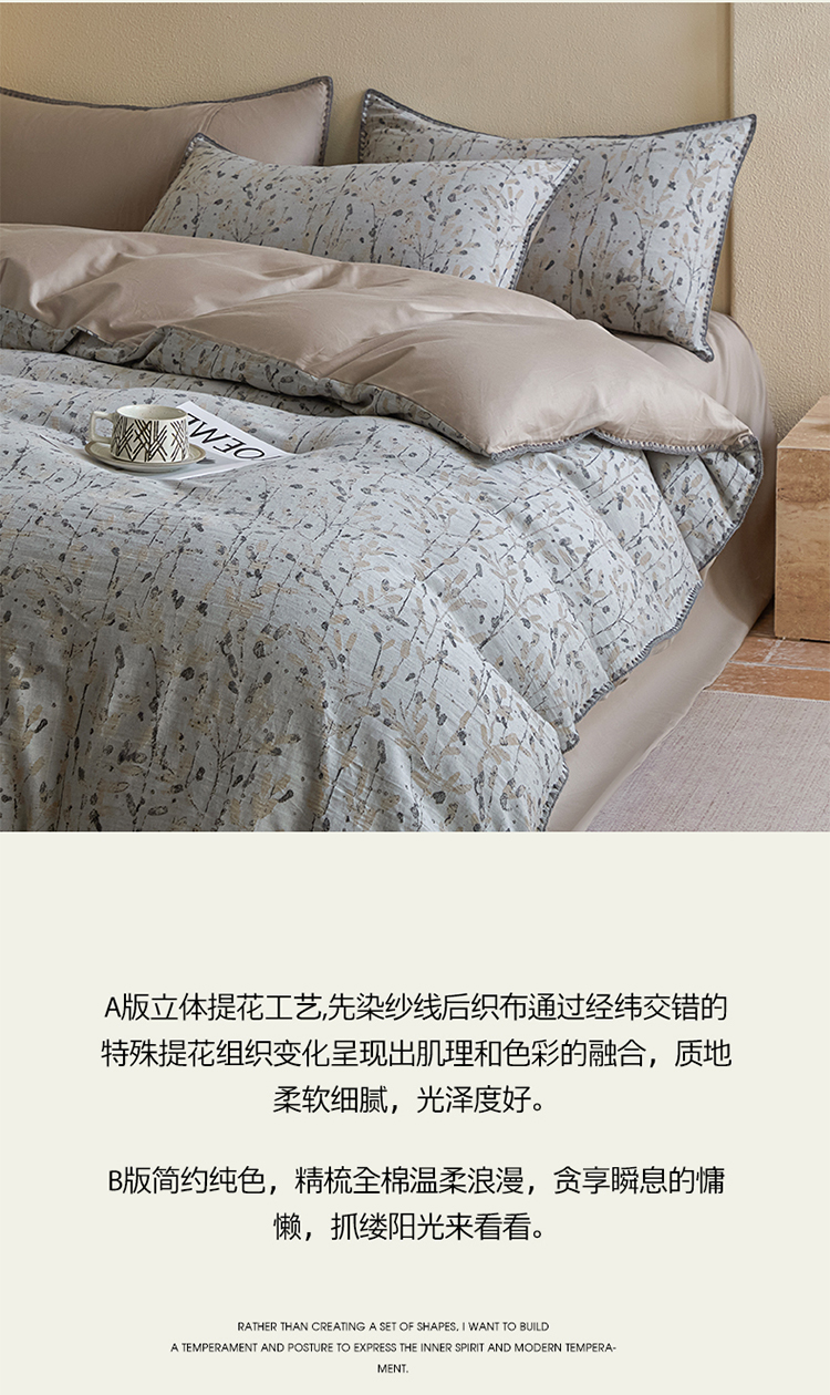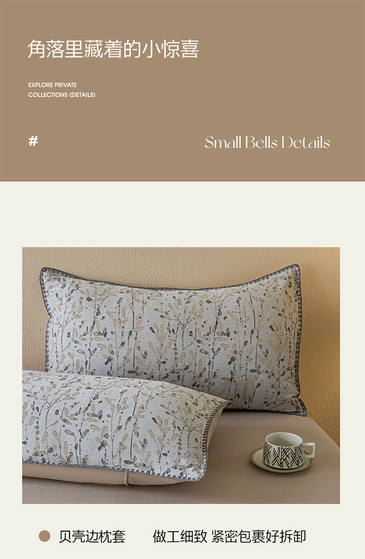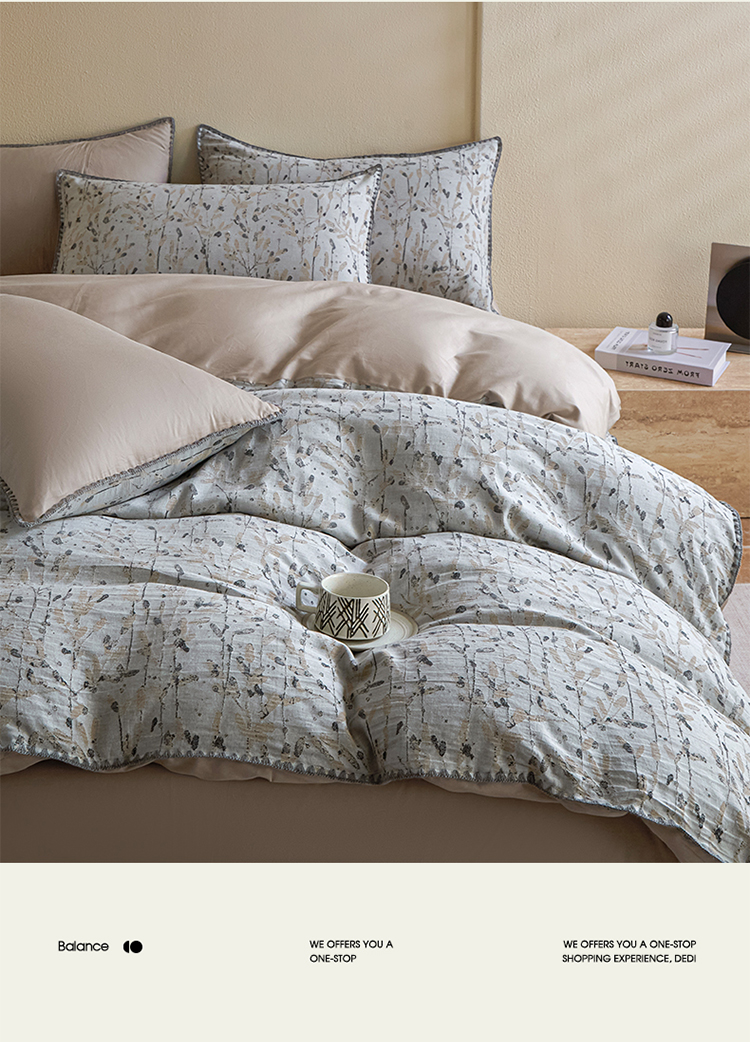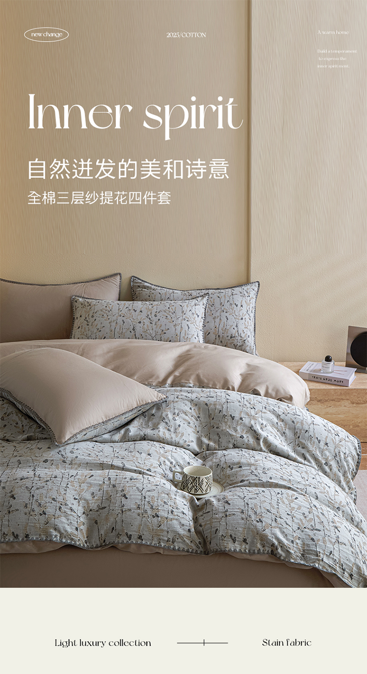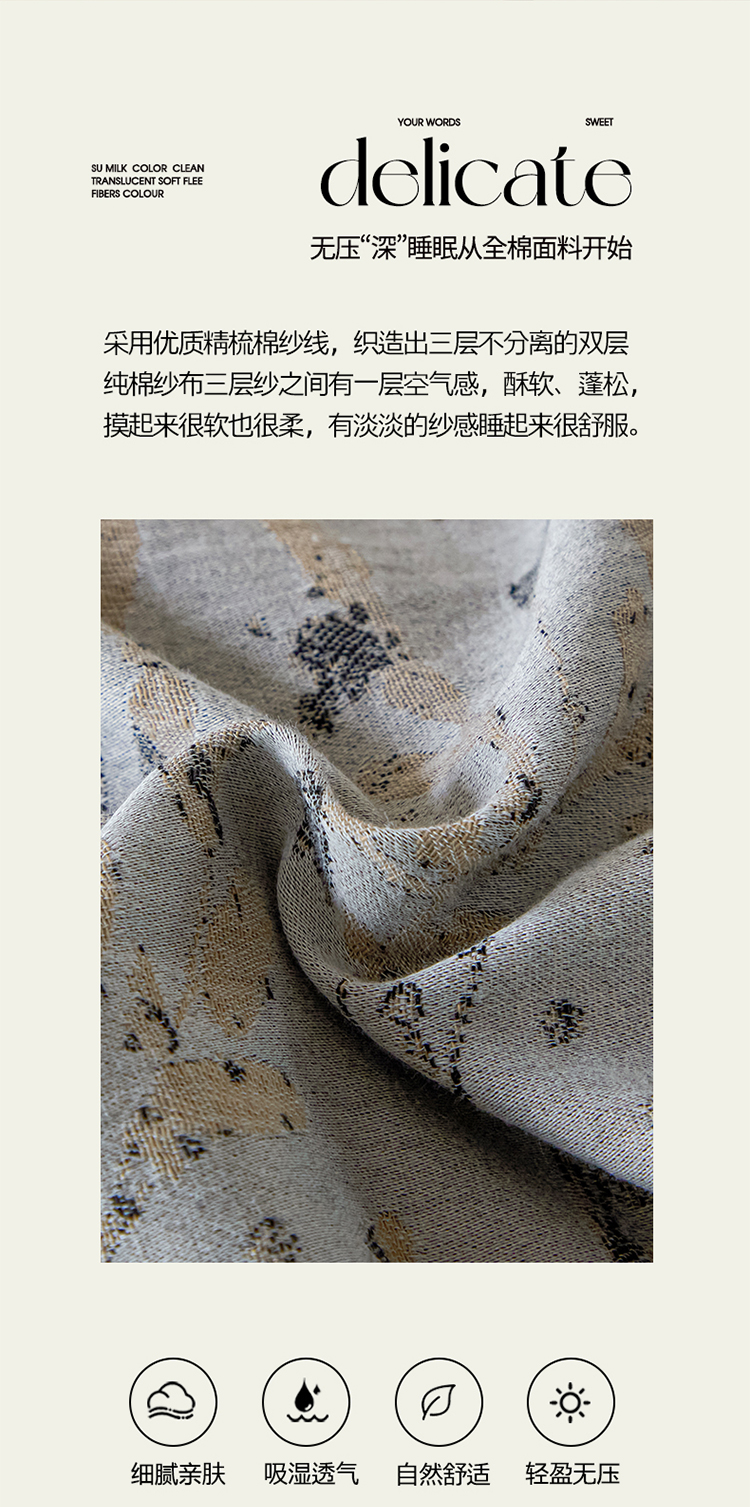 商品名称:2025新款亲肤全棉三层纱提花四件套 叶语-珠子褐