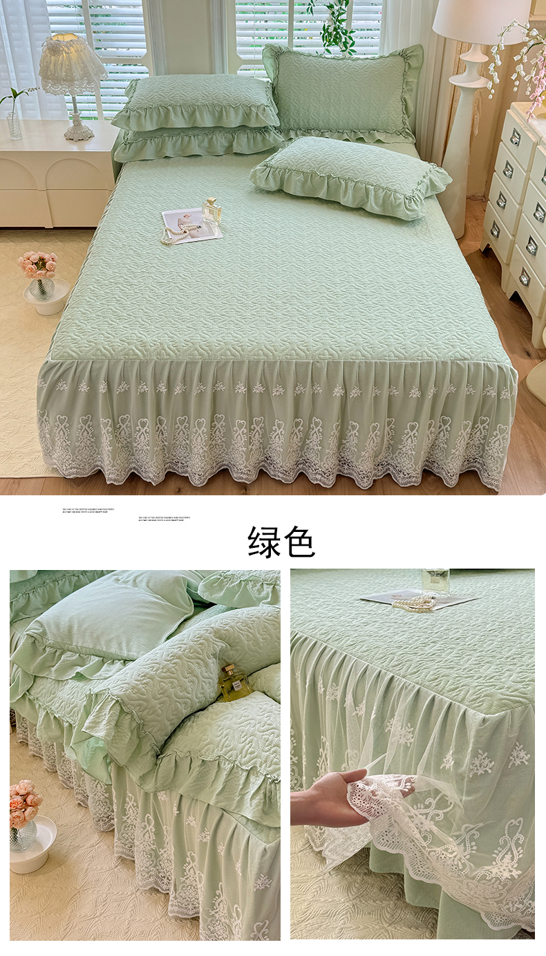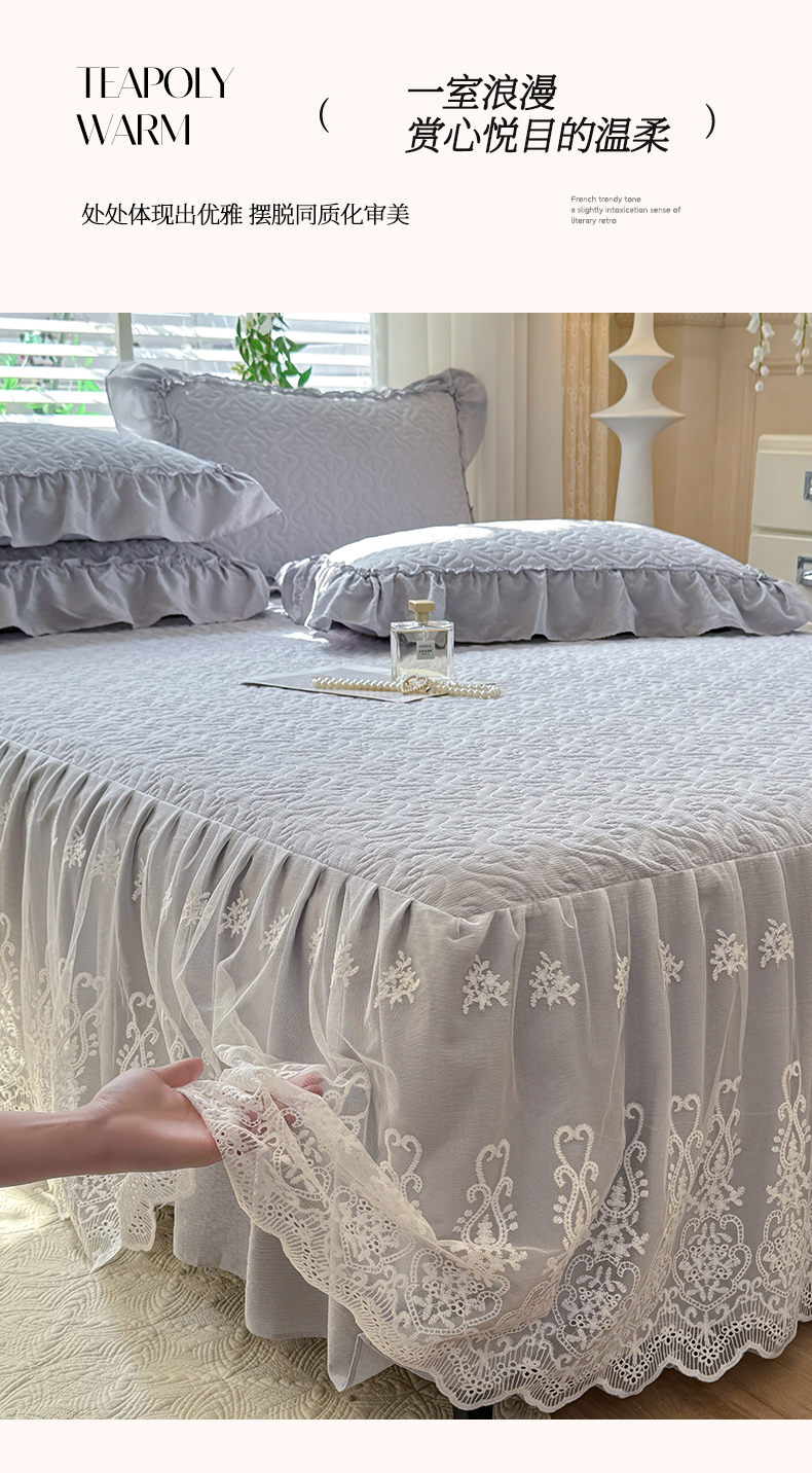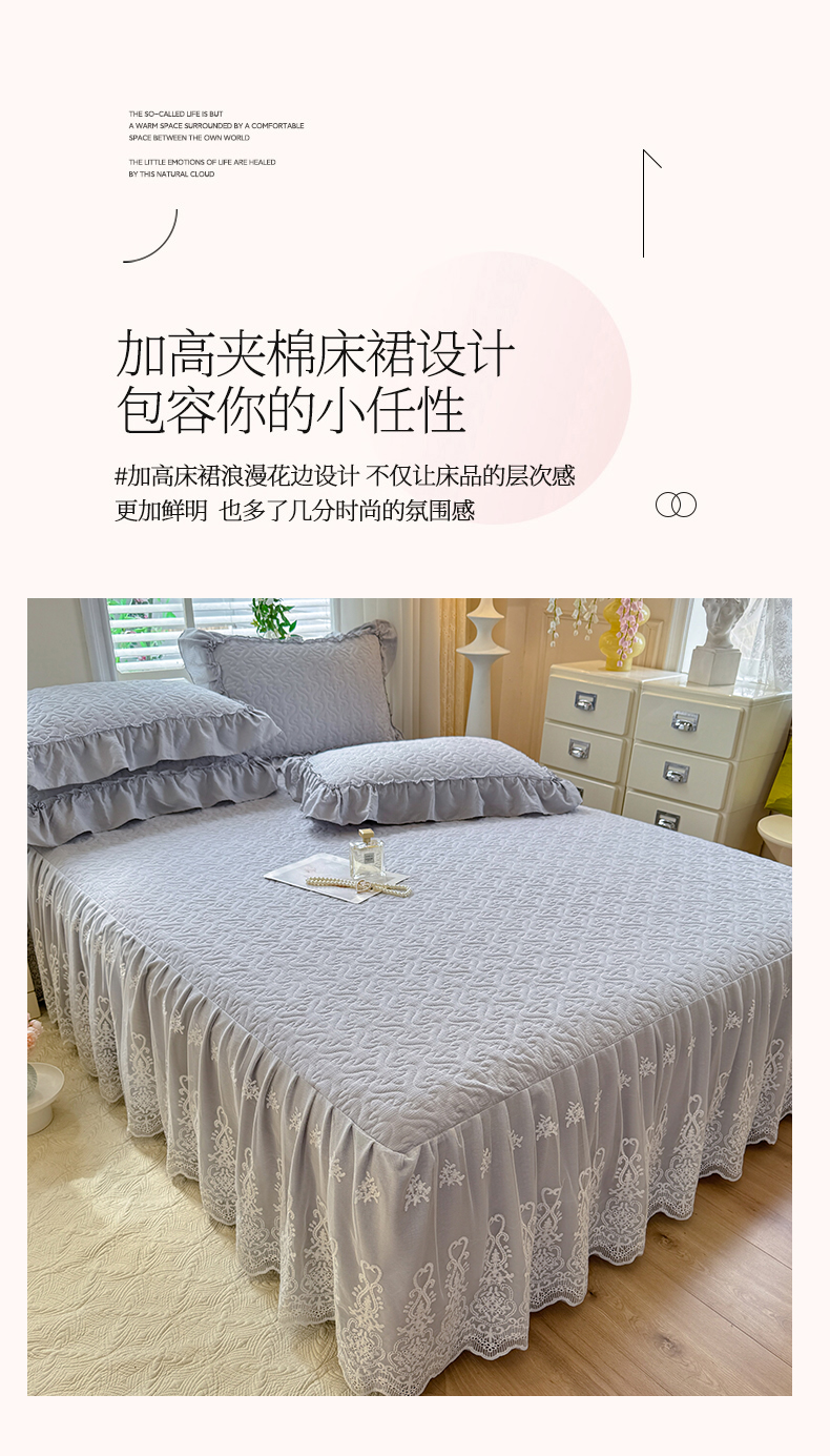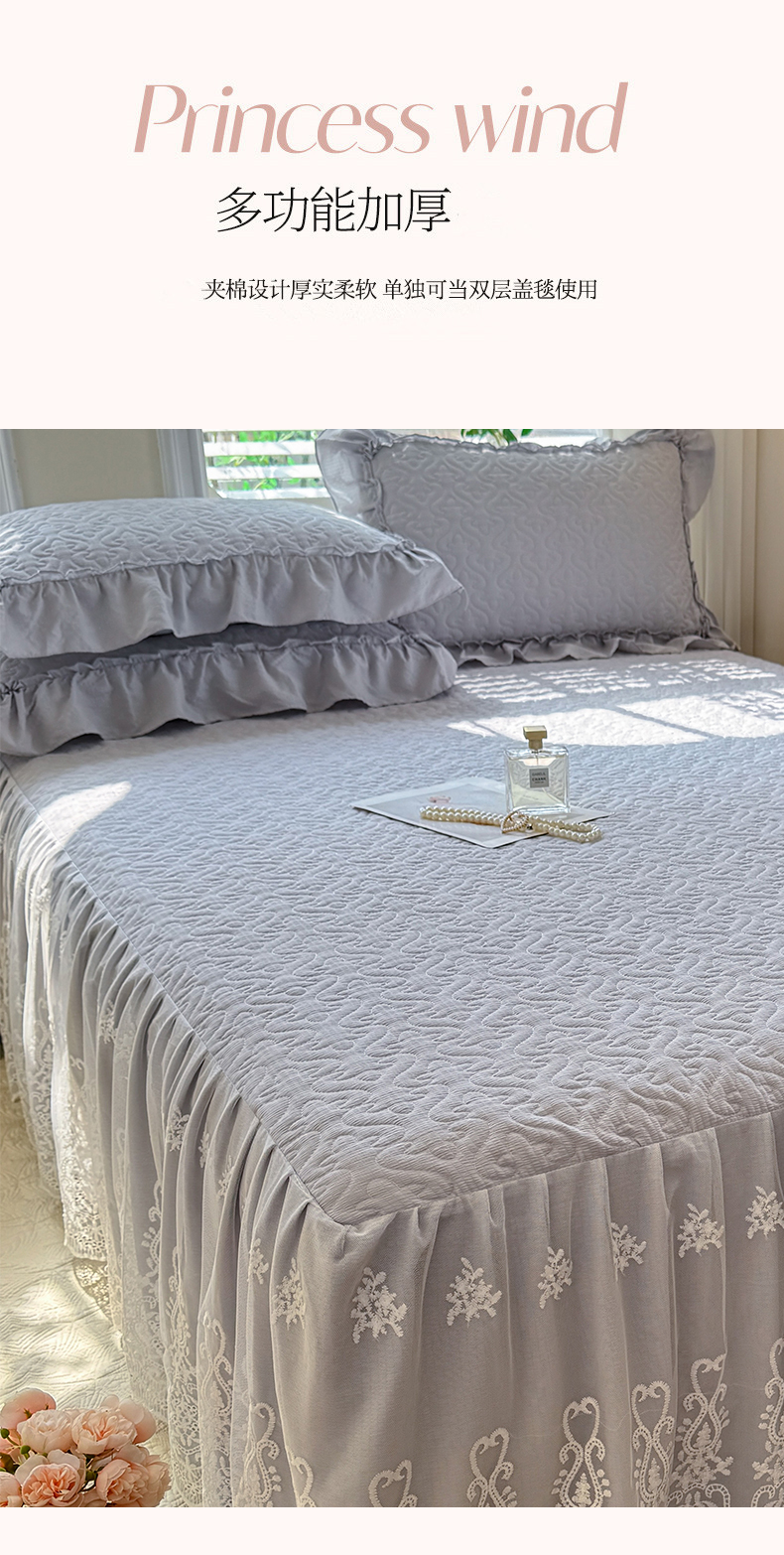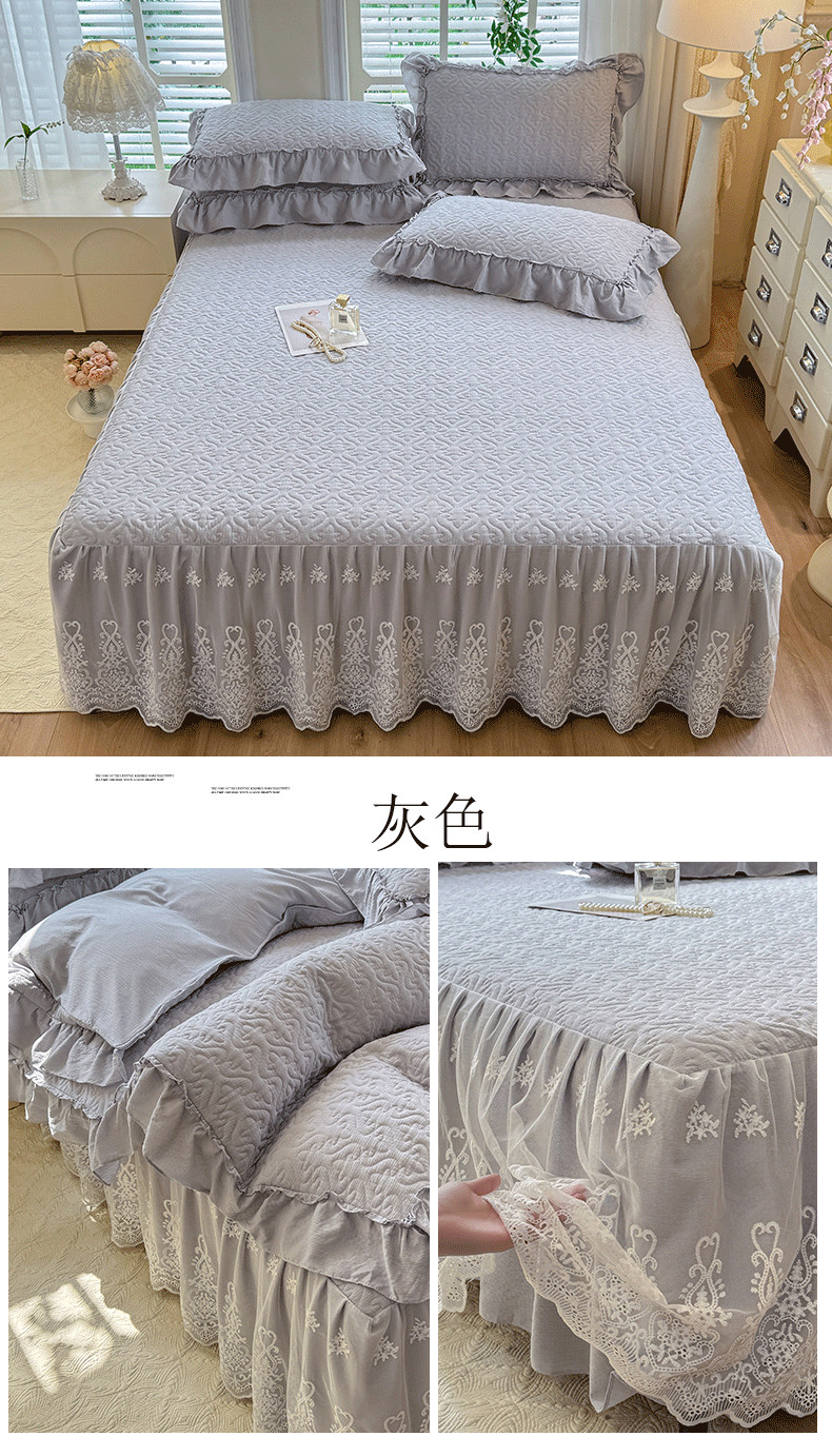 (总)花香四季家纺 2025新款夹棉绗缝床裙单件三件套法式四件套套件蕾丝公主风,灰色,绿色,米色,玉色,紫色