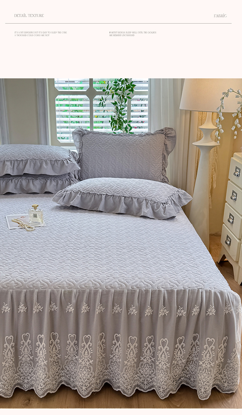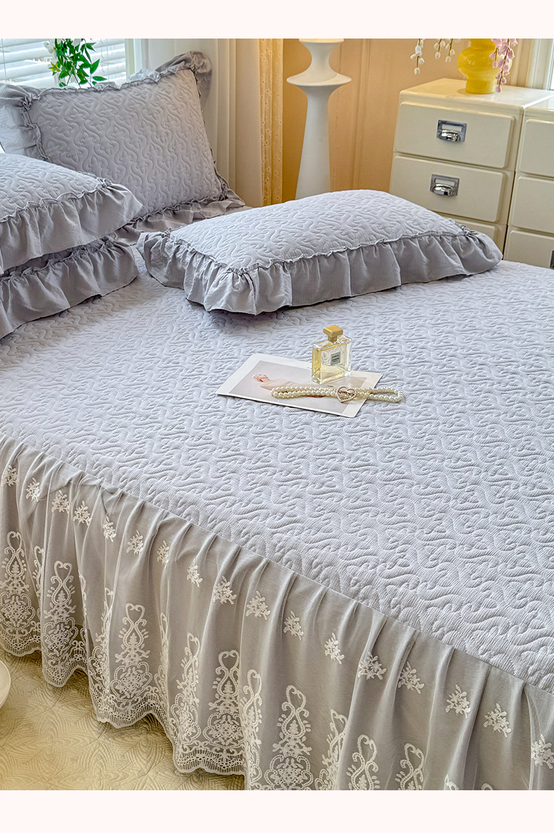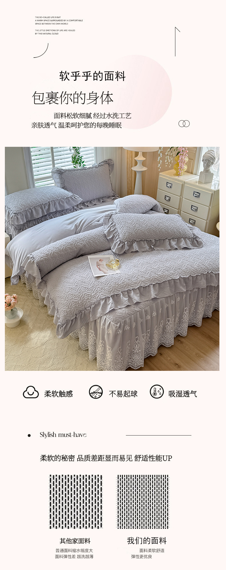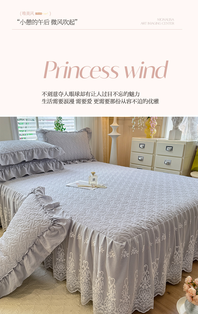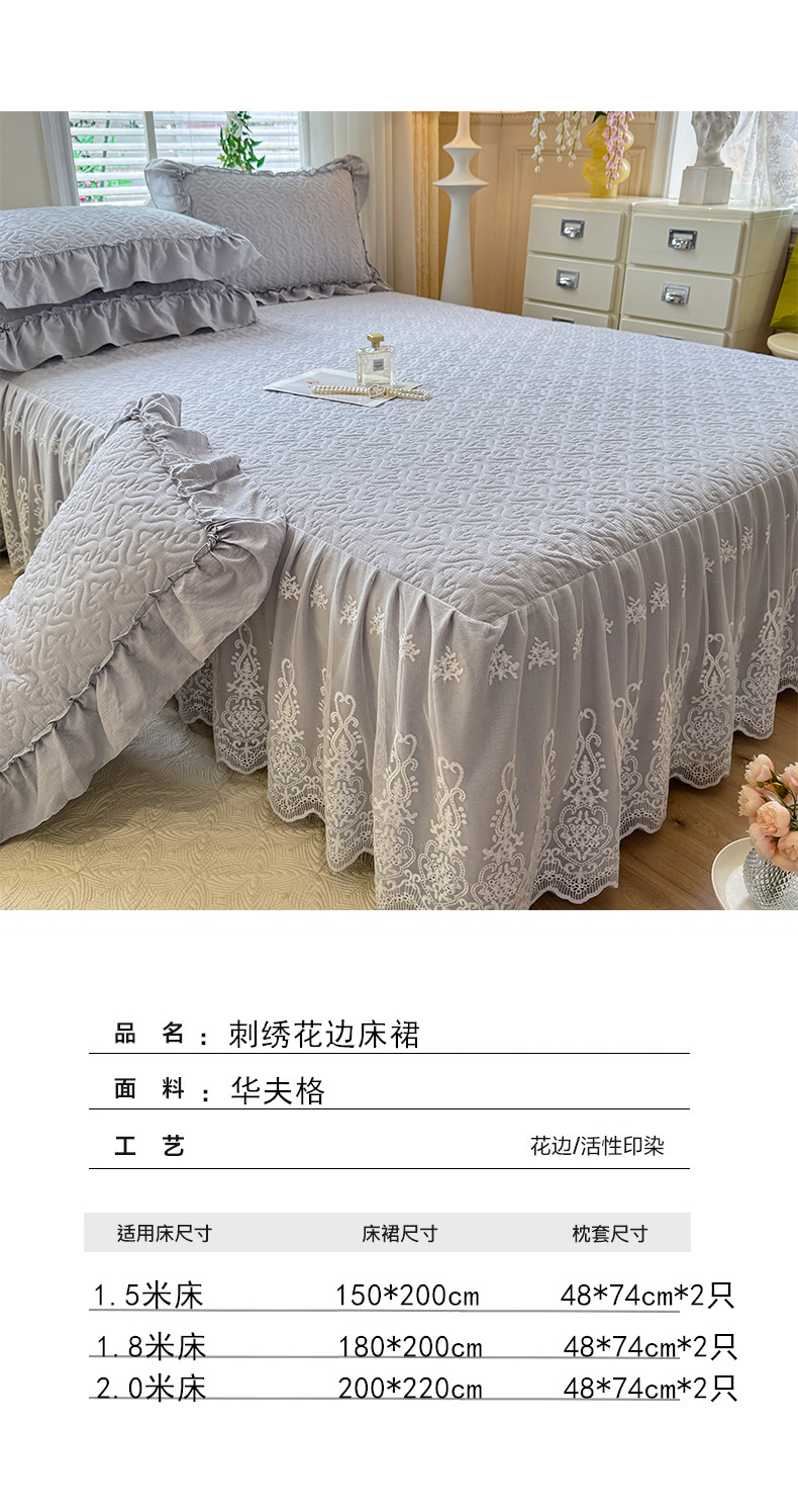 (总)花香四季家纺 2025新款夹棉绗缝床裙单件三件套法式四件套套件蕾丝公主风,灰色,绿色,米色,玉色,紫色