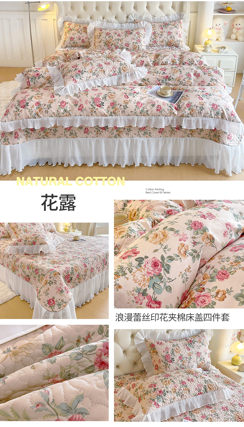 宜凡家纺2025新款雪纺花边印花夹棉床盖三件套四件套 花露