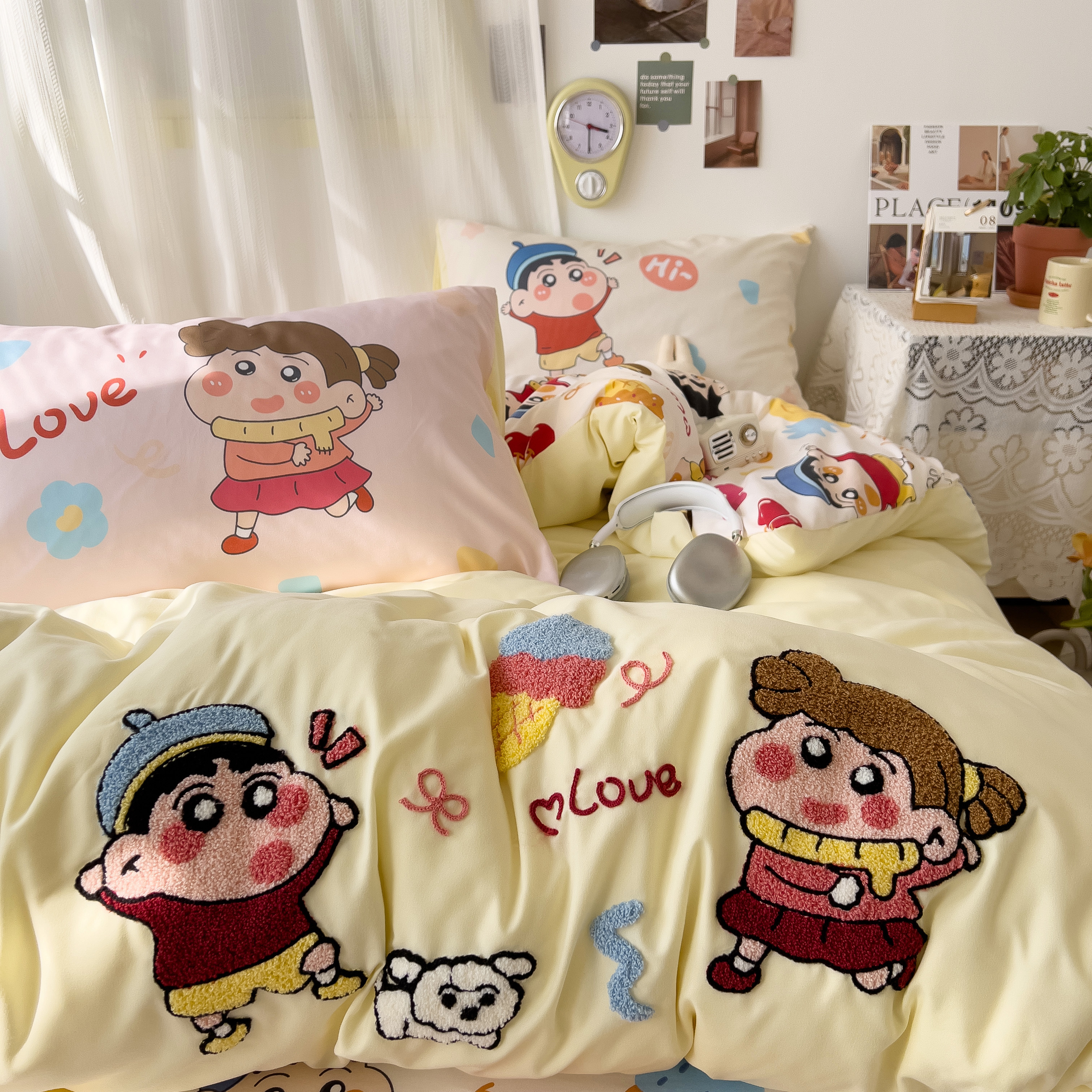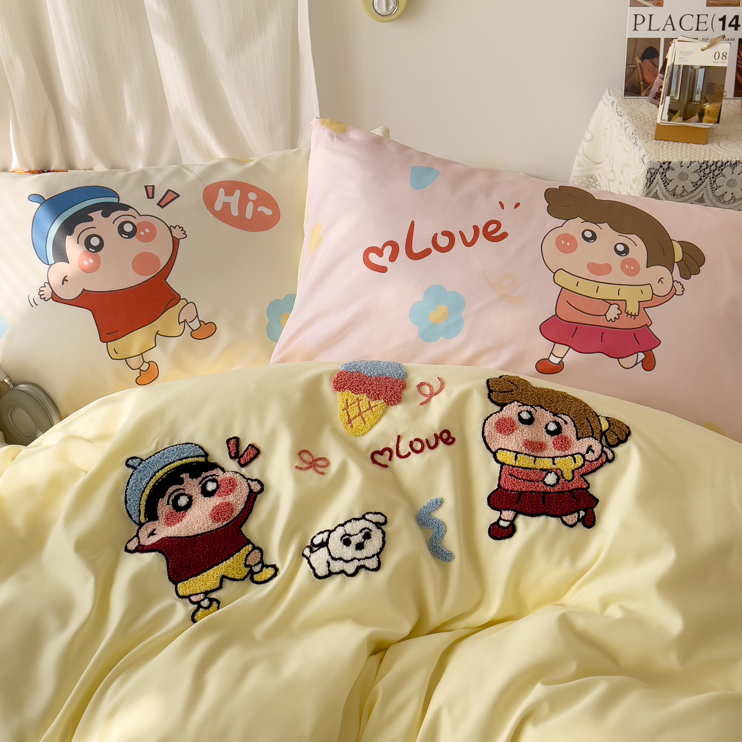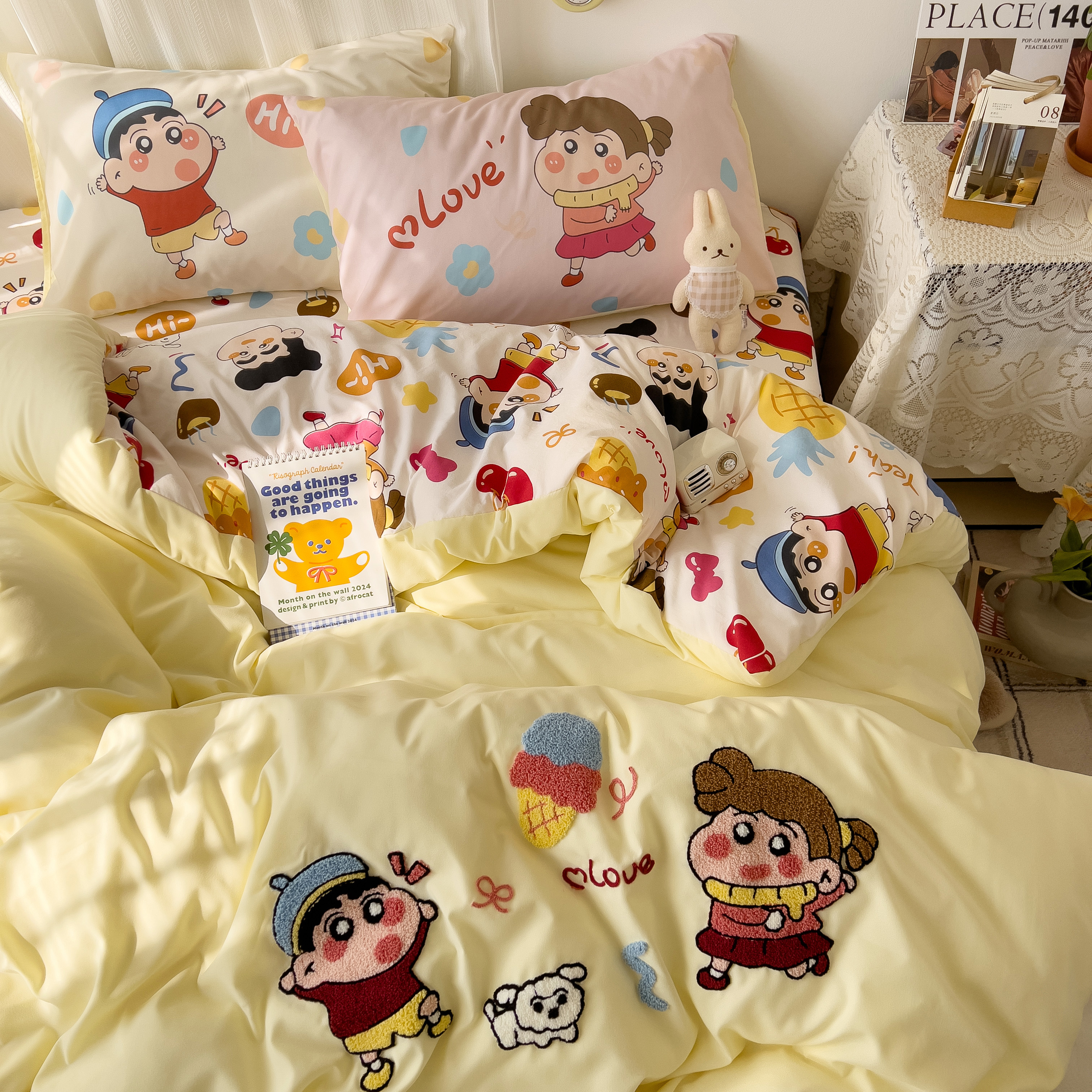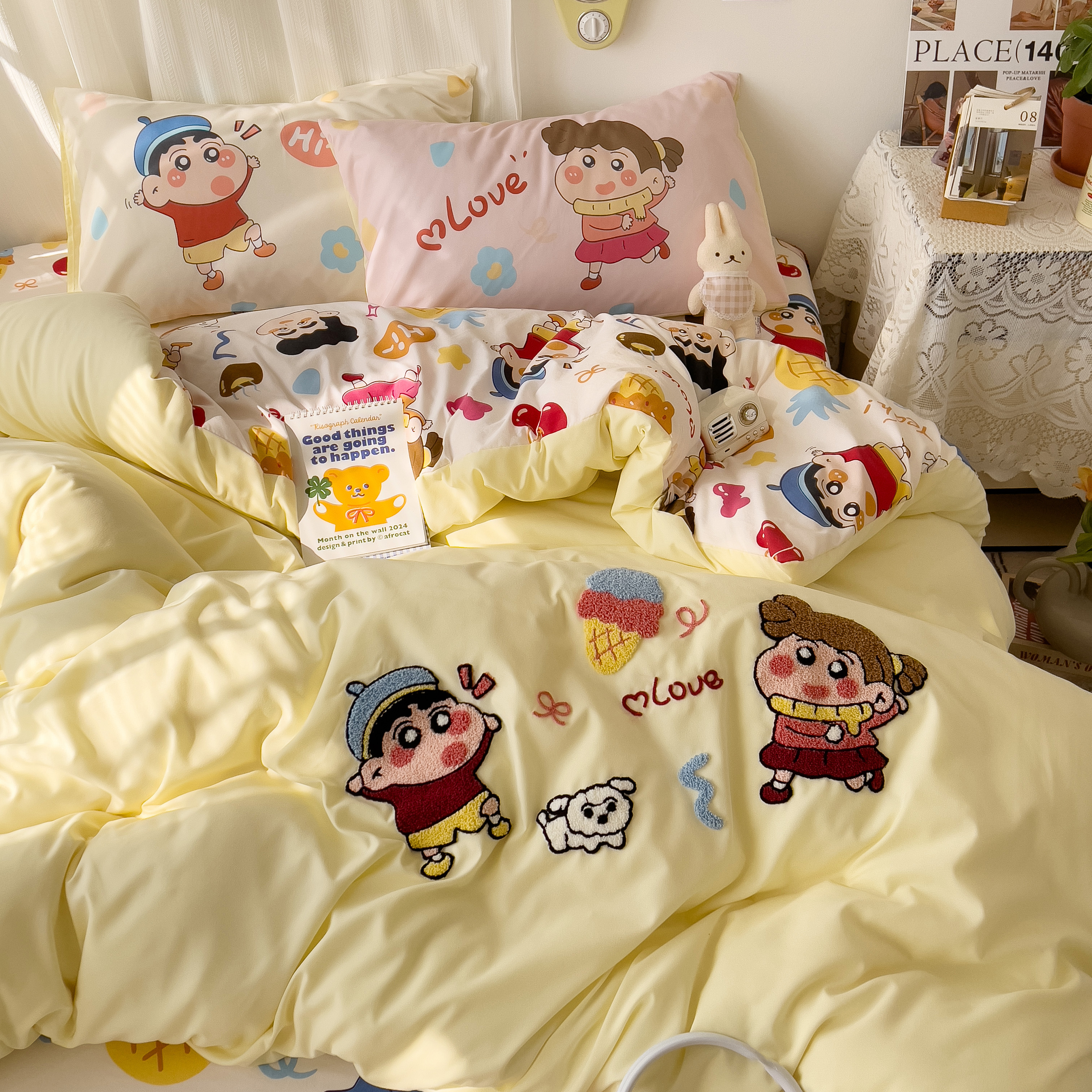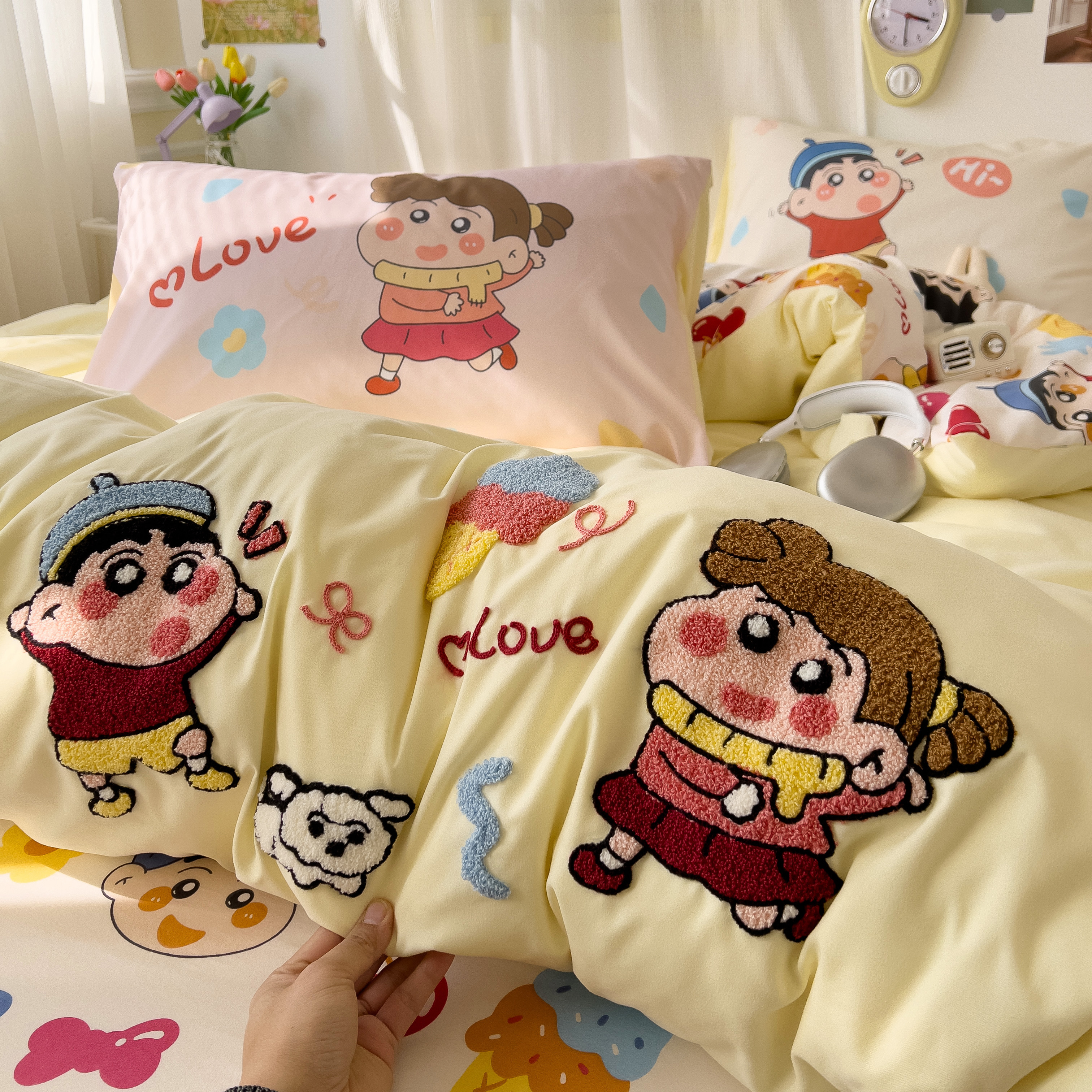 (总)一霖家纺 2025新款大版卡通牛奶绒四件套,搞怪新新紫,俏皮小新-黄,俏皮小新-蓝,甜心猫咪,星空小新