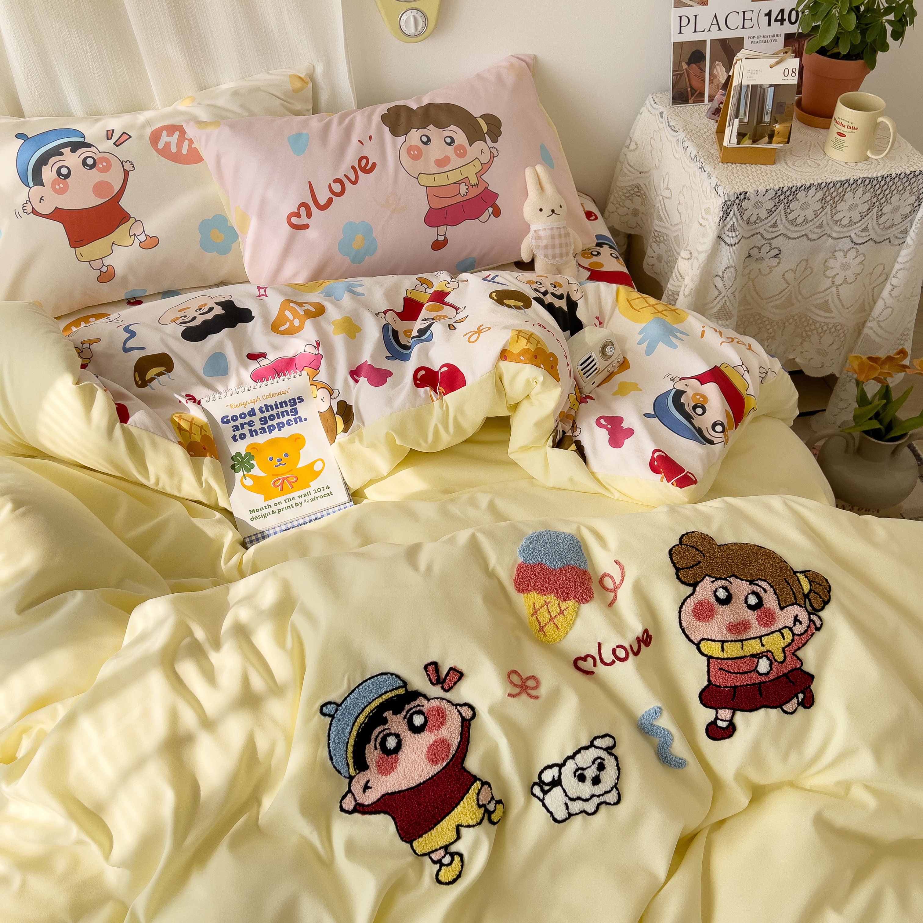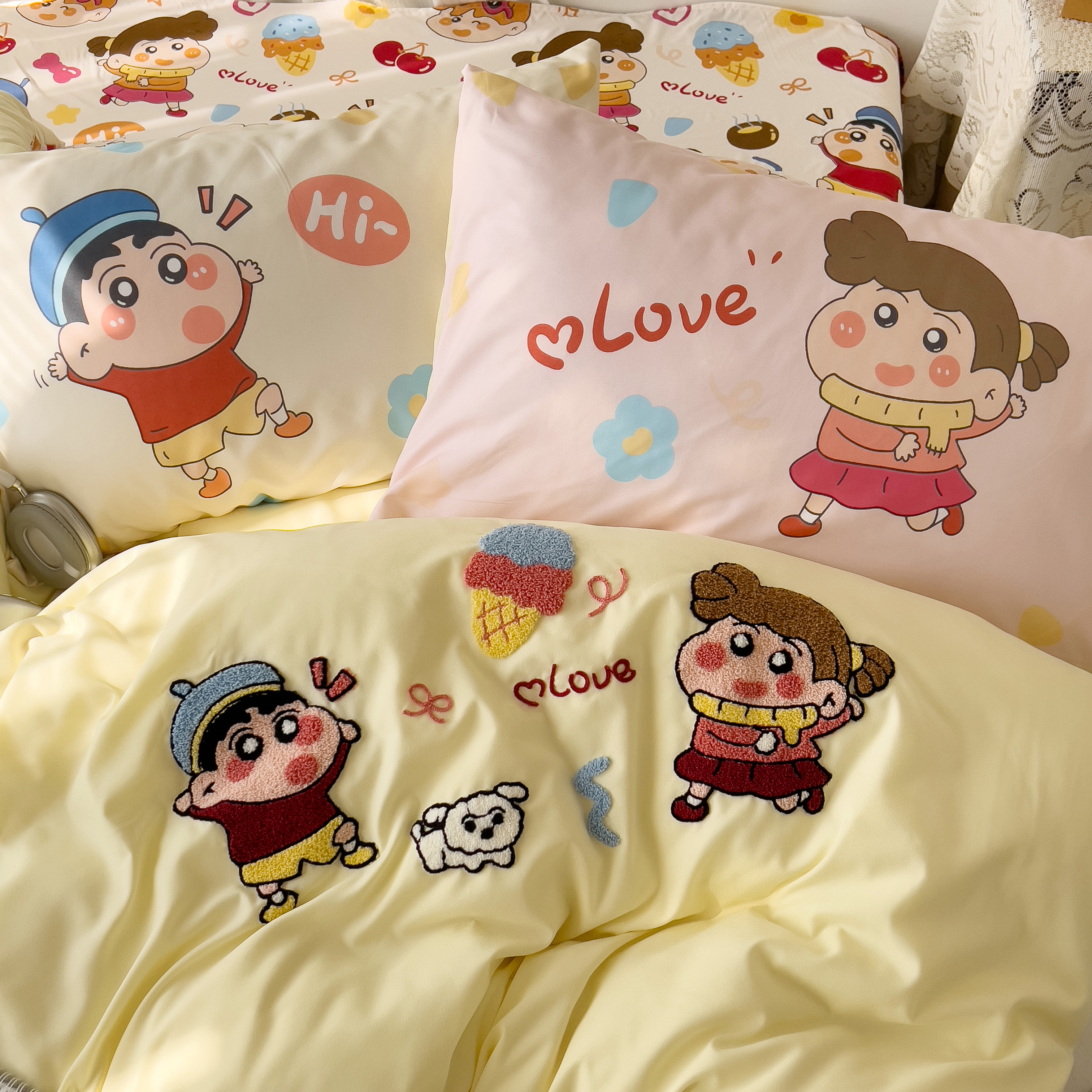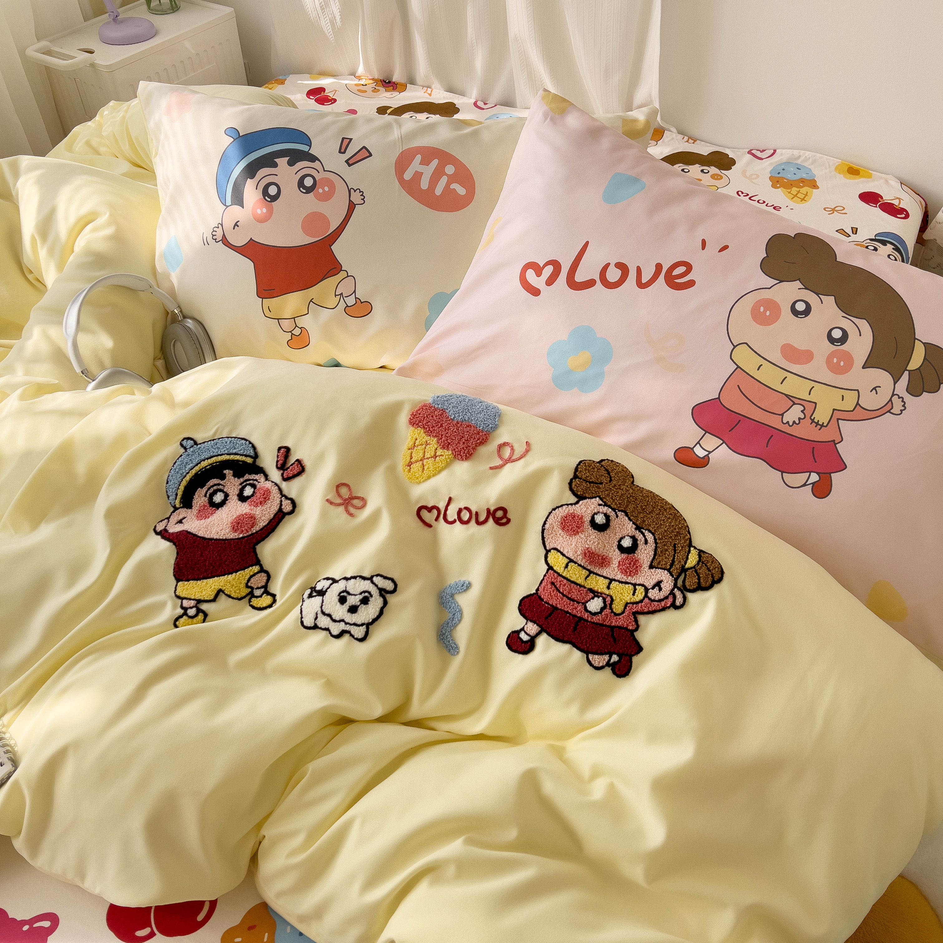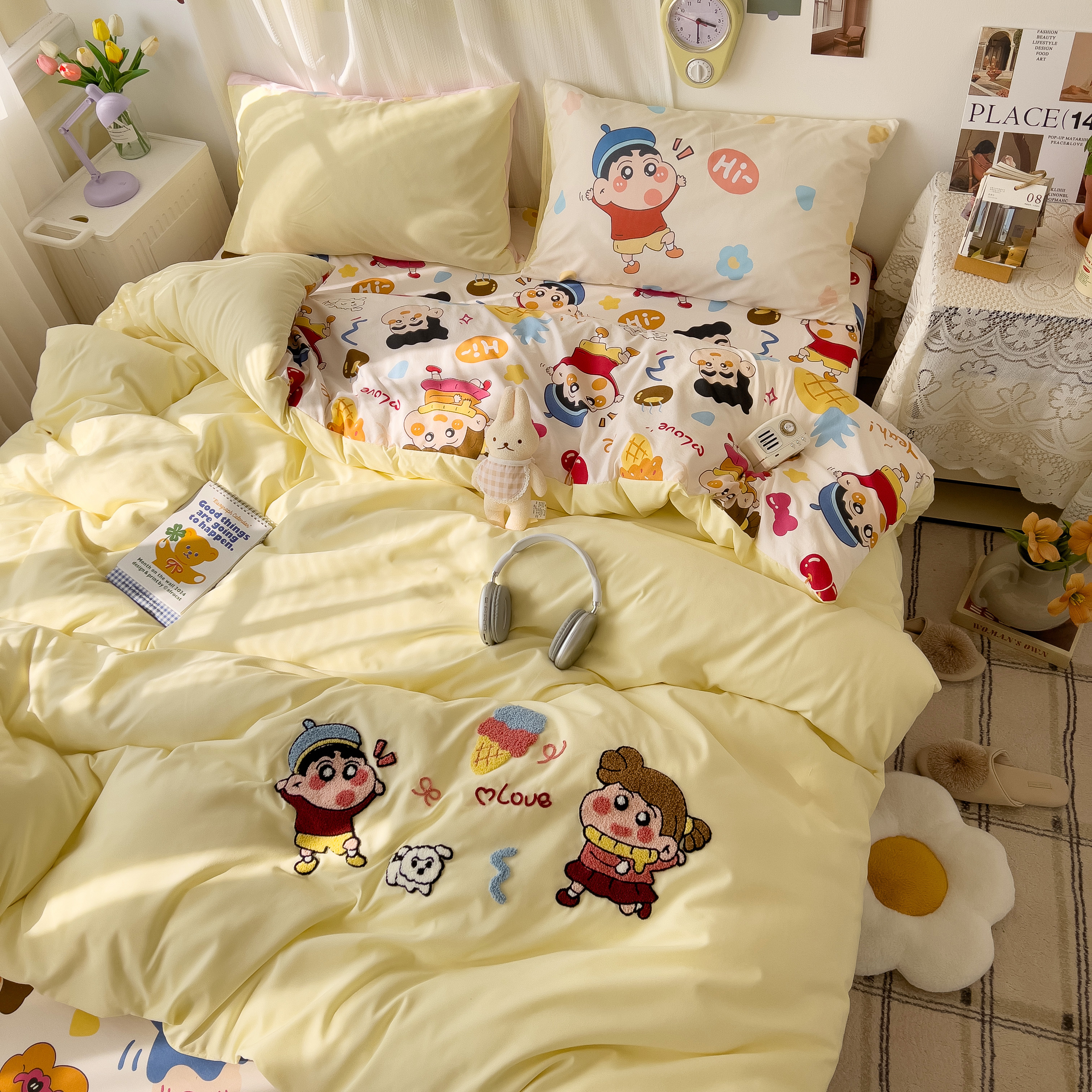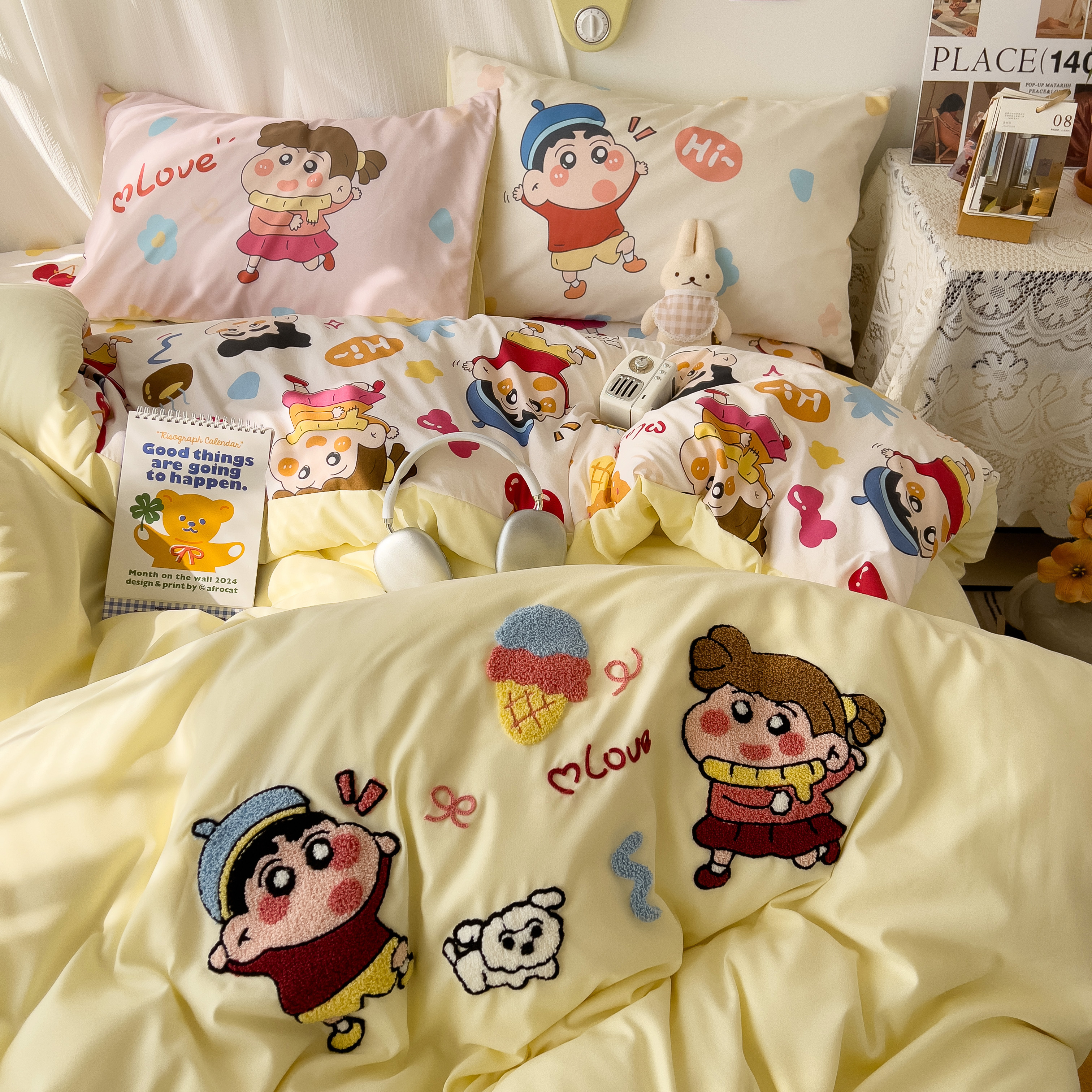 (总)一霖家纺 2025新款大版卡通牛奶绒四件套,搞怪新新紫,俏皮小新-黄,俏皮小新-蓝,甜心猫咪,星空小新