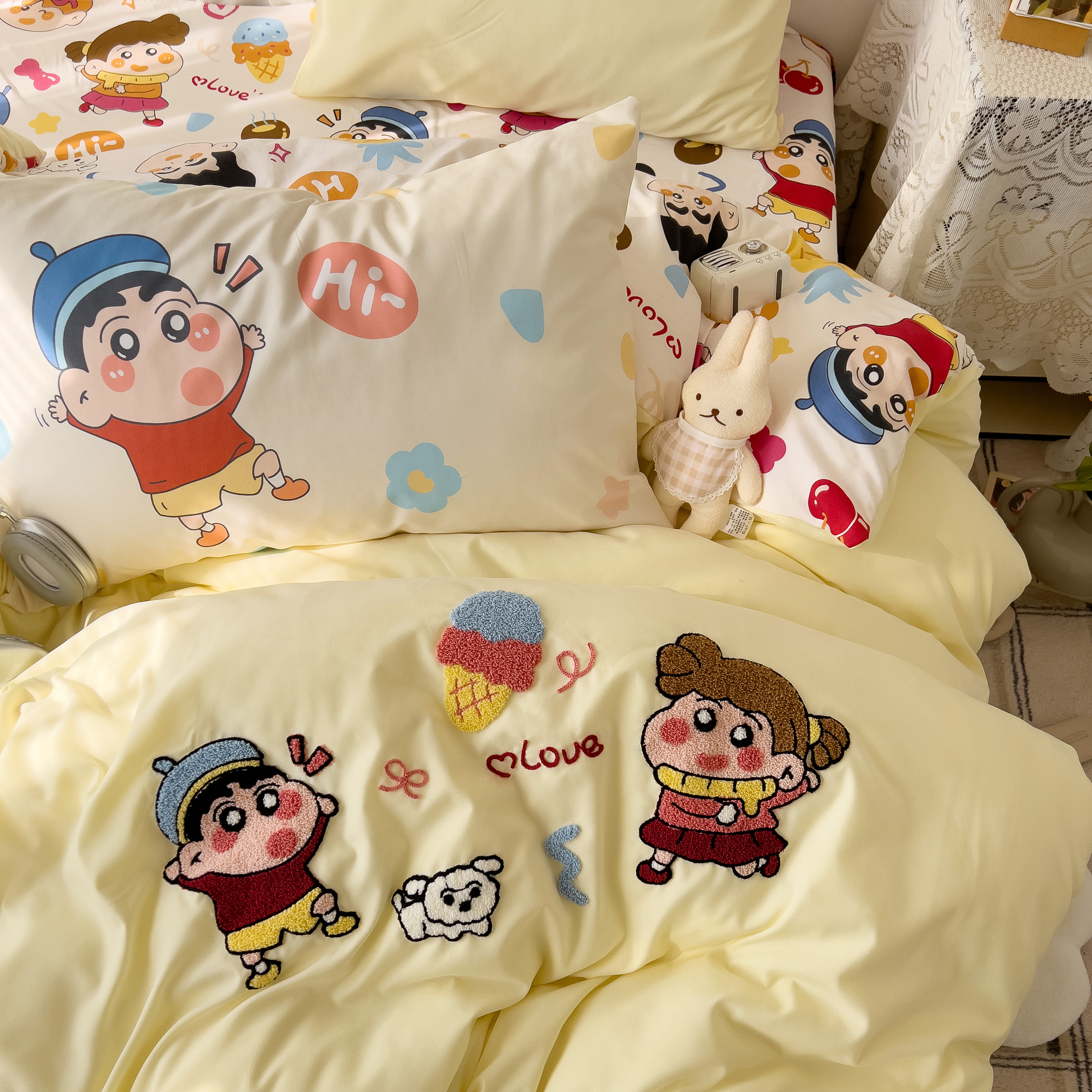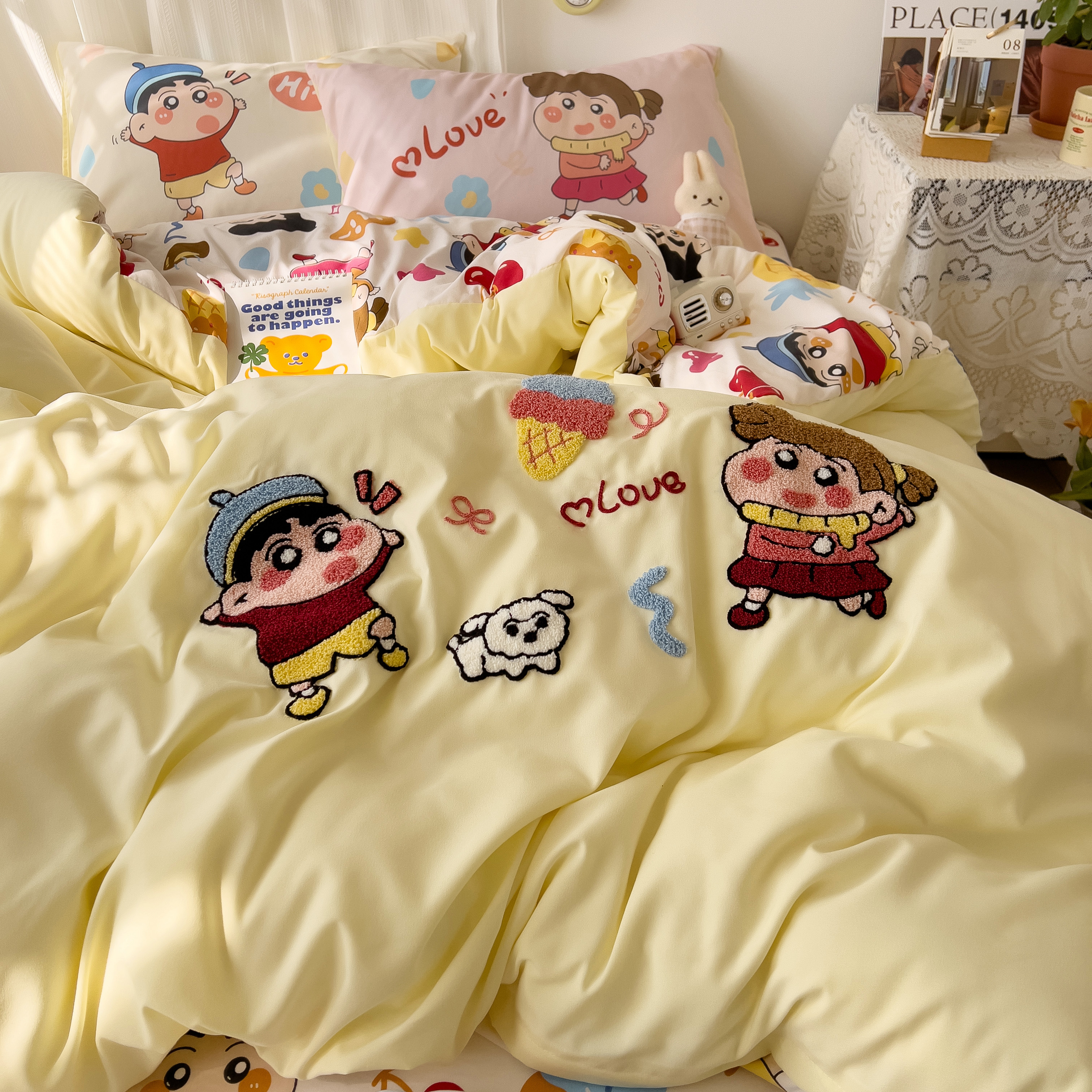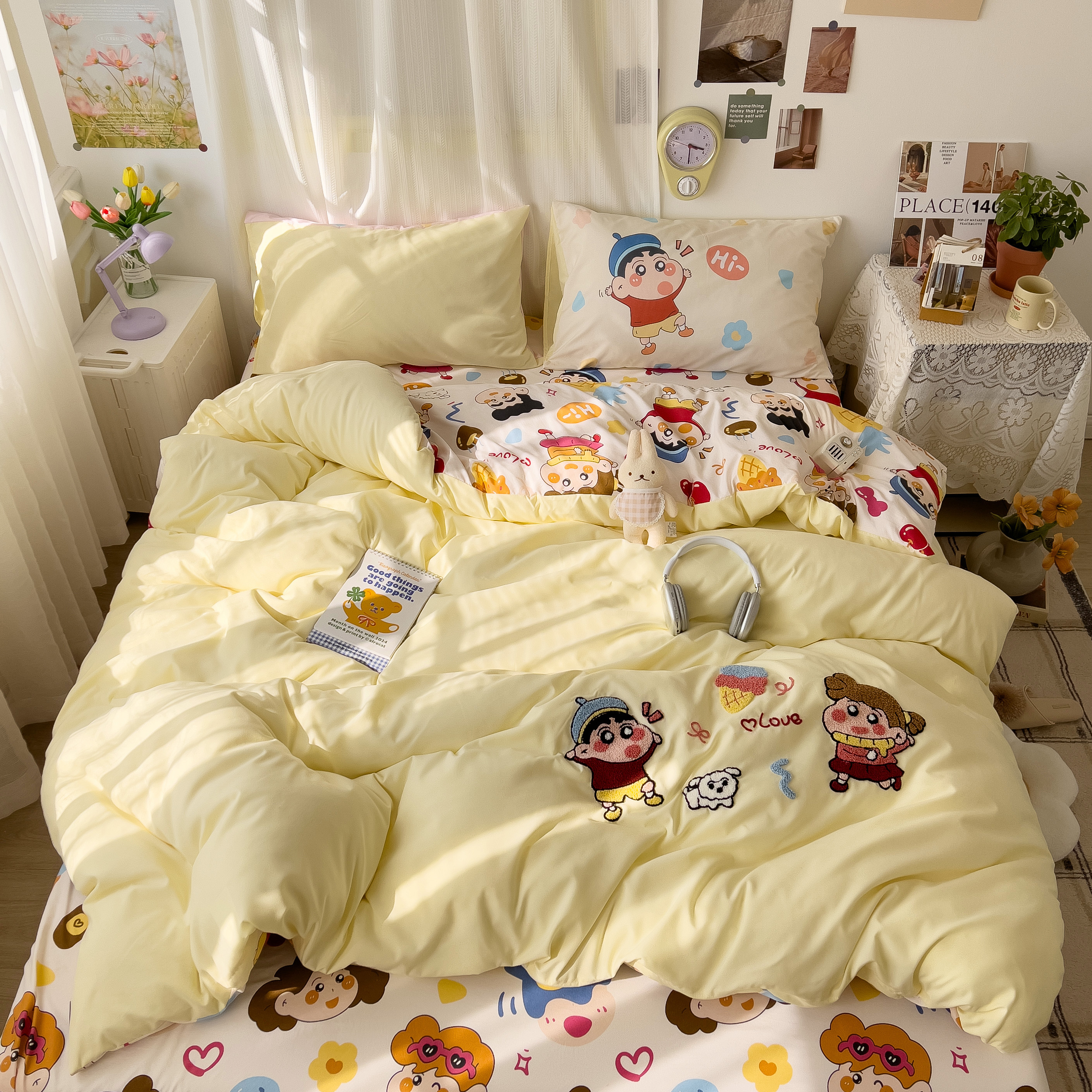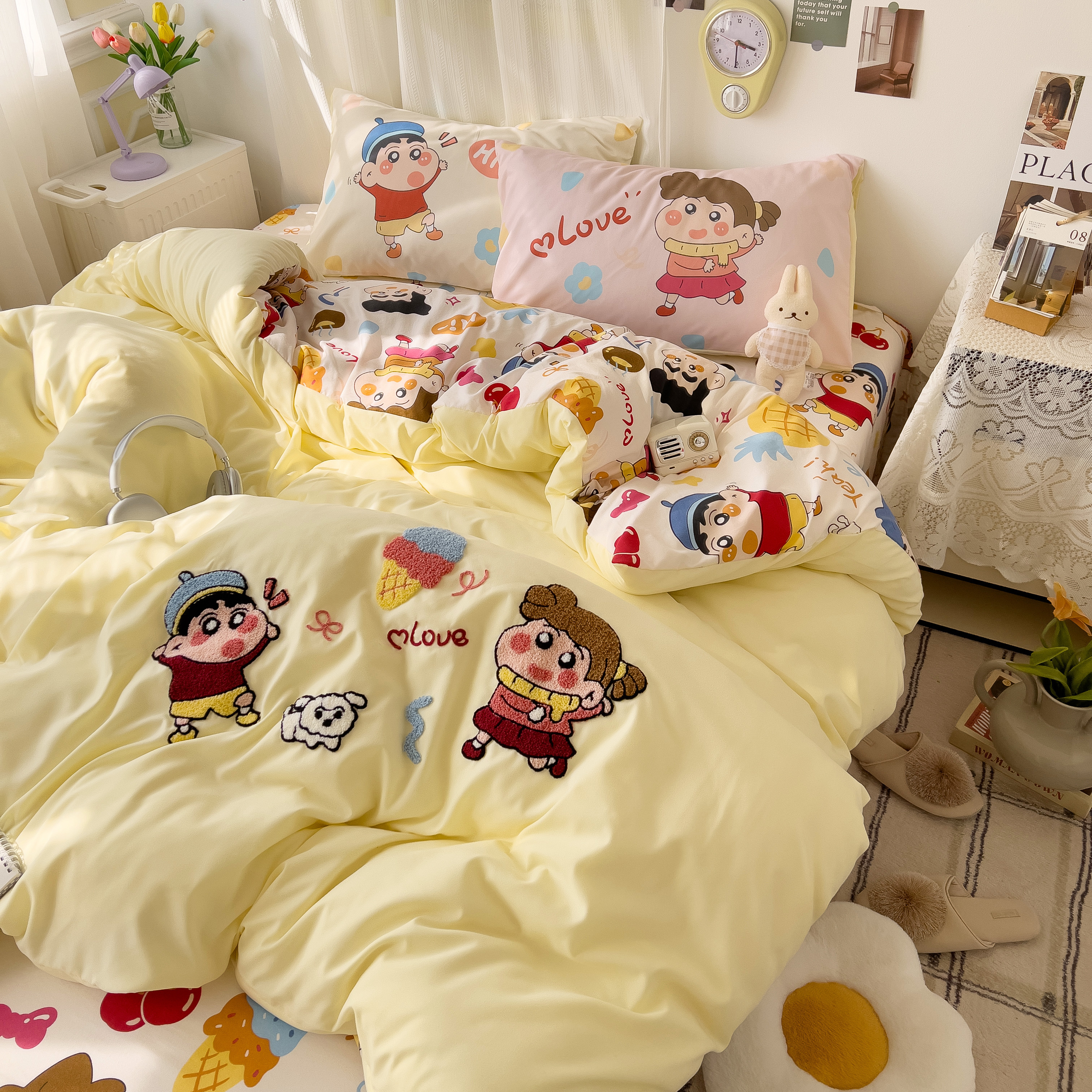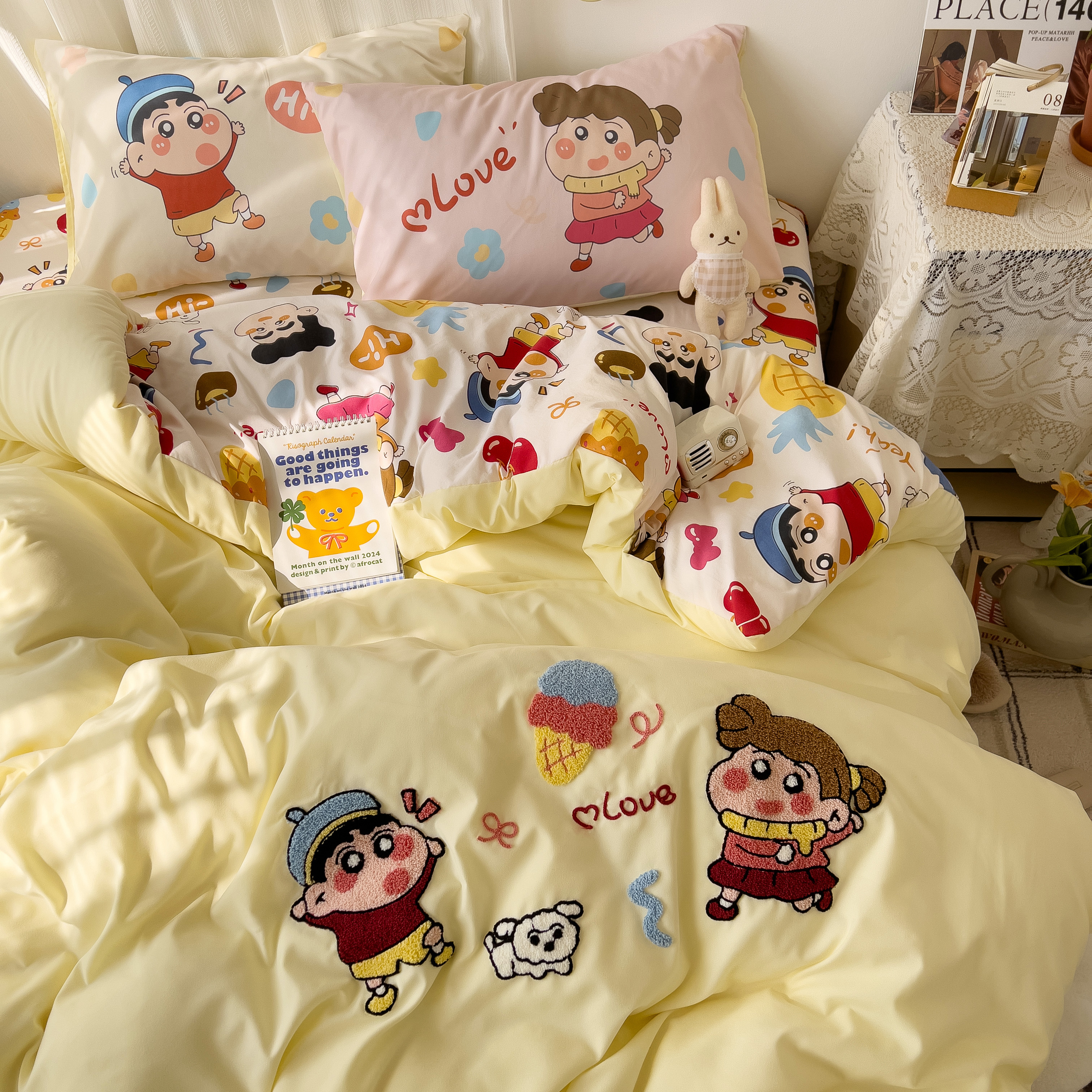 (总)一霖家纺 2025新款大版卡通牛奶绒四件套,搞怪新新紫,俏皮小新-黄,俏皮小新-蓝,甜心猫咪,星空小新