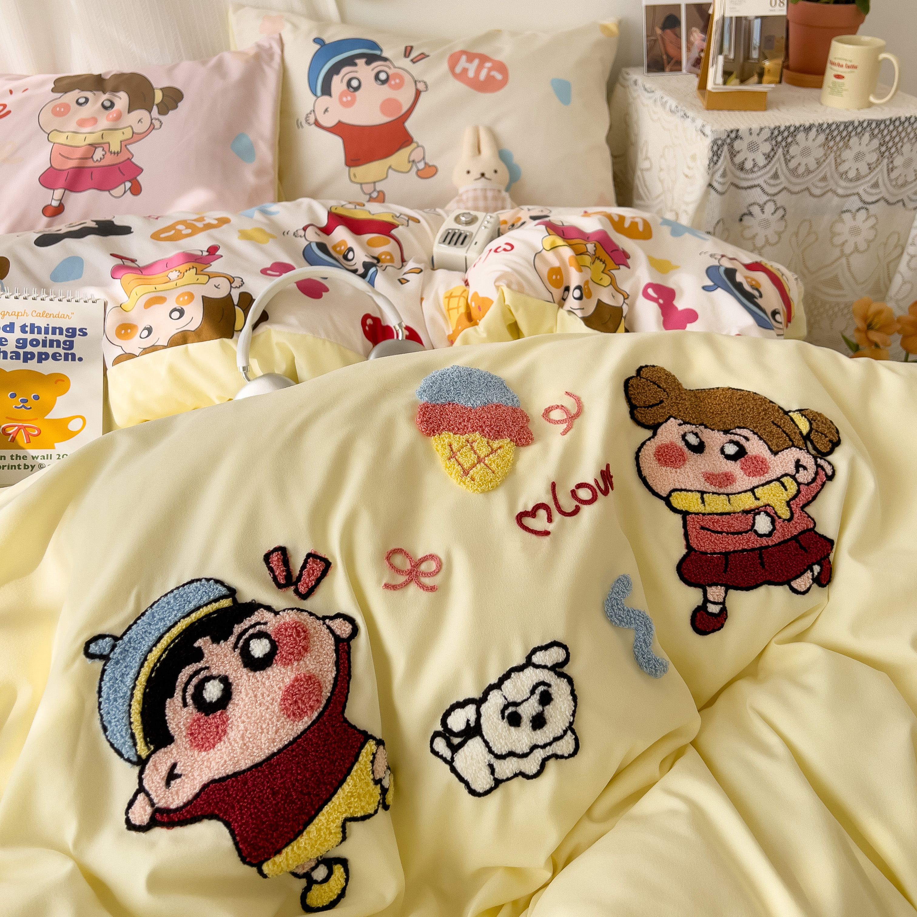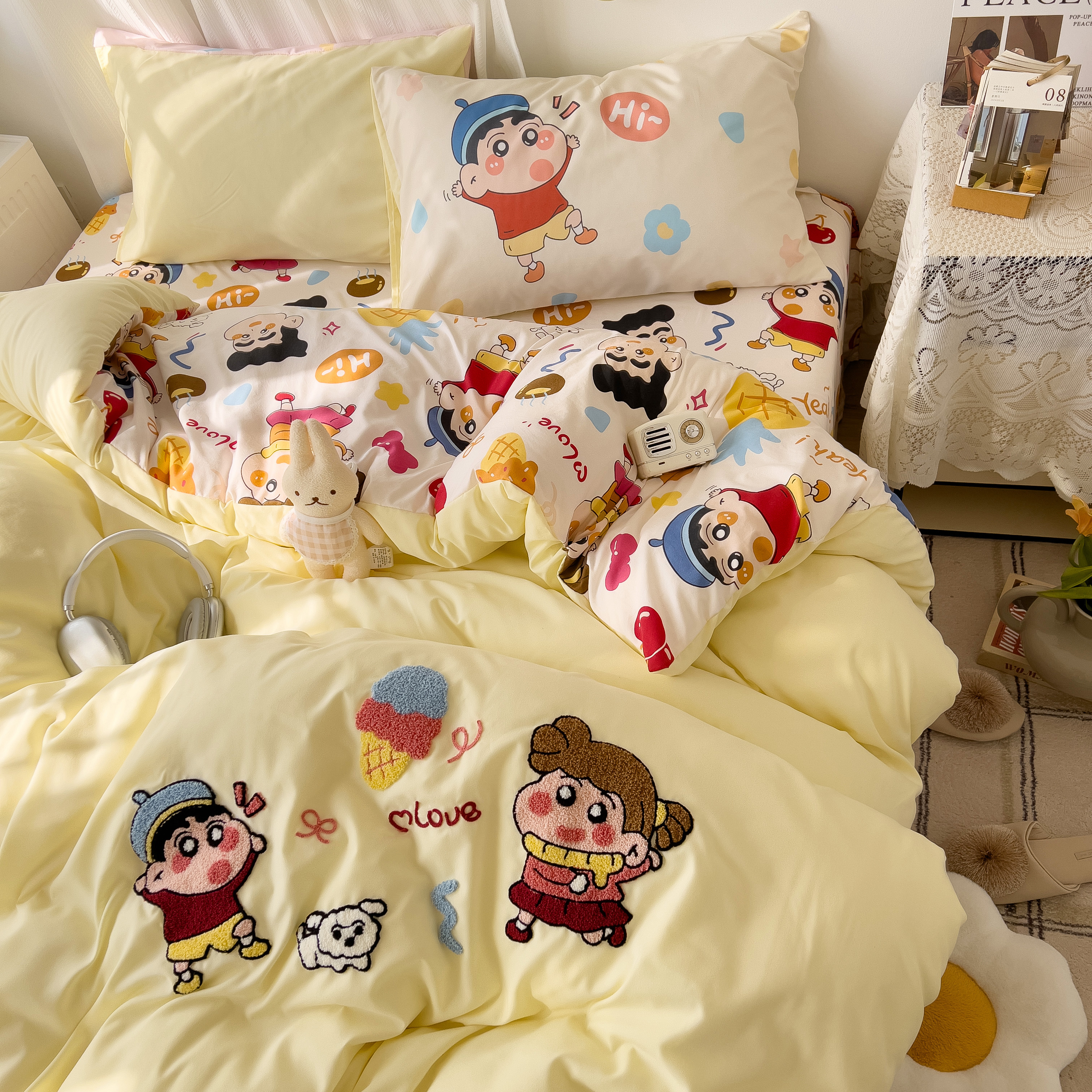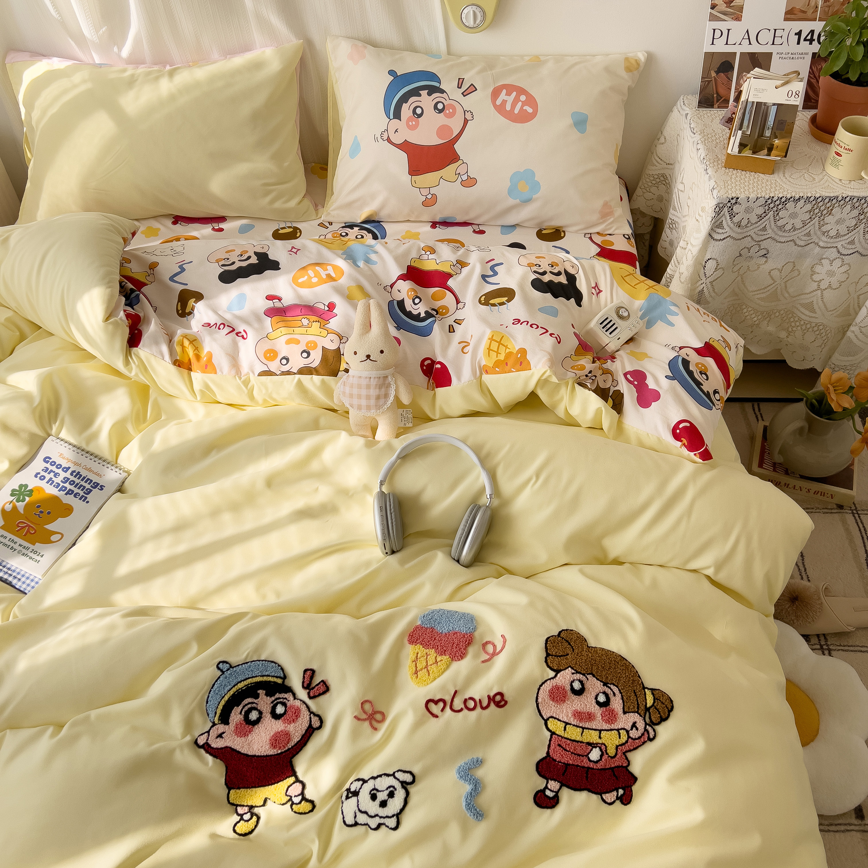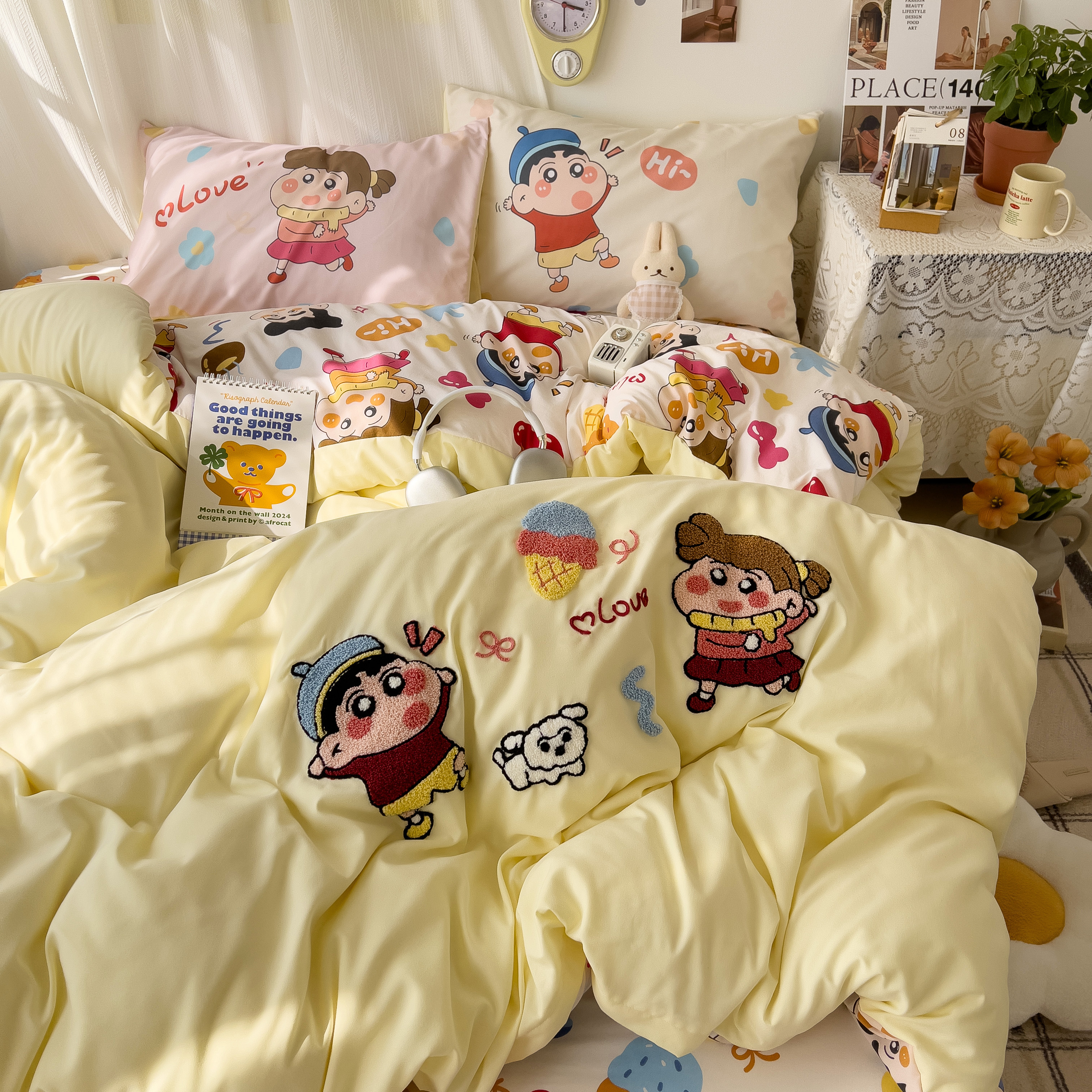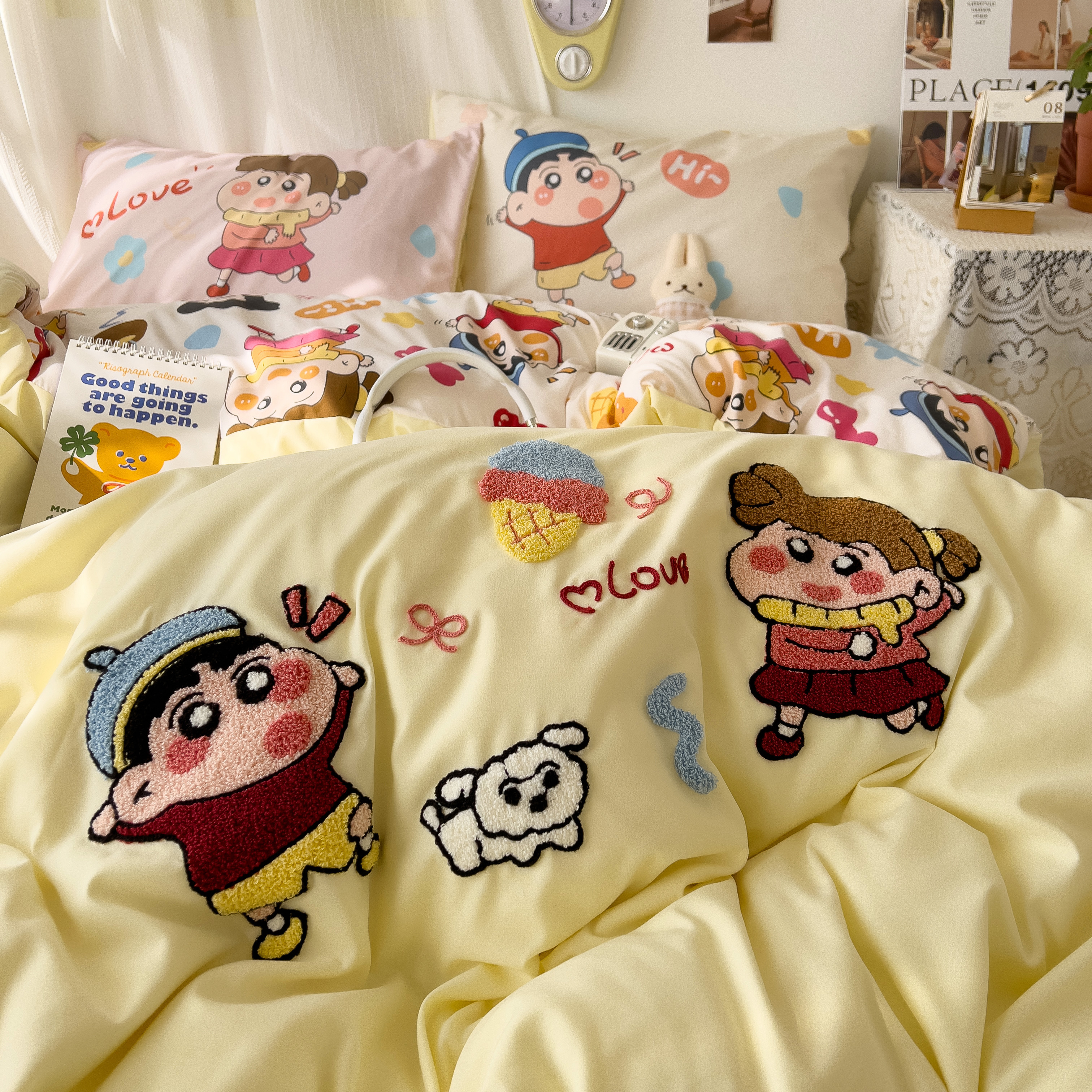 (总)一霖家纺 2025新款大版卡通牛奶绒四件套,搞怪新新紫,俏皮小新-黄,俏皮小新-蓝,甜心猫咪,星空小新