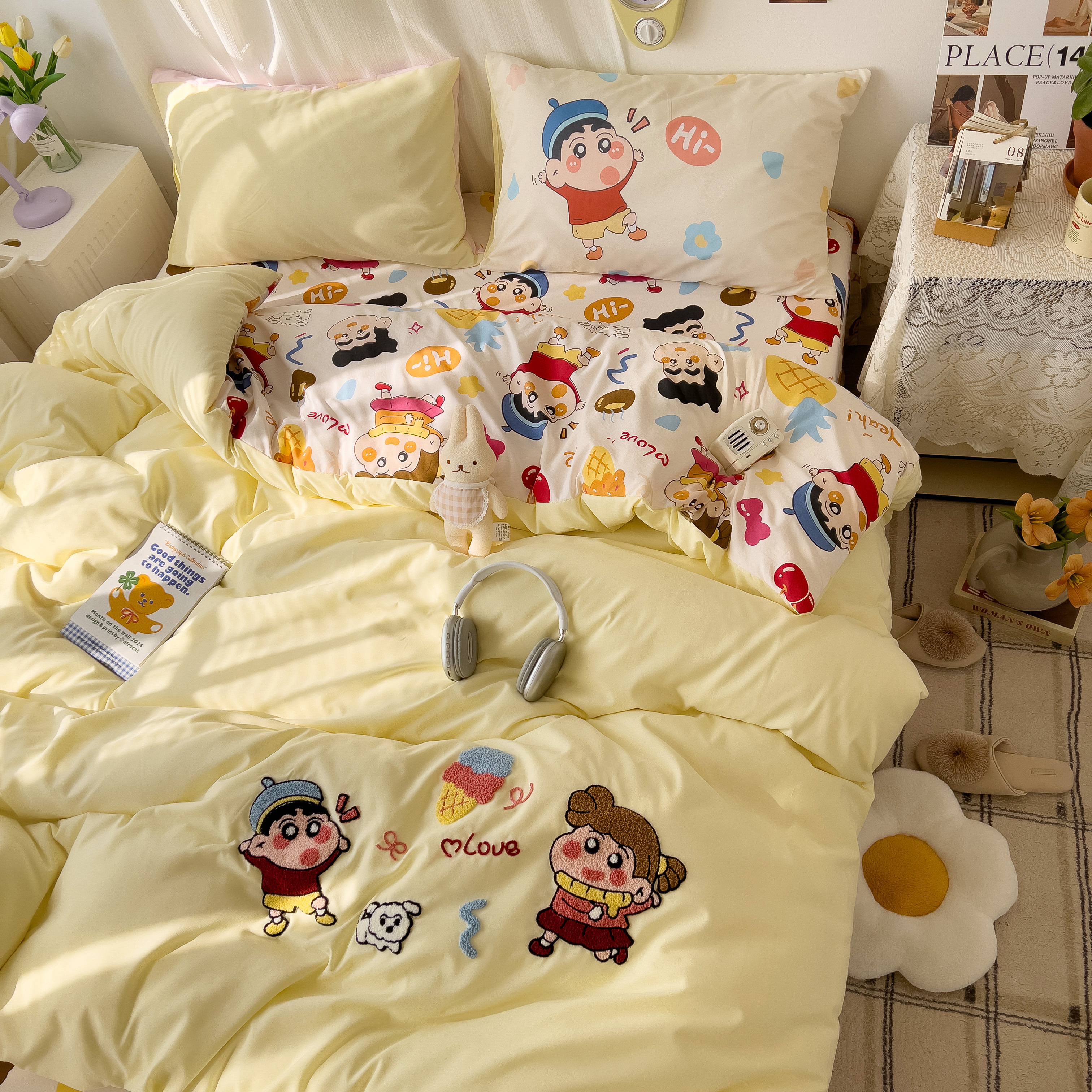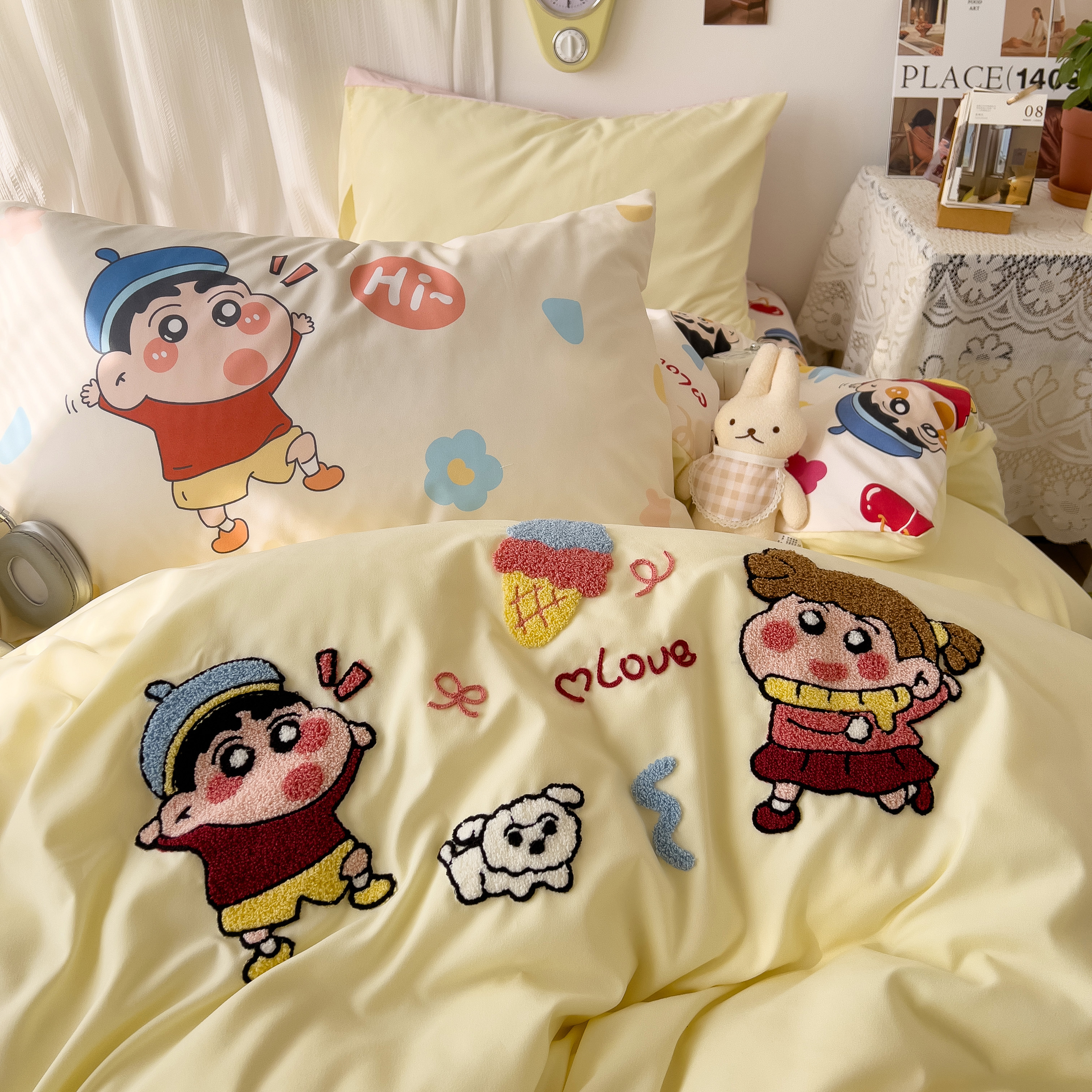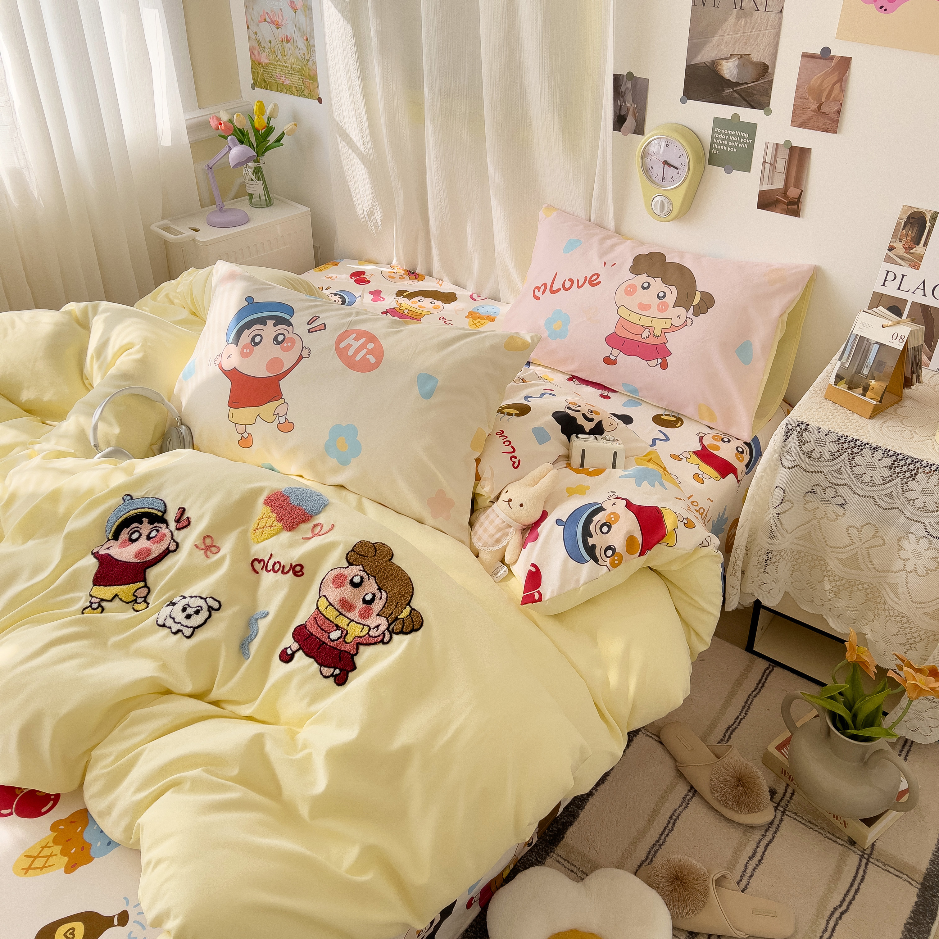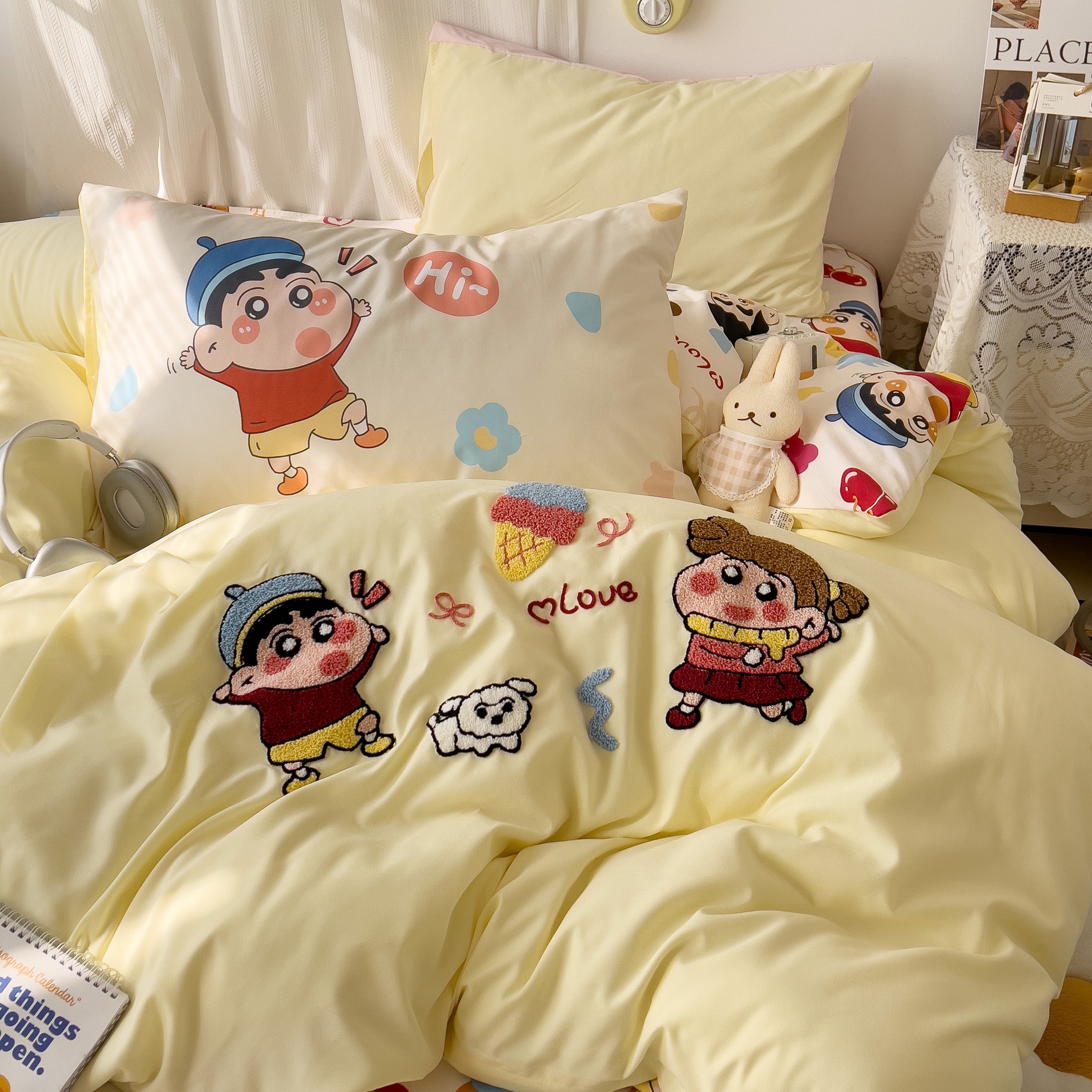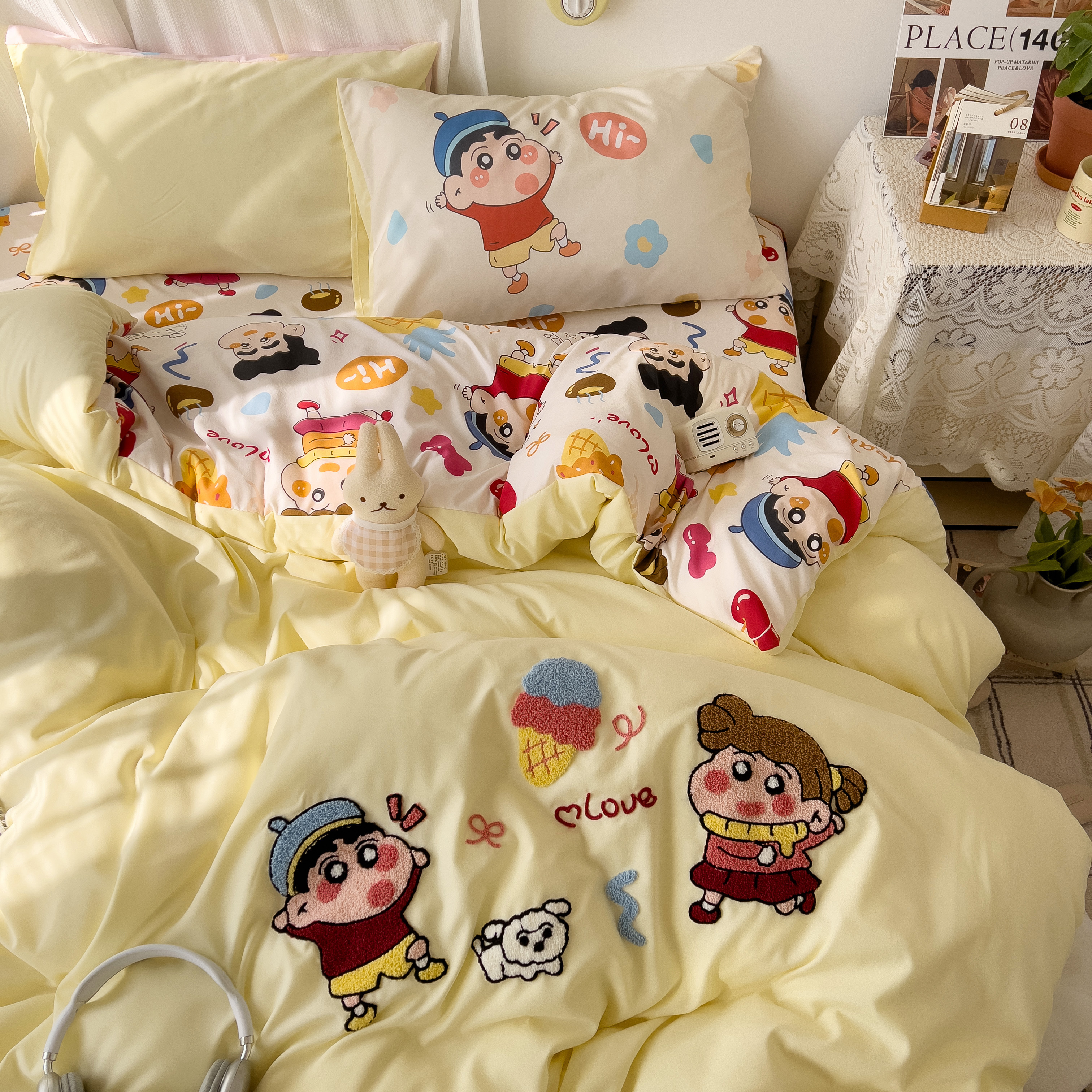 (总)一霖家纺 2025新款大版卡通牛奶绒四件套,搞怪新新紫,俏皮小新-黄,俏皮小新-蓝,甜心猫咪,星空小新