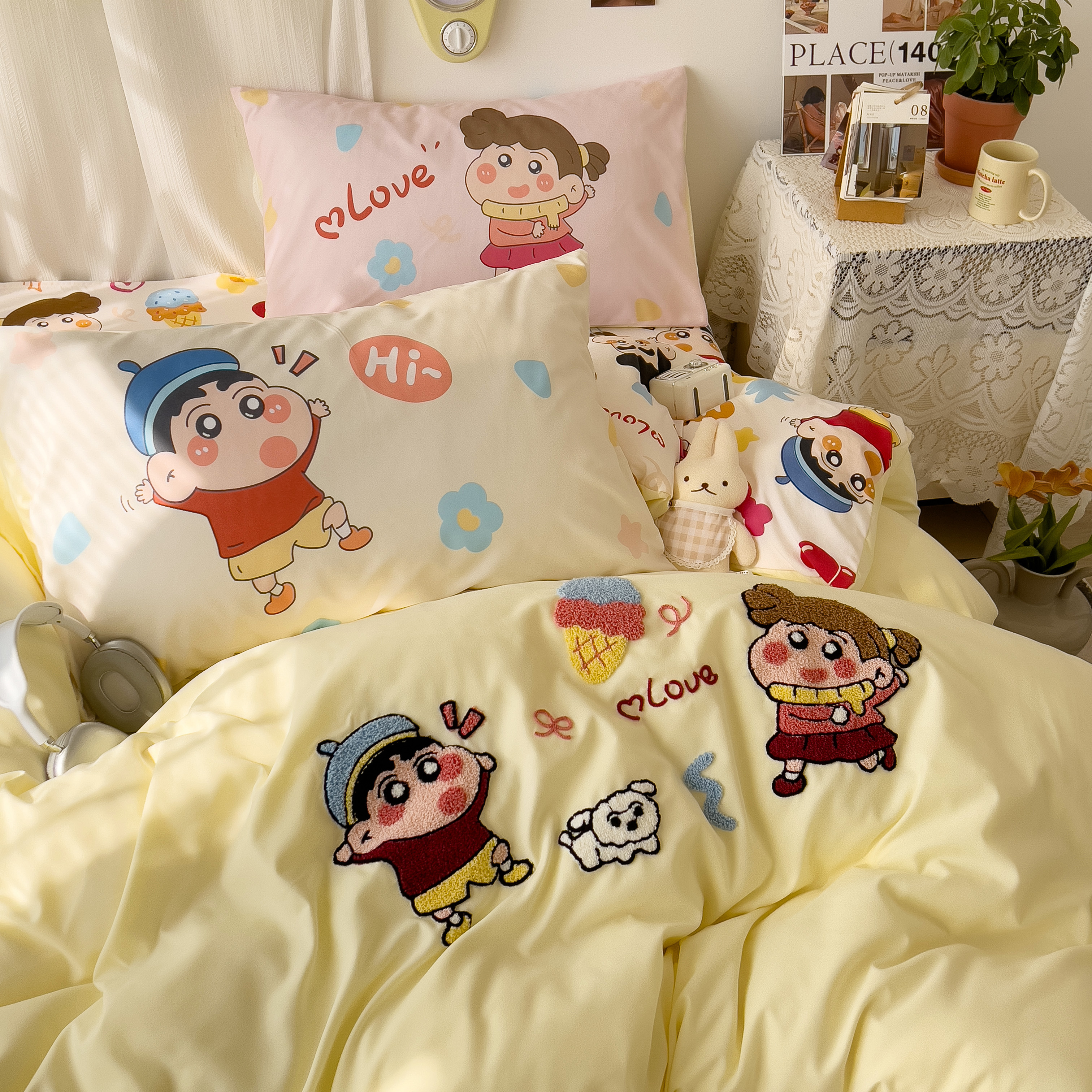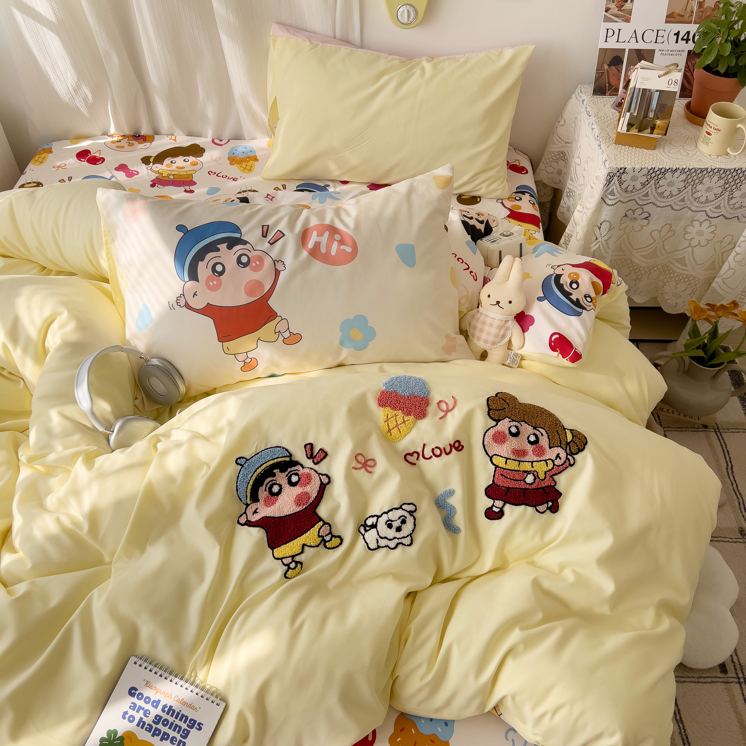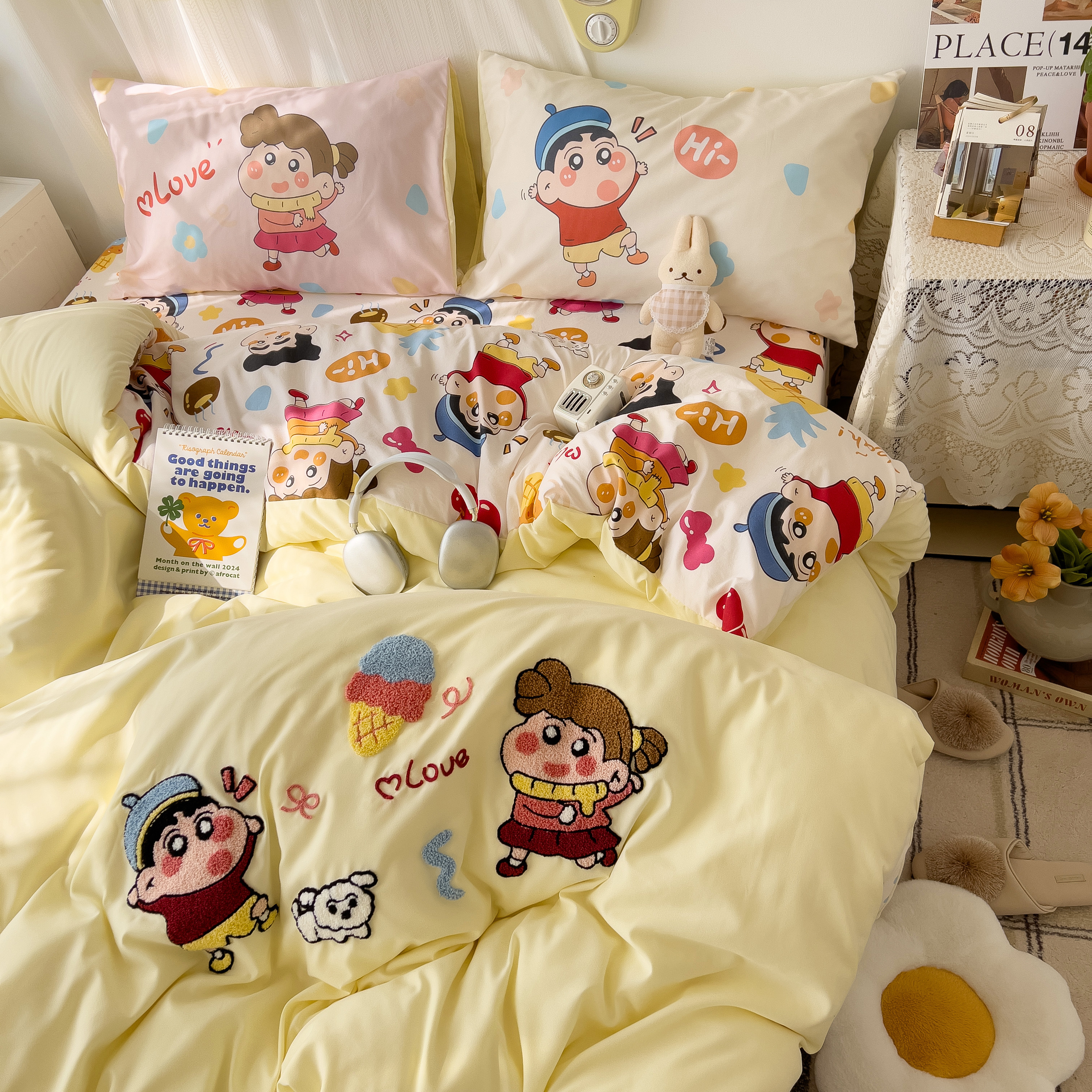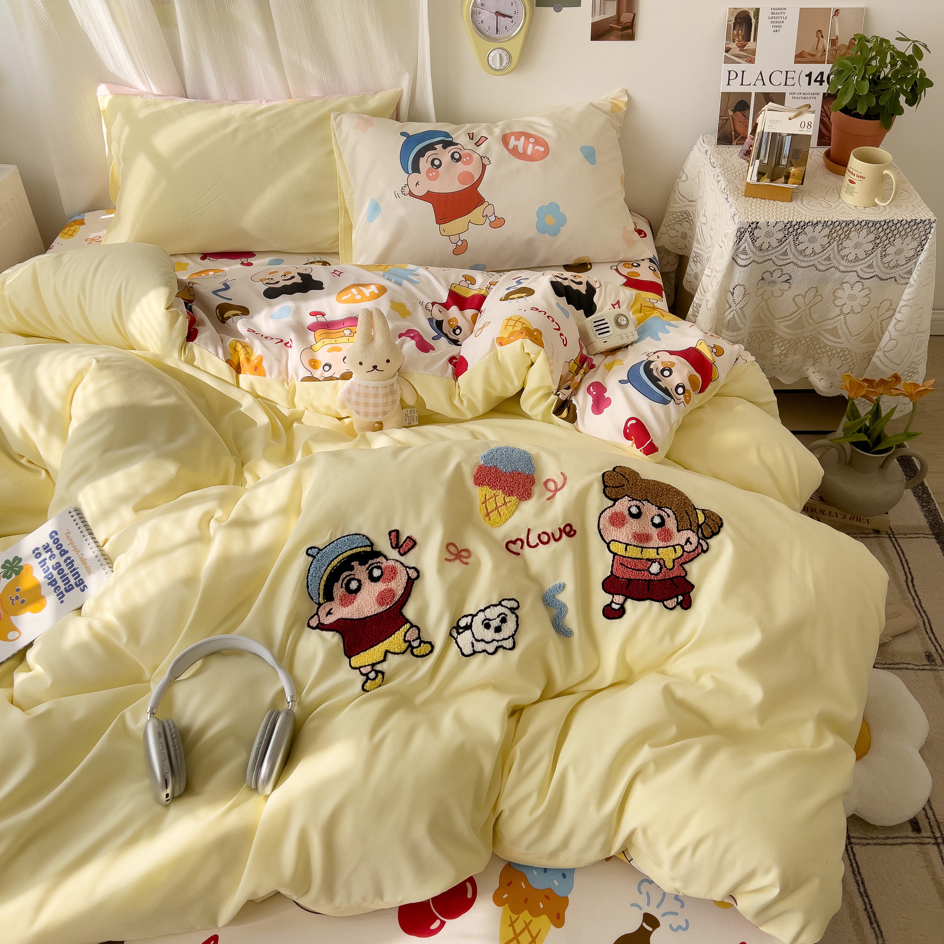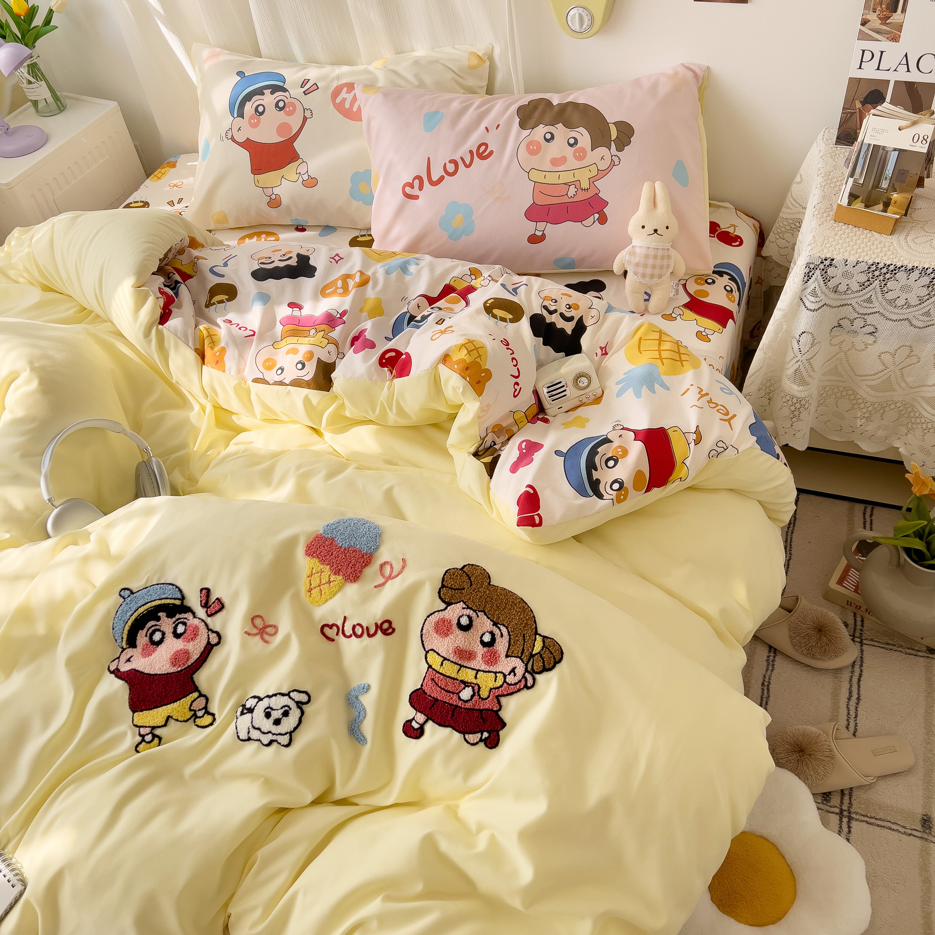 (总)一霖家纺 2025新款大版卡通牛奶绒四件套,搞怪新新紫,俏皮小新-黄,俏皮小新-蓝,甜心猫咪,星空小新