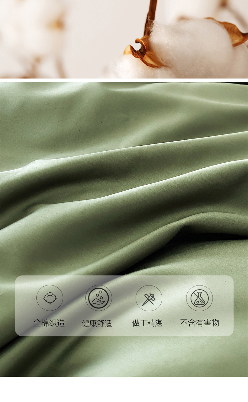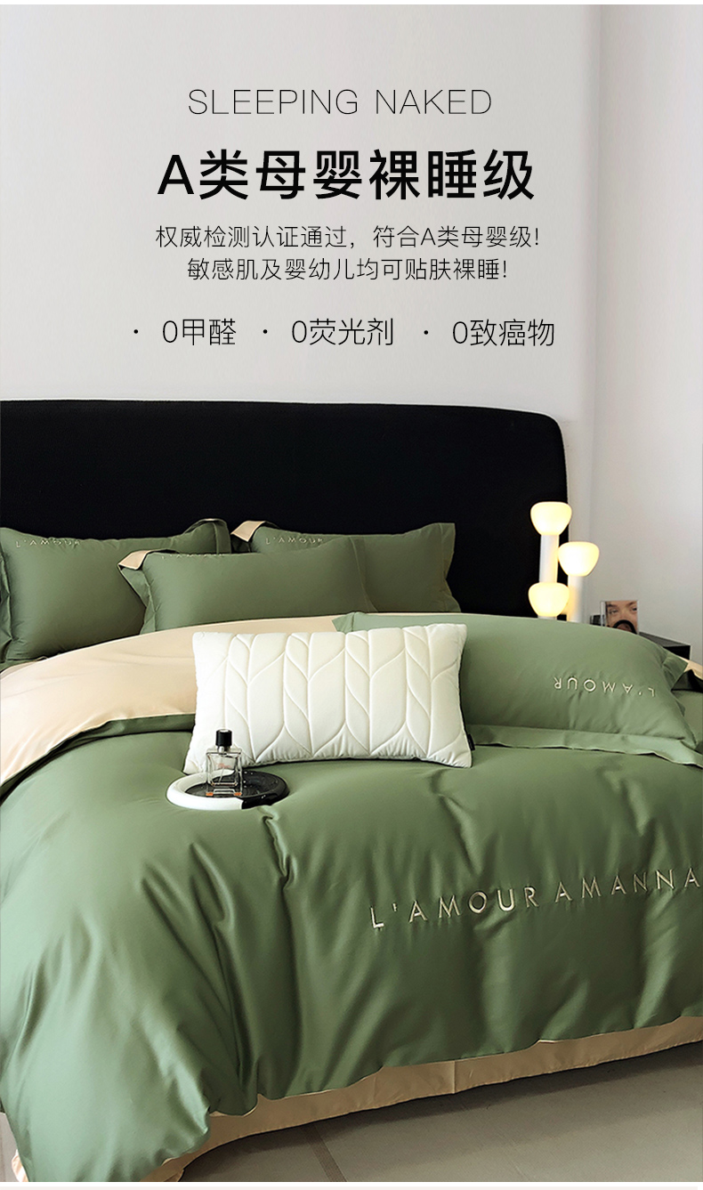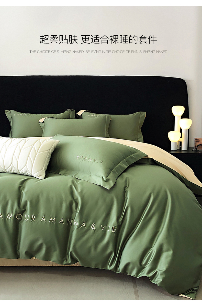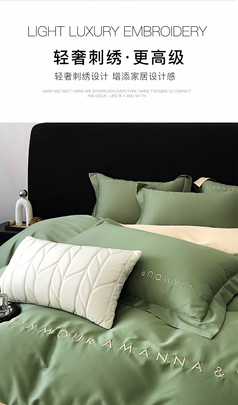 商品名称:禧澜庭 2025新款高支纯棉全棉斜纹四件套刺绣绣花款轻奢三件套--简爱系列 拾光绿+香槟
