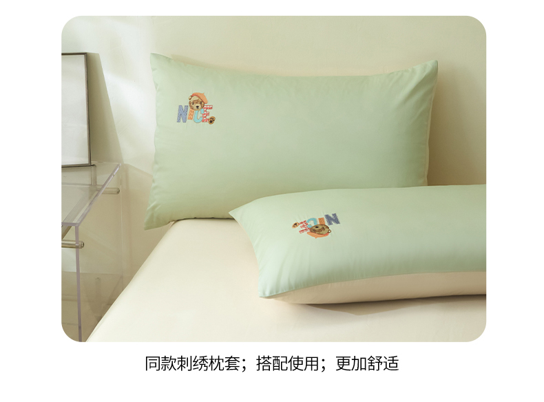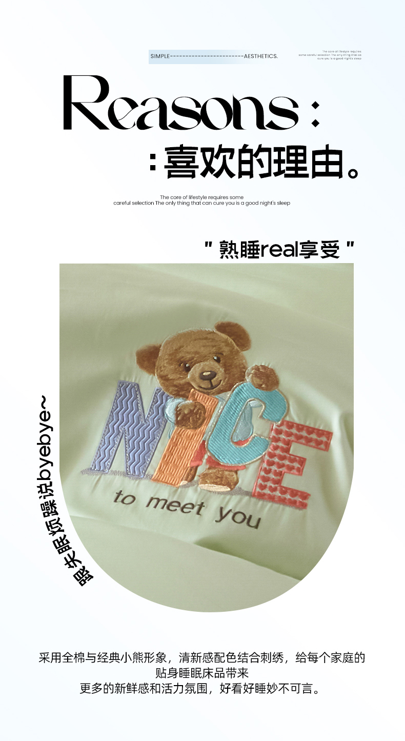 商品名称:拼社家纺 2025新款全棉长绒棉四件套纯棉四件套小熊刺绣床上用品【提供买家秀】 萌萌熊-水绿