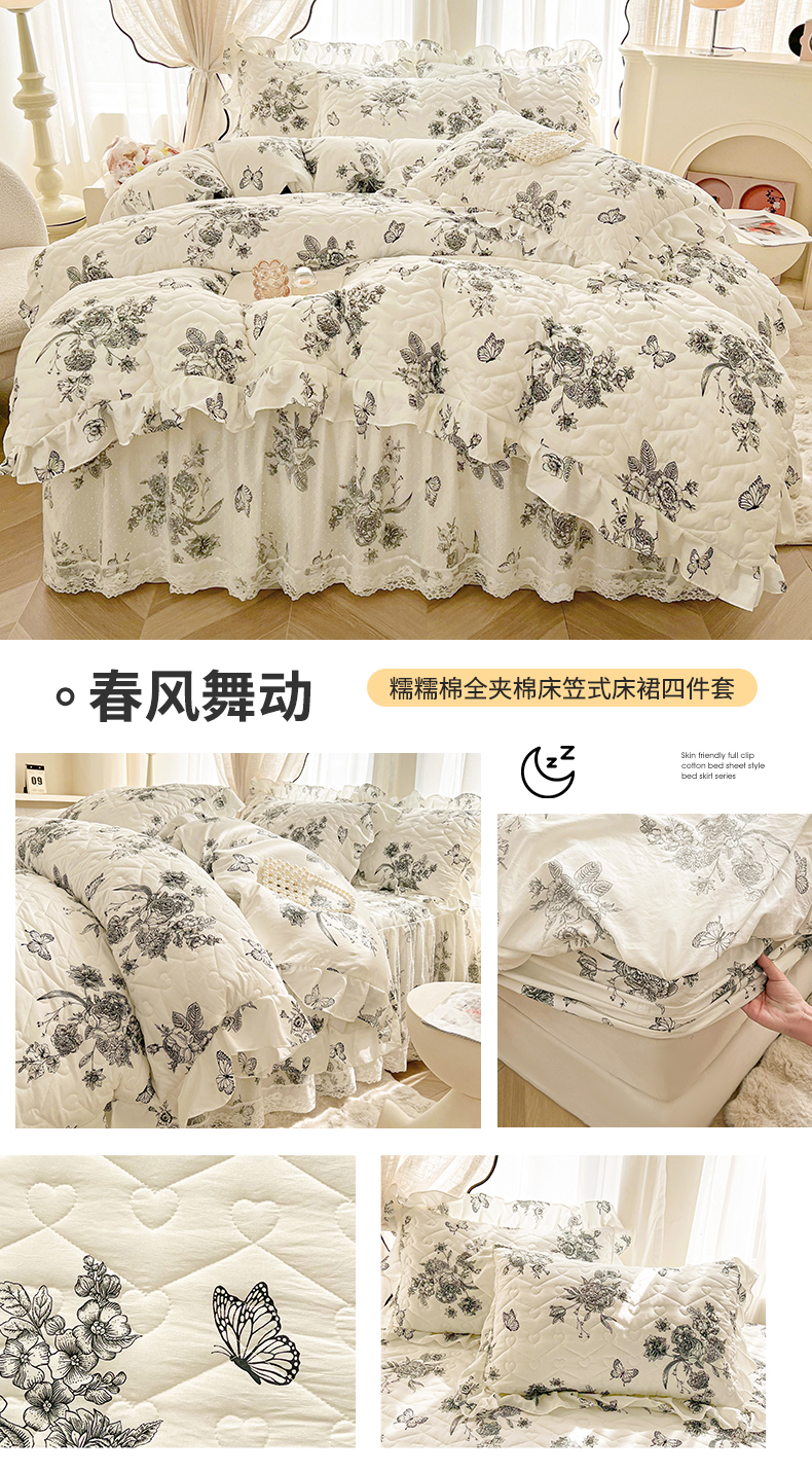 • 91家纺网 家纺一手货源 找家纺 宜凡家纺 2025新款糯糯棉全夹棉床笠式床裙四件套 春风舞动
