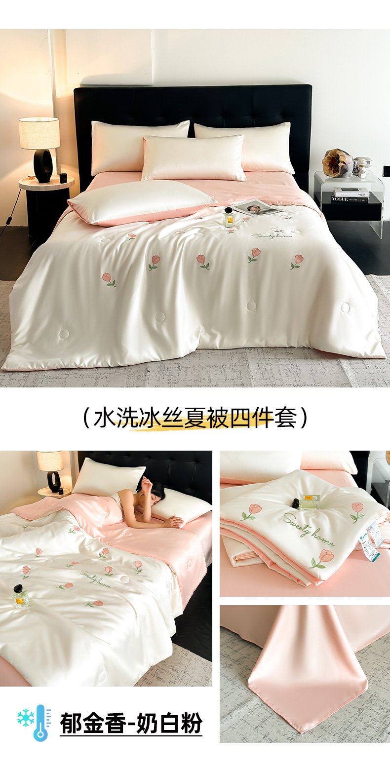 • 91家纺网 家纺一手货源 找家纺 绒世界 2025春夏水洗冰丝夏被四件套满绣系列 郁金香-奶白粉