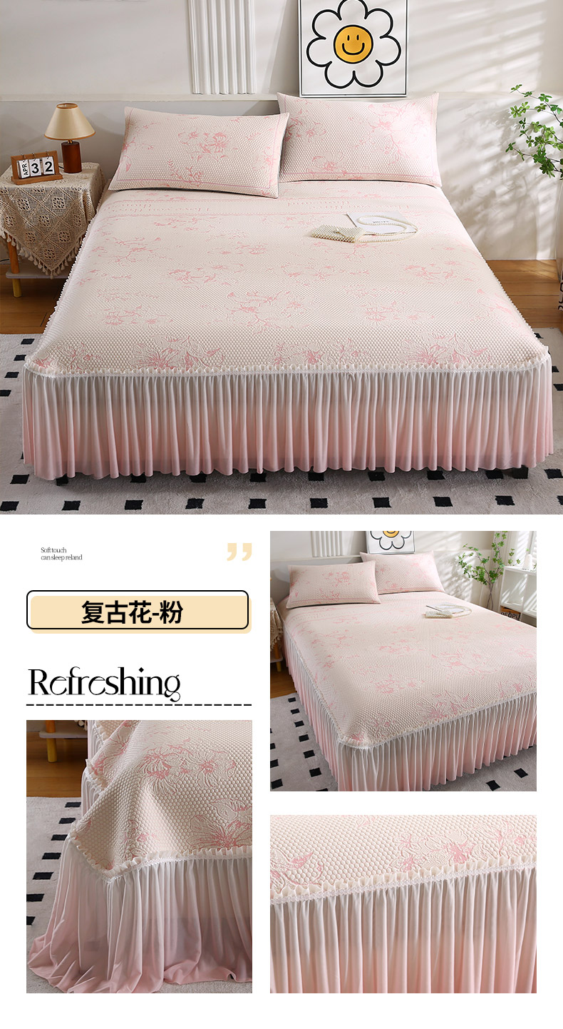 商品名称:法莱妮2025夏季新款A类真凉感丝提花三明治冰豆豆凉席床裙三件套 复古花-粉