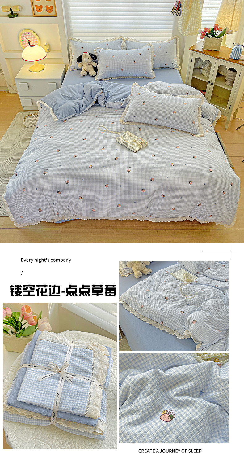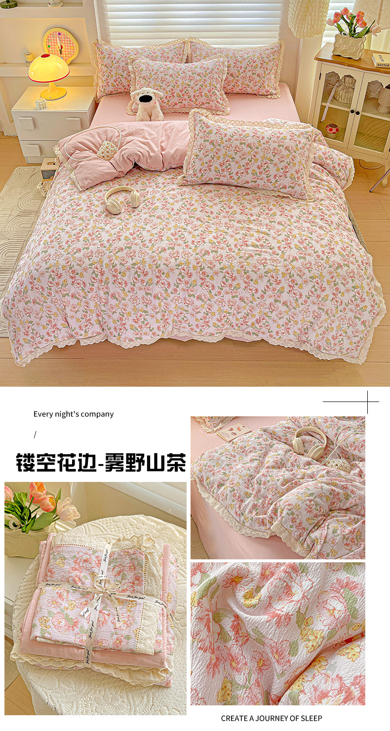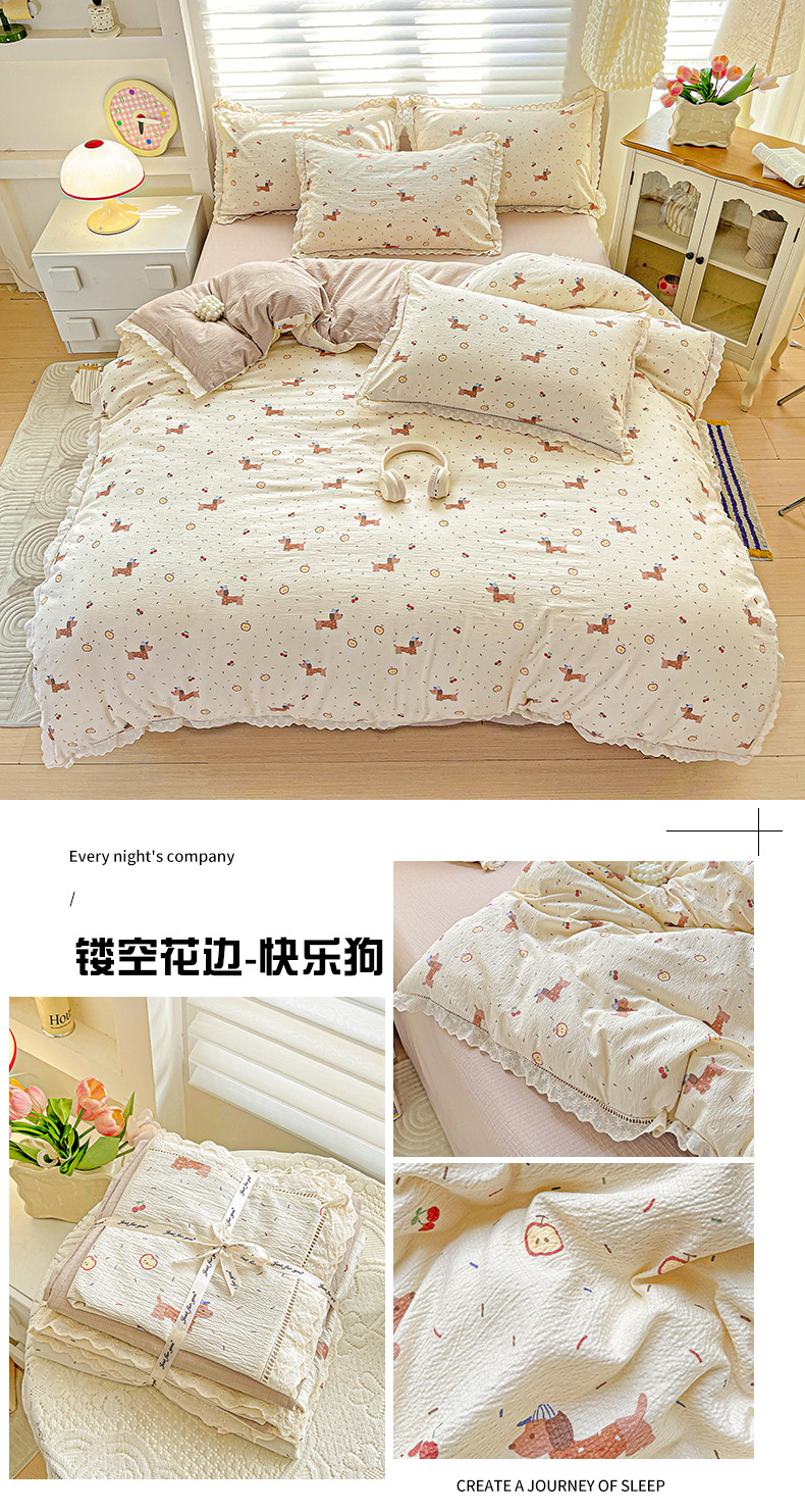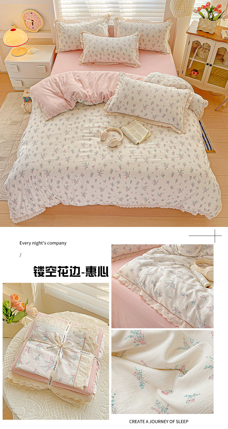 当前位置: 91家纺网 > 商品网购 > 床品套件 > 四件套 > 其它四件套 > 金梦拉家纺 2025新款提花纱布皱皱纱四件套(全棉镂空花边款) 镂空花边-惠心