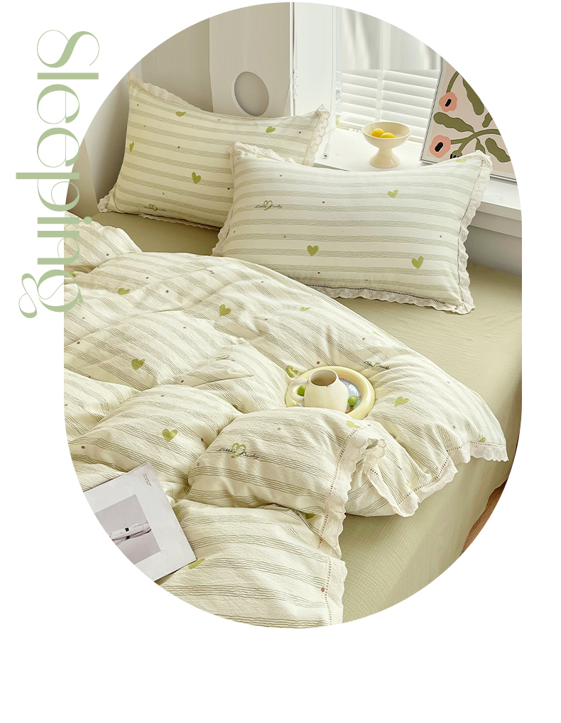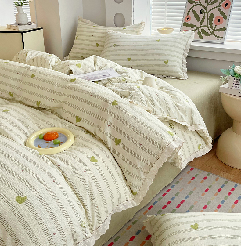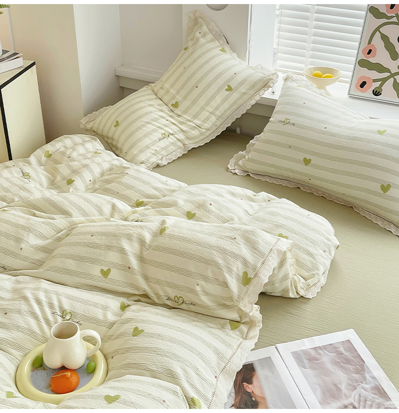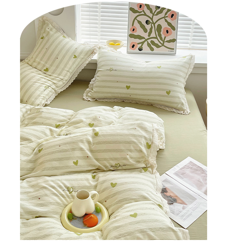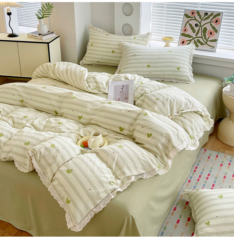 雨彤家纺 2025新款A类高克重云感皱皱双层纱全棉镂空花边款法式四件套-床拍图 可心-绿