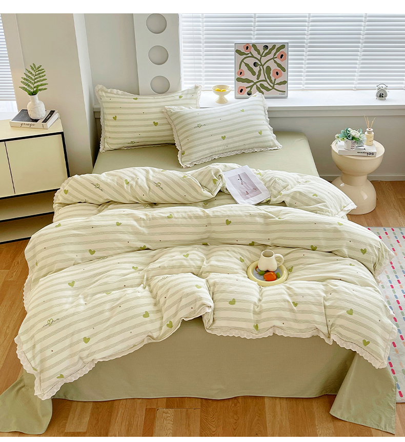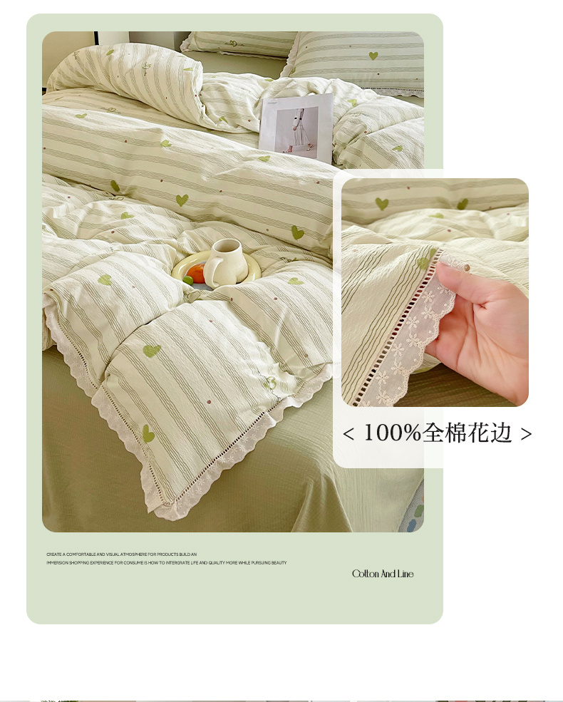 商品名称:雨彤家纺 2025新款A类高克重云感皱皱双层纱全棉镂空花边款法式四件套-床拍图 可心-绿