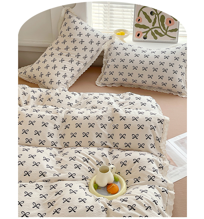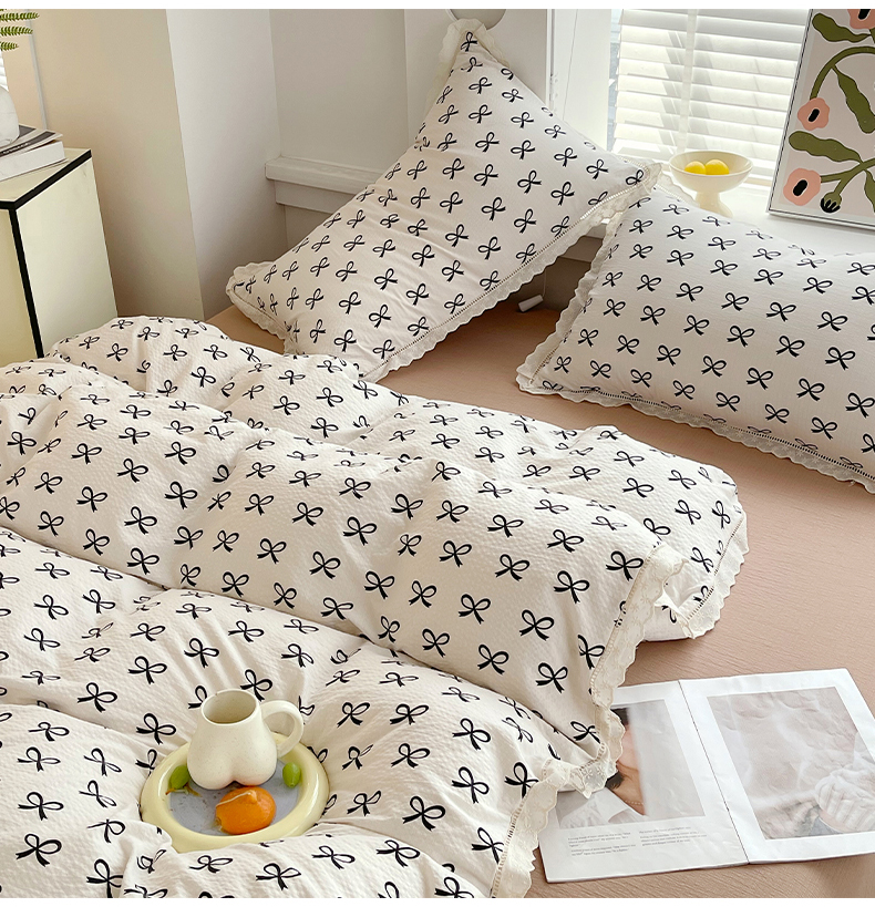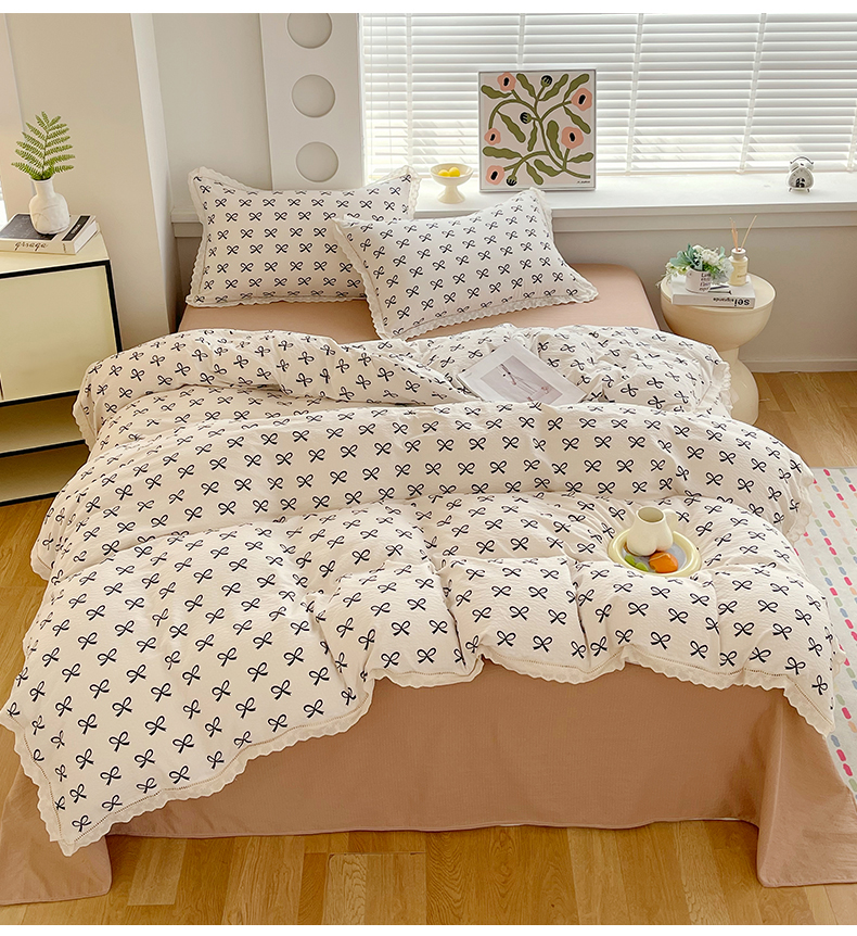 雨彤家纺 2025新款A类高克重云感皱皱双层纱全棉镂空花边款法式四件套-床拍图 相伴-米